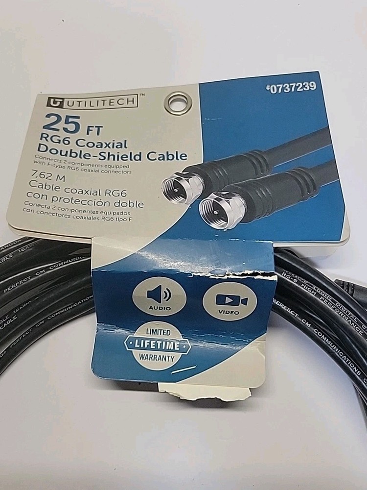 The 25ft RG-6 Coaxial Cable is designed for use with satellite, cable TV, HDTV, and stereo TV systems. With a 75 Ohm impedance, this black cable provides high-quality signal transmission. It features a coaxial F Male connector on one end, making it compatible with a wide range of devices. Perfect for setting up your TV and video equipment, this cable ensures reliable and clear signal processing for a seamless viewing experience.