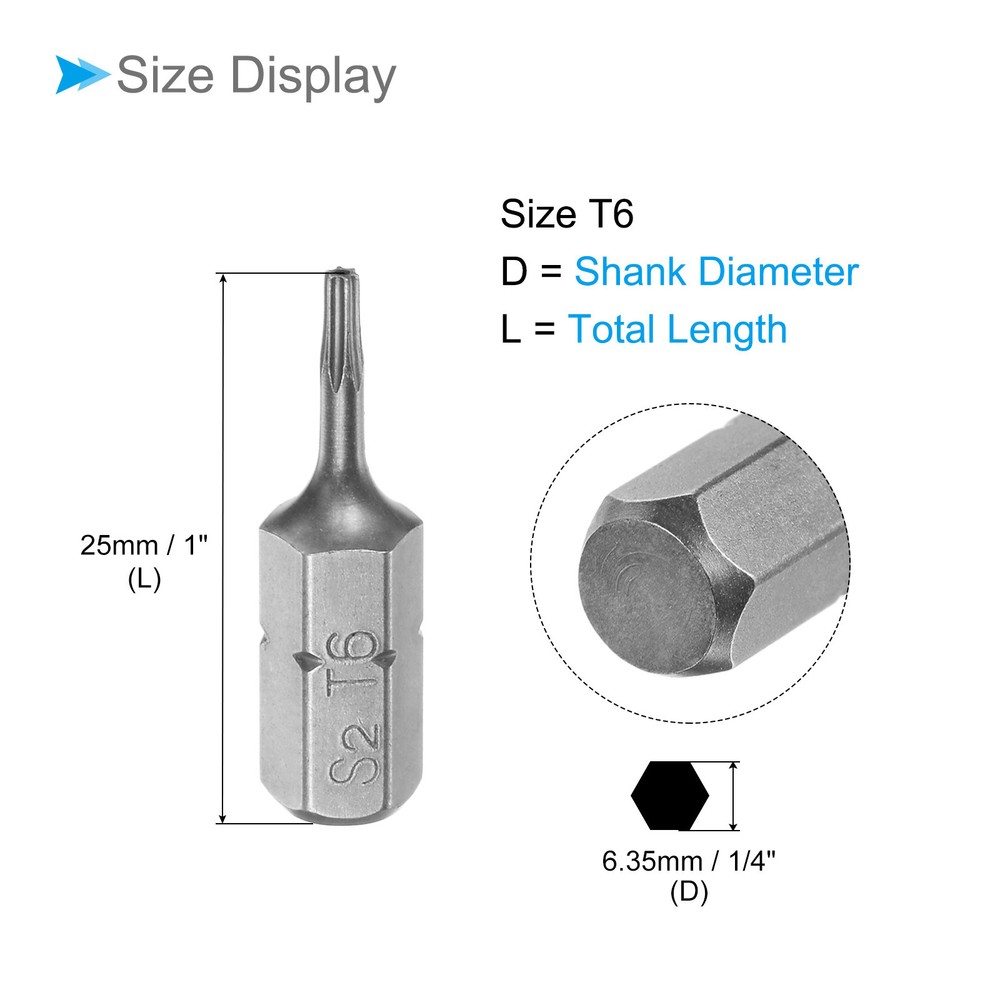 Document Attributes:* Shank Size: 1/4"* Total Length: 25mm / 1"* Bit Type: T6* Material: S2 SteelWhat Is Included:* 25 Piece x Torx Screwdriver BitApplications & Features:--- Those bits fit for electric screwdrivers, hand screwdrivers, electric drills, air drills, air batches and 1/4" screwdriver sets.--- The torx screwdriver bits are made of S2 steel, which ensures high hardness, durability and wear resistance.--- These screwdriver bits are magnetic, which can firmly absorb the screw to prevent it from falling off.--- The star head bits are easy to install on the screwdriver handle with double ear on the sides of the bit shank.Useful Tips:--- Please apply appropriate force. Excessive force may cause the bit to slip, while insufficient force may not effectively tighten or remove the screw. 25pcs Torx Screwdriver Bits 1/4" Hex Shank 25mm T6 Magnetic Screwdrivers Bit Attributes: * Shank Size: 1/4" * Total Length: 25mm / 1" * Bit Type: T6 * Material: S2 Steel What Is Included: * 25 Piece x Torx Screwdriver Bit Applications & Features: --- Those bits fit for electric screwdrivers, hand screwdrivers, electric drills, air drills, air batches and 1/4" screwdriver sets. --- The torx screwdriver bits are made of S2 steel, which ensures high hardness, durability and wear resistance. --- These screwdriver bits are magnetic, which can firmly absorb the screw to prevent it from falling off. --- The star head bits are easy to install on the screwdriver handle with double ear on the sides of the bit shank. Useful Tips: --- Please apply appropriate force. Excessive force may cause the bit to slip, while insufficient force may not effectively tighten or remove the screw. Hot Item Payment 1.We accept eBay payment . 2.Payment must be received within 7 business days of auction closing. Shipping 1.We ship to your eBay or Paypal address. Please make sure your eBay and Paypal address is correct before you pay. 2.Items will be shipped within 1-3 business day when we received payment. 3.Delivery time depends on destination and other factors. Description Policy 25pcs Torx Screwdriver Bits 1/4" Hex Shank 25mm T6 Magnetic Screwdrivers Bit Attributes: * Shank Size: 1/4" * Total Length: 25mm / 1" * Bit Type: T6 * Material: S2 Steel What Is Included: * 25 Piece x Torx Screwdriver Bit Applications & Features: --- Those bits fit for electric screwdrivers, hand screwdrivers, electric drills, air drills, air batches and 1/4" screwdriver sets. --- The torx screwdriver bits are made of S2 steel, which ensures high hardness, durability and wear resistance. --- These screwdriver bits are magnetic, which can firmly absorb the screw to prevent it from falling off. --- The star head bits are easy to install on the screwdriver handle with double ear on the sides of the bit shank. Useful Tips: --- Please apply appropriate force. Excessive force may cause the bit to slip, while insufficient force may not effectively tighten or remove the screw. Hot Item Payment 1.We accept eBay payment . 2.Payment must be received within 7 business days of auction closing. Shipping 1.We ship to your eBay or Paypal address. Please make sure your eBay and Paypal address is correct before you pay. 2.Items will be shipped within 1-3 business day when we received payment. 3.Delivery time depends on destination and other factors.