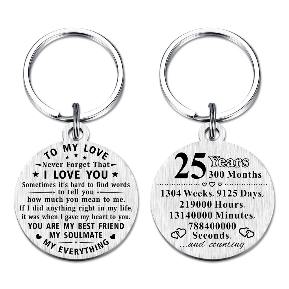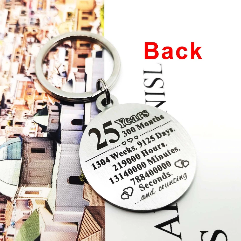 25 Year Anniversary Gifts - Congratulations! You and your spouse have made it 25 years together! This 25th wedding anniversary gifts key chain makes romantic gifts for wifey hubby women men him her 25th Wedding Anniversary Gifts, which is made of top stainless steel material and has beautiful engraving on it. Meaningful and surprise love gift, Your lover can take it wherever they go. So sweet love reminder 25th Anniversary Gifts for Him, 25th anniversary gifts for her, 25th anniversary gifts for husband, 25th wedding anniversary gifts, 25 yr anniversary gifts for men, 25 year anniversary decorations Laser Engraved Keychain - Pendant Diameter 1.4 inch; Key Ring Diameter 1.26 inch, No Rust, No Allergy, No Fading, No Deformation 25 Years Anniversary Gifts for Men, It comes with a beautiful velvet bag, Ready for giving, Any quality problems, please feel free to us. Thank you!
