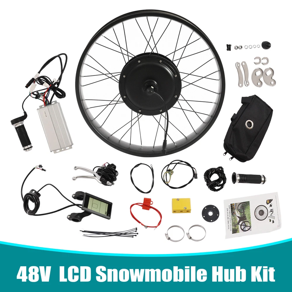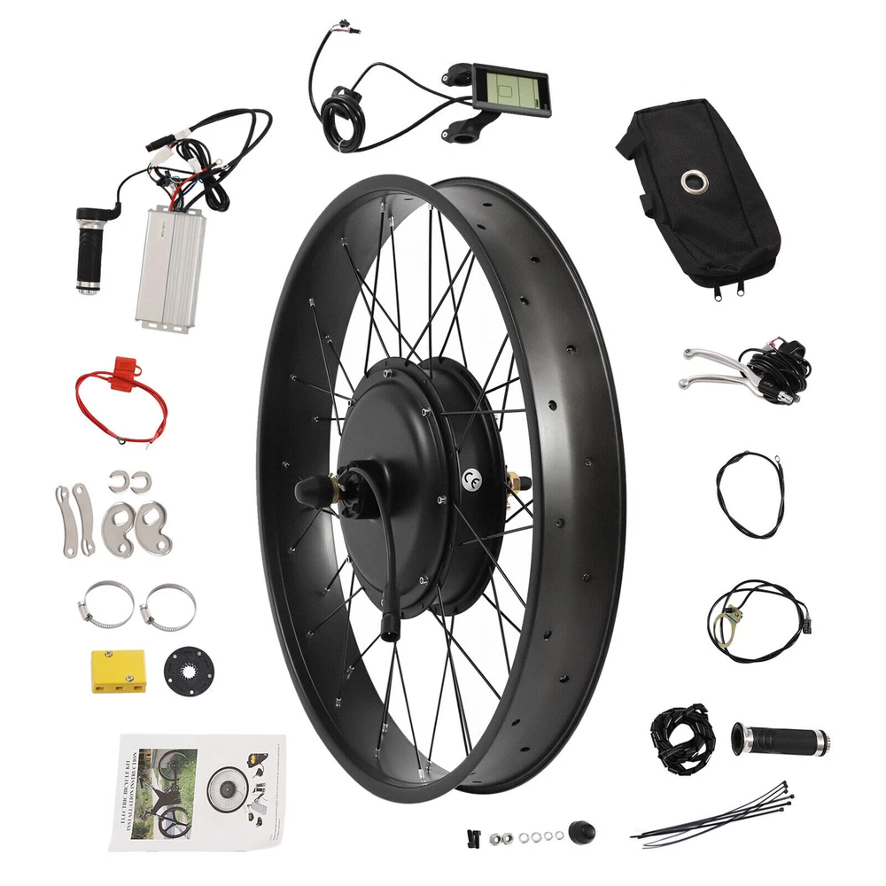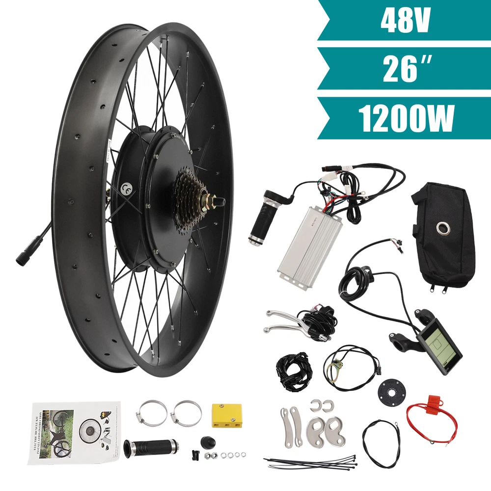 26" 1200W Fat Tire Electric Bicycle Motor LCD E-Bike Rear Wheel Conversion Kit Waterproof Conversion Kit for Electric Bike 26" Fat Rear Wheel Electric Bicycle Hub Motor Kit 1200W Electric Bike Conversion Kit Description If you can easily convert a bicycle into an electric bicycle, why spend a lot of money to buy an electric bicycle again? This electric bicycle motor conversion kit, composed of high-quality sensors and highly sensitive brake handles, is a great choice for you to refit your bike. All you need to do is transfer the original tires to the electric bike kit and enjoy your new bike! Key Features Enjoy Riding: With it, you can get rid of bicycles with pedals. Just turn the handlebar gently, and you can control the speed flexibly so that you can experience a more comfortable ride! High-speed Riding: The product is equipped with 1200W motor with 480RPM, which can provide strong power and 60km/h speed and give you a comfortable and labor-saving riding experience. Versatile Features: This product has a five-speed adjustable, and also with fixed-speed cruise function. It can bring you an unprecedented riding experience. Smooth Operation: The product is equipped with a powerful controller, which is the brain of the electric bicycle to ensure the smooth operation of other parts. It can make the riding process easier! Low Noise: Due to a brushless gearless motor, it produces low noise when riding, and can create a more comfortable riding environment for you. LCD Function: The LCD meter has a power display, speed display, mileage display, fault display, real-time voltage, and current display functions, which are very convenient for you to use. Durable Material: This product is made of high-quality aluminum, iron, copper, and magnetic steel material, which is strong, durable, and not easy to deform. Easy to Install: This kit includes a detailed manual. You just need to follow the manual steps and you can easily finish the bike conversion. It very saves your effort and mind. Customer Service: We aim to provide quality products and services. If you have any problems, please feel free to contact us. We will reply and solve the problem for you as soon as possible. Details Anti-slip Handle: Its handle has anti slip thread design, which can play a good anti-slip effect, allowing you to use it more comfortably and safely. Pedal Assistant Sensor: It senses the rhythm of the pedal and adjusts the speed of the motor accordingly. This helps on long trips and avoids wrist pain caused by constant pressure. Controller Package: This set is equipped with a controller package, which is not only very convenient to store the controller but also very good-looking. Application This electric bicycle motor conversion kit is suitable for bicycles with 26in tires. Specification Color: Black Material: Aluminum, Iron, Copper, Magnetic Steel Suspension Type: Rear Specific Uses For Product: Road Special Feature: Electric Brake Type: Power-off Brake Handle (Applicable to V Brake, Disc Brake) Power: 1200W Speed: 480 RPM Torque: 45N. M Speed: 60km/h (No-load) Suitable Bike Wheel Size: 26-inch Wheel Hub Motor Diameter: 57.3cm/ 22.56in Wheel Hub Motor Width: 7.5cm/ 3in Wheel Hub Motor Total Width: 24cm/ 9.45in Package Size: 60*60*28cm/ 23.62*23.62*11.02in Net Weight: 11.2kg/ 24.69lbs Gross Weight: 13kg/ 28.66lbs Package Included 1 * Wheel Hub Motor 1 * Controller 1 * LCD Display 1 * Handle 1 * Brake Handle 1 * Controller Package 1 * Boost Sensor 1 * Torque Arm 1* English Installation Instruction All Accessories for Assembly Notes Please note that this product is only suitable for bicycles with a tire size of 26 inches. Please note that batteries and tires are not included in this electric bicycle motor conversion kit . Please read the instruction carefully before use. Please note that riding speed is related to wheel size, road condition, battery condition, passenger load, wind speed, and other factors. Please allow the slight color difference caused by the shooting light and 1-3 cm error due to manual measurement, and make sure you do not mind before ordering. Payment Delivery details Terms of sales About us Contact us Payment We accept ebay payment 。 Fees such as import duties, taxes are not included in the item price or shipping costs. These charges are the buyer's responsibility. Delivery details Shipping: 2-9 working days to: USA Terms of sales We maintain high standards of excellence and strive for hundred percent customer satisfaction. Feedback is very important to us. We hope that you contact us immediately before you give neutral or negative feedback, so that we can address your concerns. It is impossible to address issues if we do not know about them! About us Your satis faction is our ultimate goal. We work hard to earn your trust and future business. Our certified technicians have tested each item before shipping. The unit comes with 1 year limited warranty on all manufacturing defects. a) If you receive a defective item, you may return it or ask for a discount. Please contact us within 14 days after you receive the package. b) What you returned must be intact and in its original packaging as re? u. Customer is responsible for shipping costs of the returned item. c) We will cover the cost of shipping back t with the shipping rate indicated in the registration page. We will send you a new unit or refund the full payment you paid. Thank you. Contact us Business Hour Business Hour: Monday To Friday: 8:30 AM to 5:00 PM (Beijing China time) Due to time zones, our reply to your questions may not be immediately. But within above working time, we will reply your email within 24 hours. If it's non-workdays, please kindly be patient and wait till Monday. Please contact us with ebay message. Please feel free to contact us if you have any questions. Monday To Friday: 8:30 AM to 5:00 PM (Beijing China time) Due to time zones, our reply to your questions may not be immediately. But within above working time, we will reply