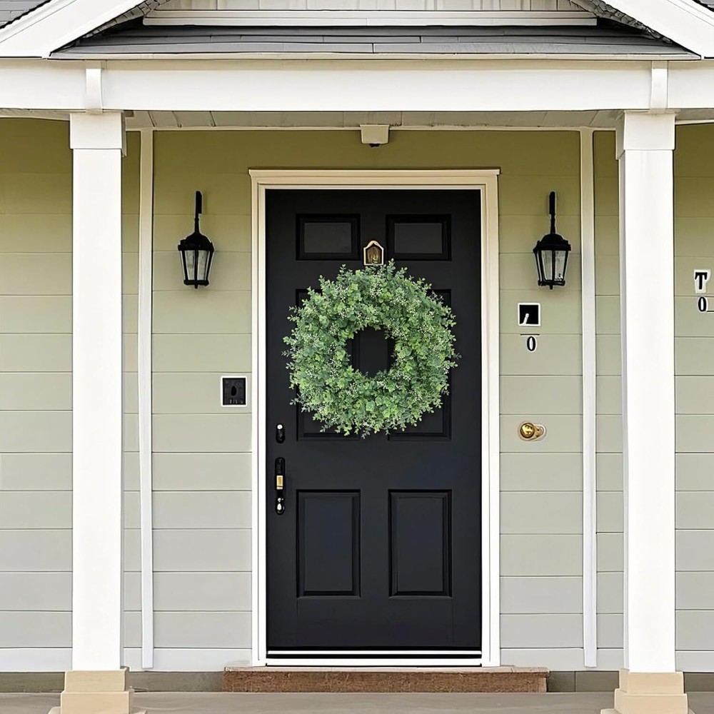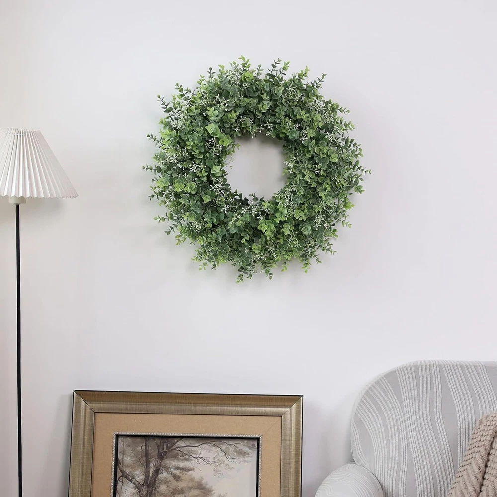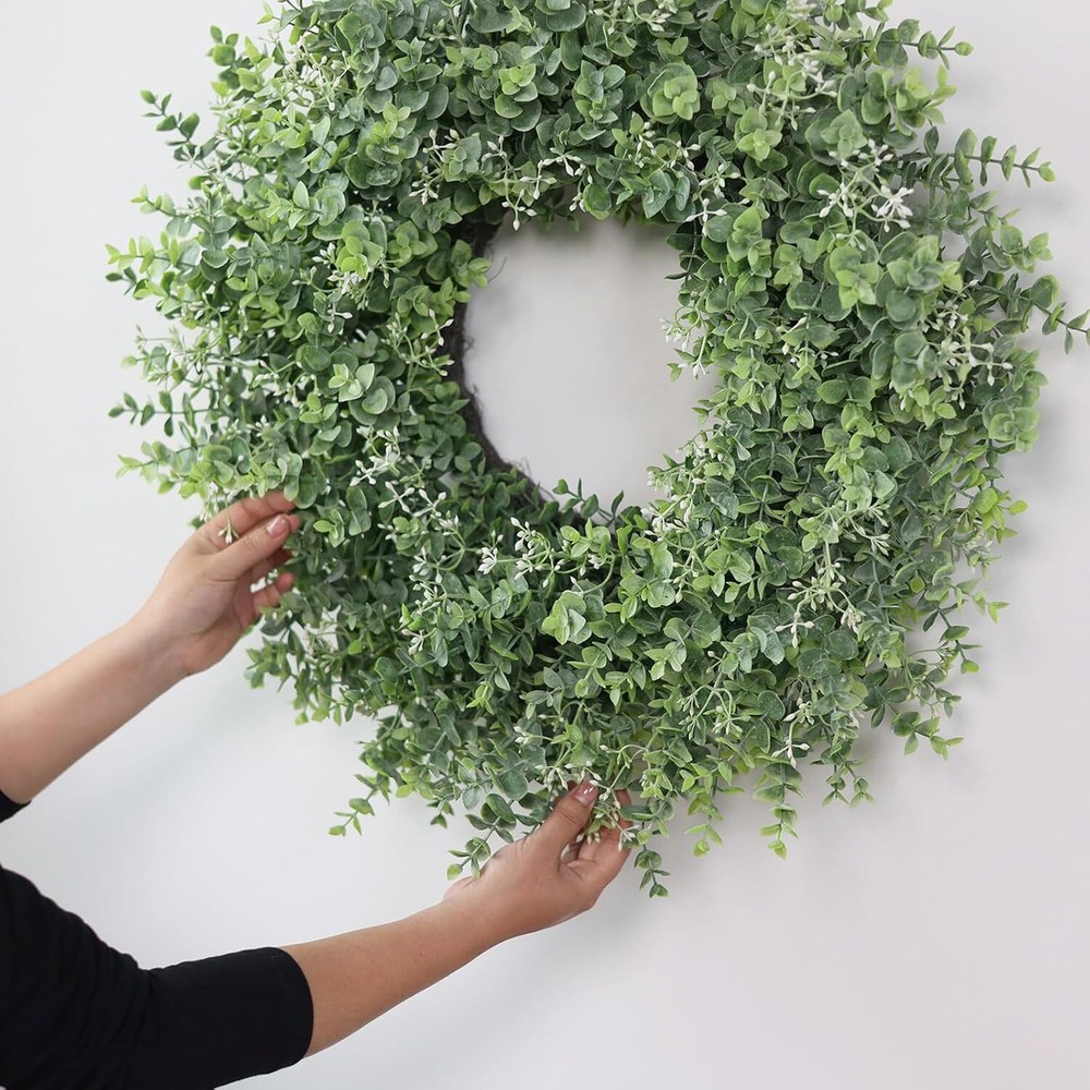 This eucalyptus wreath is absolutely stunning! The lifelike leaves and delicate white seeds make it look so fresh and natural. It’s perfect for any season and adds a touch of elegance to my front door. The quality is fantastic—wind and rain don’t bother it, and the colors stay vibrant. Highly recommend for farmhouse, porch, or window decor!