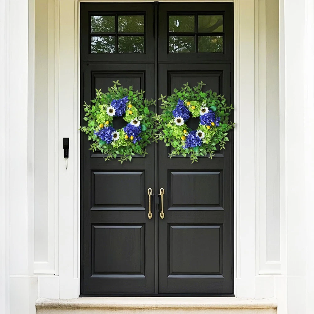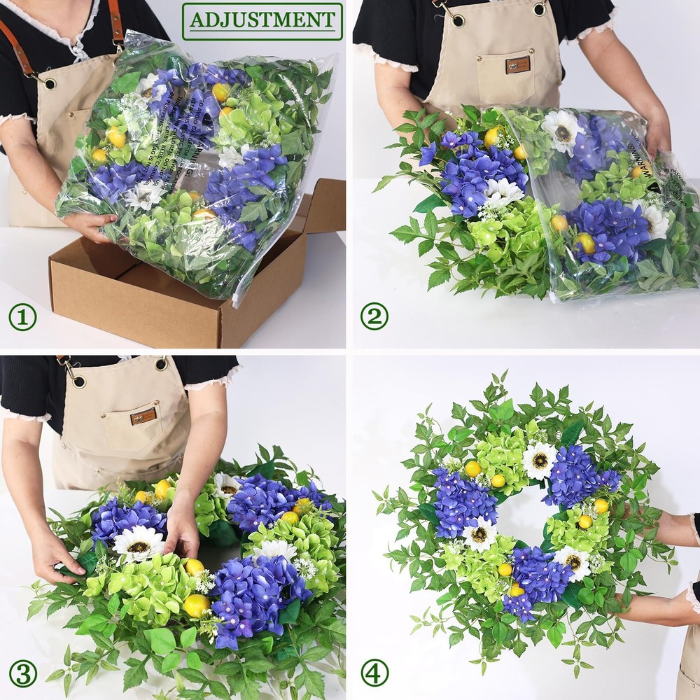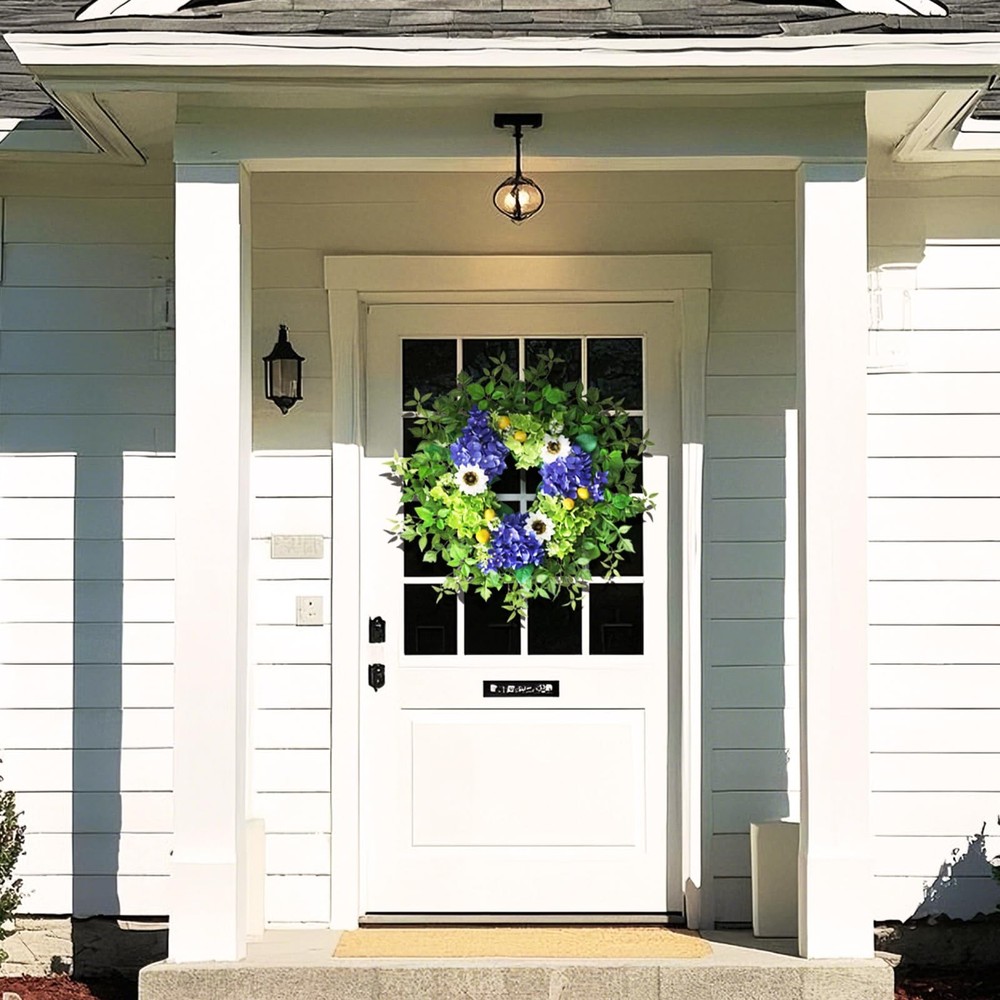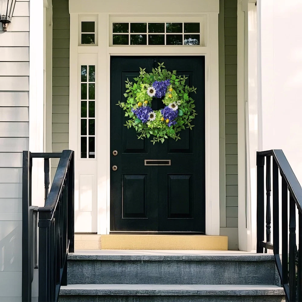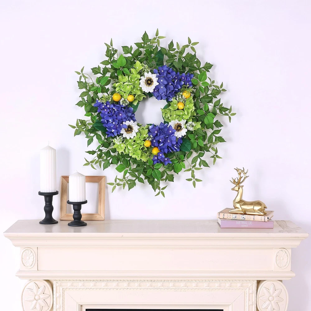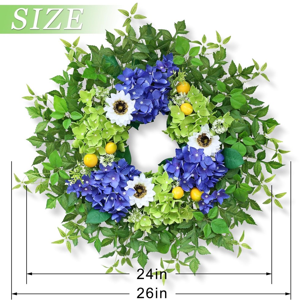 26" Hydrangea Wreath for Front Door, Porch, Window 【Full and Lifelike】 : This is a large wreath made of hydrangea, sunflower, lemon, green leaves and other berry. We used more flowers and leaves to make the wreath large and full and lifelike. 【Quality Material】 : The faux flower and leaves are made of high-quality silk, durable, wind and water resistant, fastness, suitable for indoor and outdoor decoration. 【Size】 : The diameter of the hydrangea wreath is about 24-26 inches, and it can be up to 26 inches in diameter when fully unfolded. This large wreath is very suitable for your front door decoration, it will make your door become atmospheric and beautiful. 【Versatile】: Our hydrangea wreath can be used all seasons, perfect for corridors, Windows, fireplaces, living rooms, kitchens, farmhouses, etc. It can perfectly decorate your home. It can also be used for weddings, birthday parties, Easter, Valentine's Day, Mother's Day, Thanksgiving and other holiday decorations. This hydrangea wreath will bring a pleasant atmosphere to your home. 【Tips】 : In order to better protect the wreath, we put the garland in a plastic bag and then tightly packed in a carton. You only need to easily adjust and fully unfold the stem of the leaves to obtain the best appearance and achieve a perfect display.