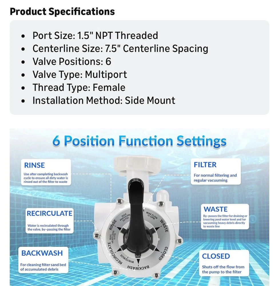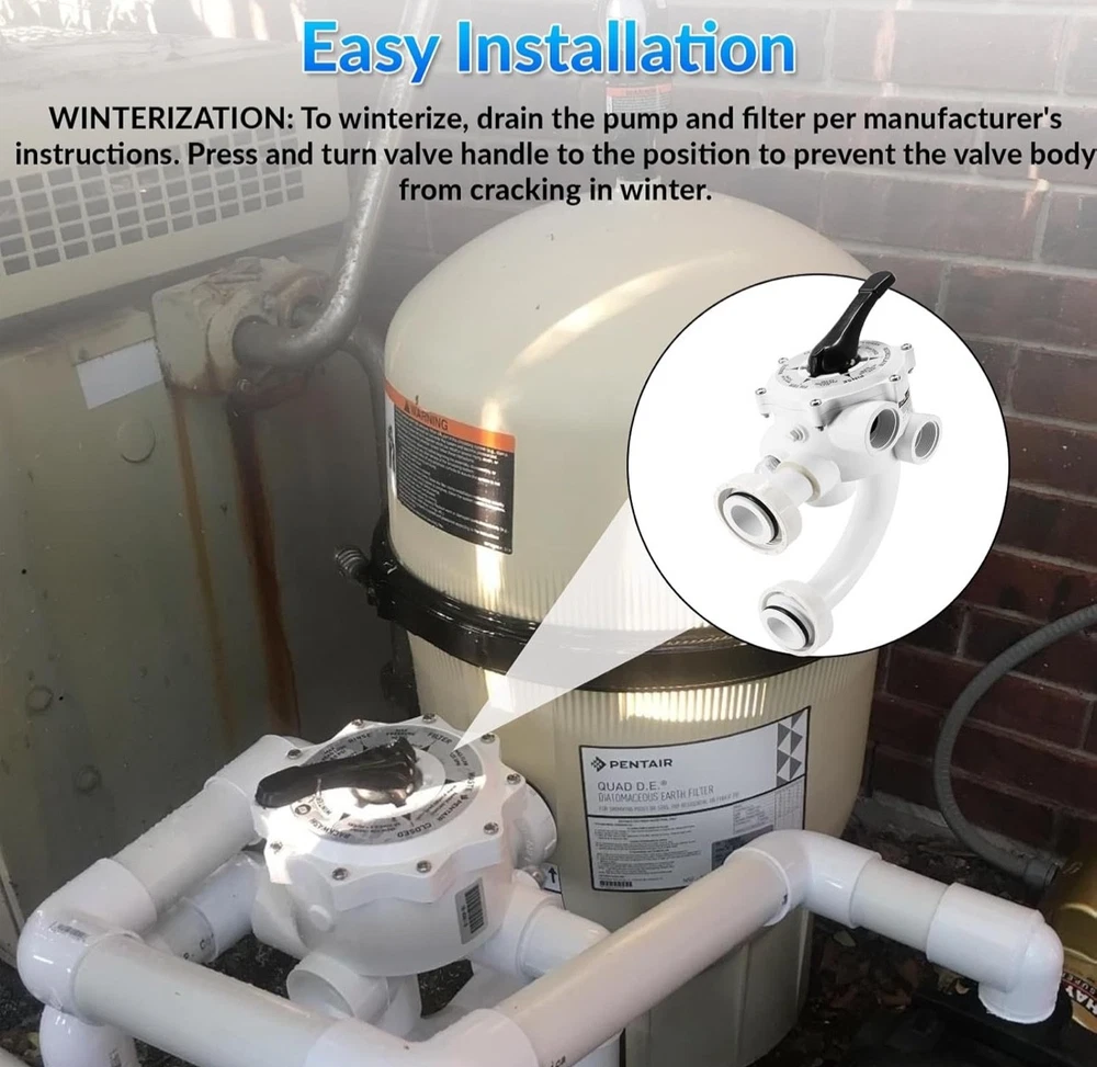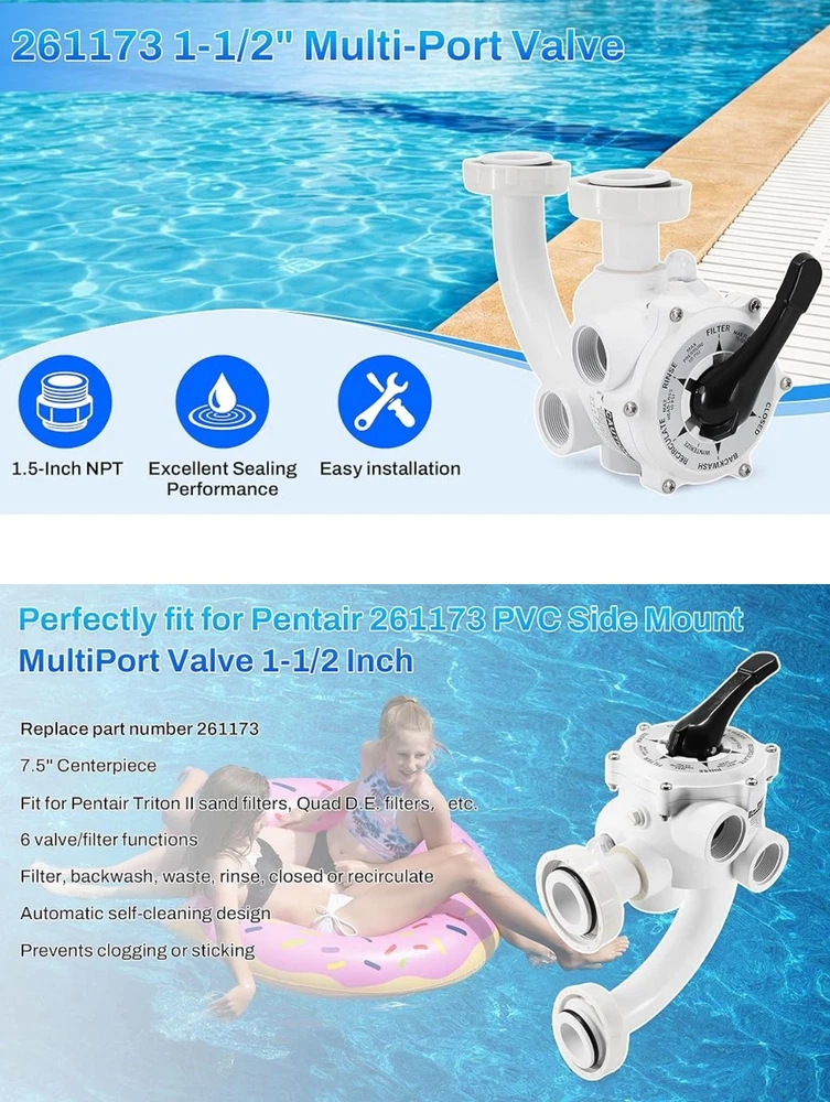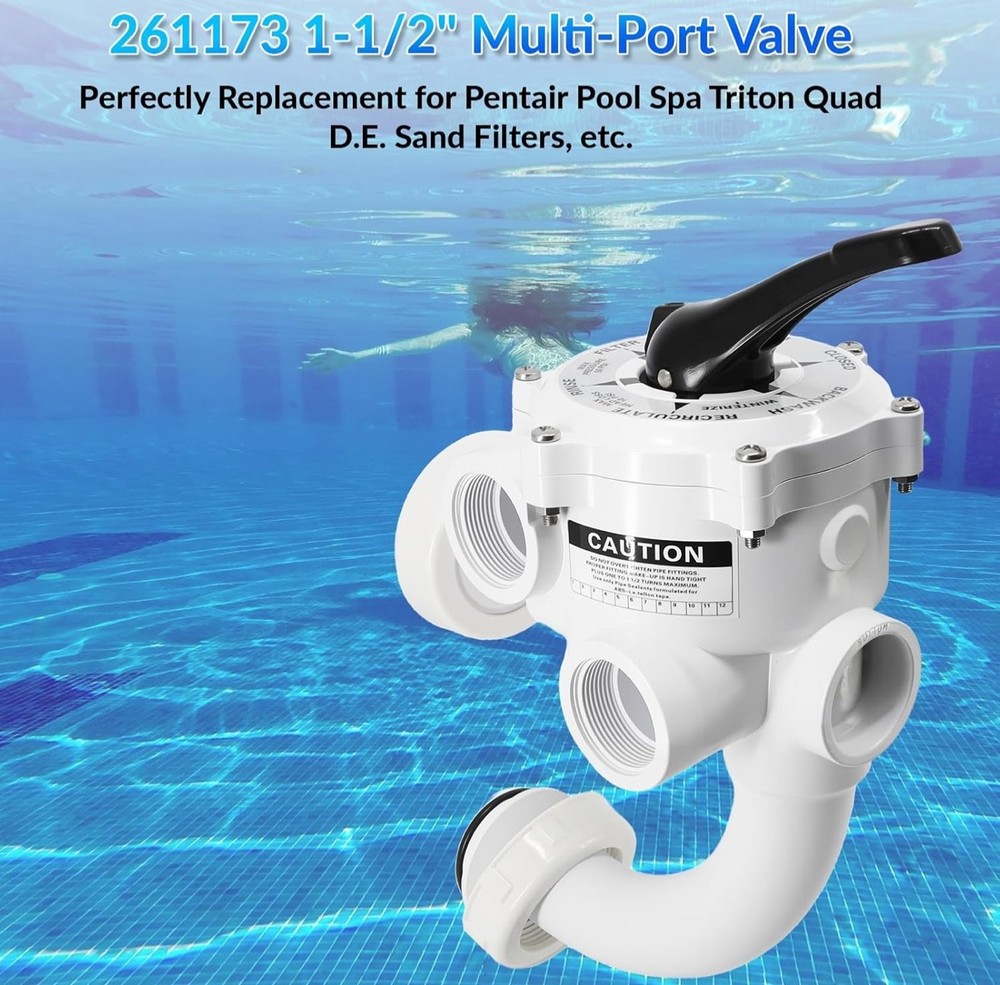 #3183 261173 1-1/2" Multiport Control Valve Replacement for Pentair Pool Spa Triton Quad D.E. Sand Filters, 1.5 inch Threaded Ports 6 Positions Side Mound Backwash Valve, Durable PVC Easy Install Material PVC Brand Gertrdti Item dimensions L x W x H 17 x 9 x 12 inches Exterior Finish Plastic Inlet Connection Size 1.5 Inches Inlet Connection Type Threaded Compatible with: 261173 1-1/2-Inch Multiport Valve Fit for Pentair Pool/Spa D.E. and Sand Filter, for Pentair clean & clear aboveground, clean & clear plus, clean & clear/predator pool and spa cartridge filters, for Pentair Warrior, EasyClean Aboveground, EasyClean, FNS Plus, SM & SMBW 4000 Series pool and spa D. E. filters Perfect 1.5 inch Port: Standard 1.5″ threaded ports and 7.5″ centerline spacing for simple installation on side-mounted filters, provides a safe and leak-free connection for your swimming pool piping system. The standard-sized port is easier to install and compatible with most existing swimming pool piping systems, ensuring a smooth and hassle-free installation process 6 Position Settings: This 261173 high flow and multiport valves design provides maximum performance and superior flow at lower pressure drops. Ergonomic easy-to-use lever-action handle for simple dialing of 6 positions that Filter, Backwash, Rinse, Waste, Closed and Recirculate. Built-in sight glass for convenient backwash viewing to ensure the backwash is done Superior Quality: The 261173 side mount control valve features a high-strength reinforced thermoplastic PVC housing molded by injection molding, which is robust and durable, resistant to impact, deformation, corrosion, and aging. It offers excellent sealing performance with no leakage, ensuring all-weather performance and long-term reliability. The high-quality injection-molded valve key components are equipped with injection-molded seals to ensure consistent and reliable sealing performance Easy Installation: 261173 features complete multiport valve and a 1.5" plumbing connection size to easily connect to existing infrastructure. Easy installation and a centerline mount for quick access and easy maintenance. Perfect for DIY enthusiasts or professional pool techs. WINTERIZATION: To winterize, drain the pump and filter per manufacturer's instructions. Press and turn valve handle to the position to prevent the valve body from cracking in winter What's in the box 261173 1-1/2" MultiPort Valve