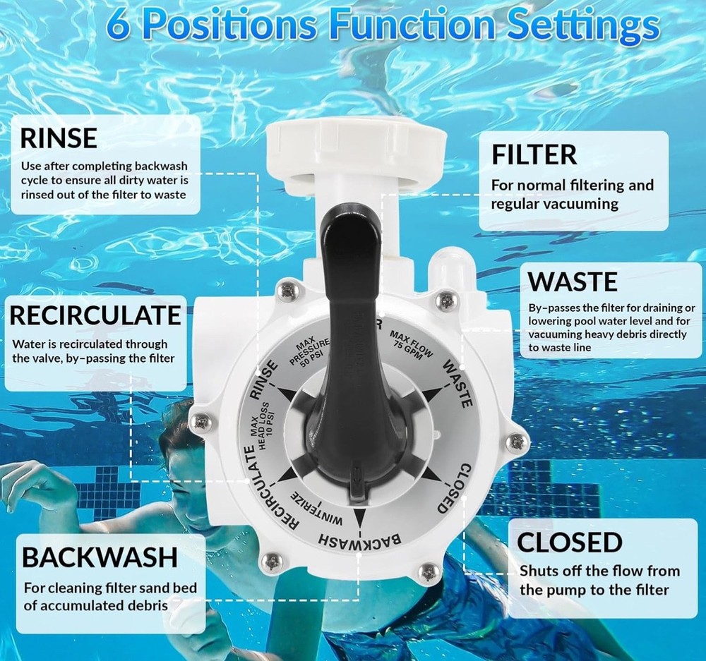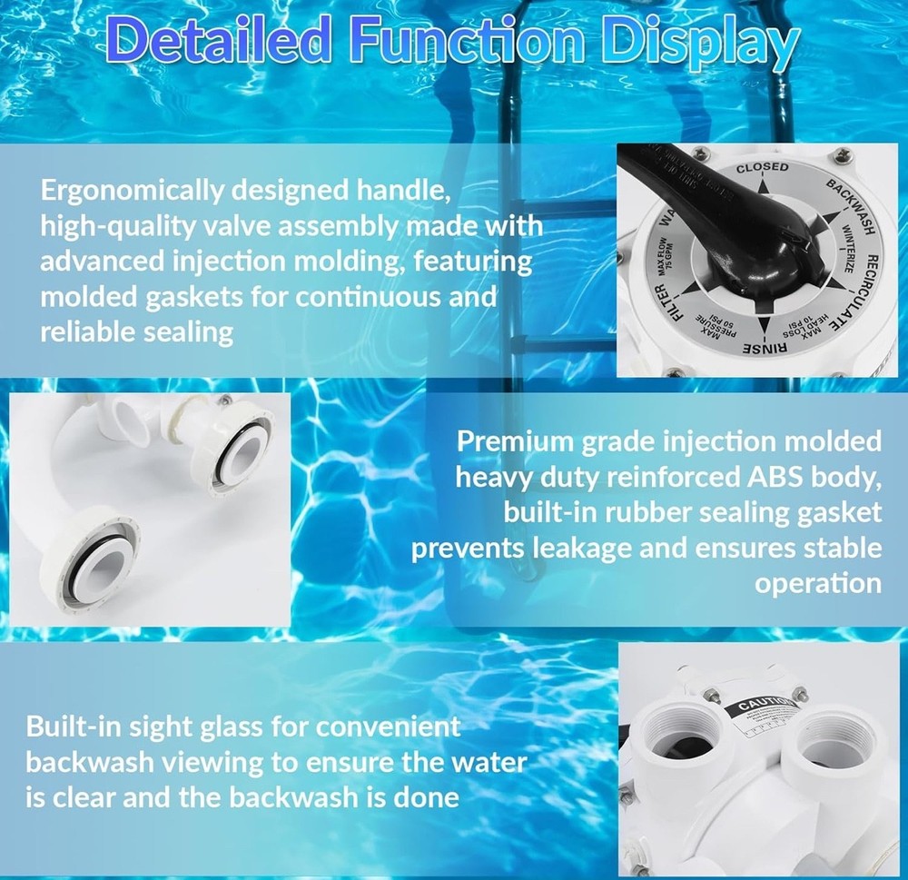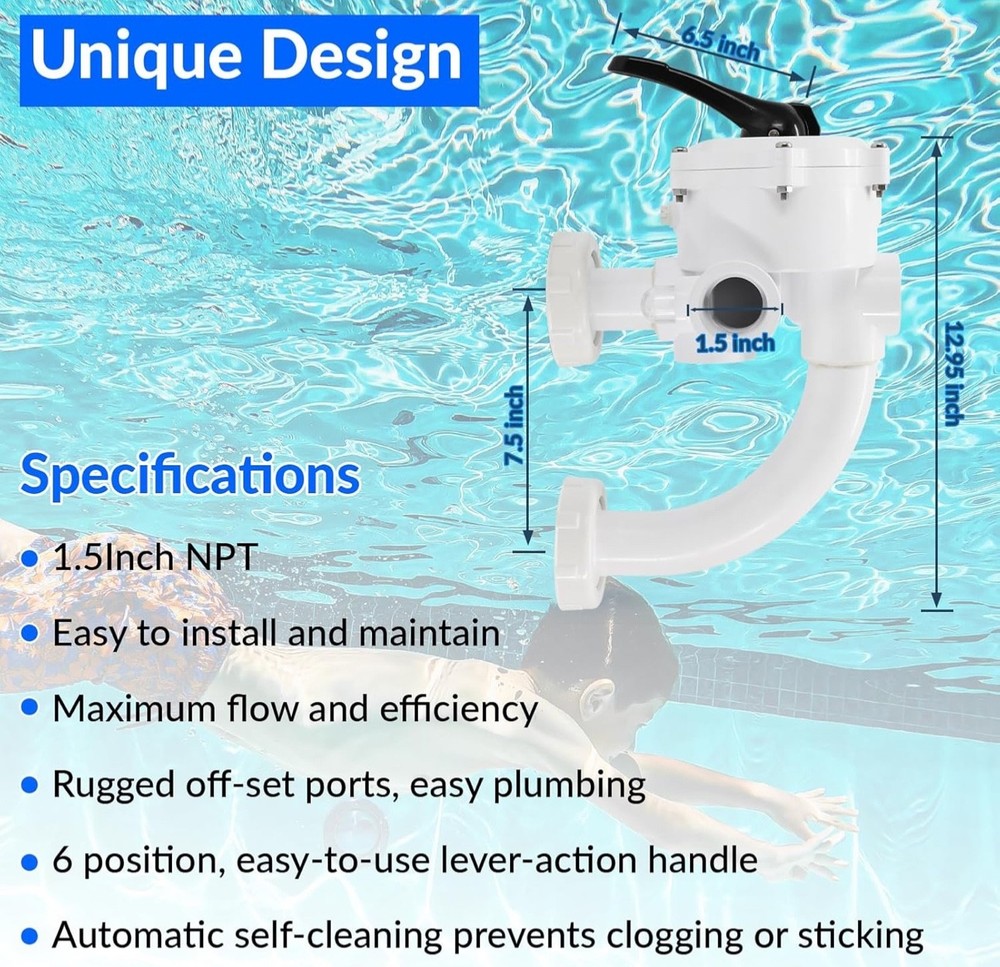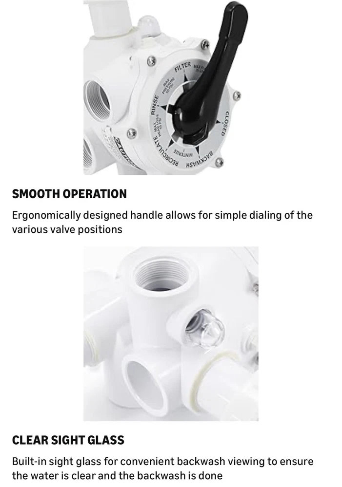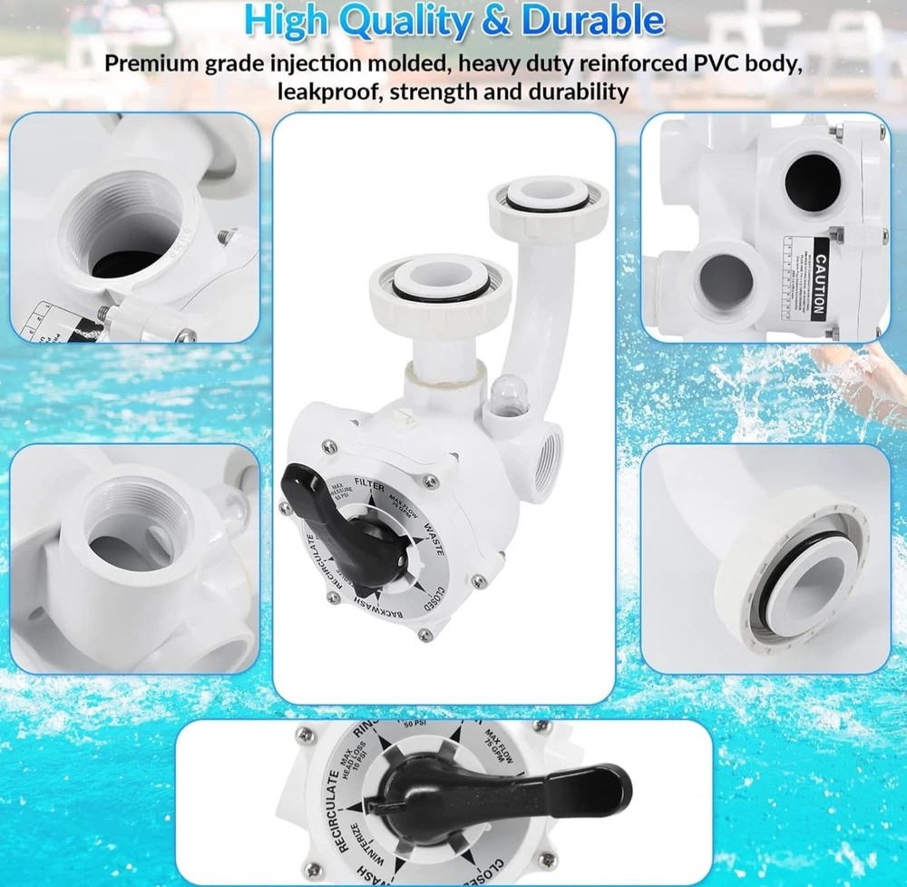 #3183 261173 1-1/2" Multiport Control Valve Replacement for Pentair Pool Spa Triton Quad D.E. Sand Filters, 1.5 inch Threaded Ports 6 Positions Side Mound Backwash Valve, Durable PVC Easy Install Material PVC Brand Gertrdti Item dimensions L x W x H 17 x 9 x 12 inches Exterior Finish Plastic Inlet Connection Size 1.5 Inches Inlet Connection Type Threaded Compatible with: 261173 1-1/2-Inch Multiport Valve Fit for Pentair Pool/Spa D.E. and Sand Filter, for Pentair clean & clear aboveground, clean & clear plus, clean & clear/predator pool and spa cartridge filters, for Pentair Warrior, EasyClean Aboveground, EasyClean, FNS Plus, SM & SMBW 4000 Series pool and spa D. E. filters Perfect 1.5 inch Port: Standard 1.5″ threaded ports and 7.5″ centerline spacing for simple installation on side-mounted filters, provides a safe and leak-free connection for your swimming pool piping system. The standard-sized port is easier to install and compatible with most existing swimming pool piping systems, ensuring a smooth and hassle-free installation process 6 Position Settings: This 261173 high flow and multiport valves design provides maximum performance and superior flow at lower pressure drops. Ergonomic easy-to-use lever-action handle for simple dialing of 6 positions that Filter, Backwash, Rinse, Waste, Closed and Recirculate. Built-in sight glass for convenient backwash viewing to ensure the backwash is done Superior Quality: The 261173 side mount control valve features a high-strength reinforced thermoplastic PVC housing molded by injection molding, which is robust and durable, resistant to impact, deformation, corrosion, and aging. It offers excellent sealing performance with no leakage, ensuring all-weather performance and long-term reliability. The high-quality injection-molded valve key components are equipped with injection-molded seals to ensure consistent and reliable sealing performance Easy Installation: 261173 features complete multiport valve and a 1.5" plumbing connection size to easily connect to existing infrastructure. Easy installation and a centerline mount for quick access and easy maintenance. Perfect for DIY enthusiasts or professional pool techs. WINTERIZATION: To winterize, drain the pump and filter per manufacturer's instructions. Press and turn valve handle to the position to prevent the valve body from cracking in winter What's in the box 261173 1-1/2" MultiPort Valve