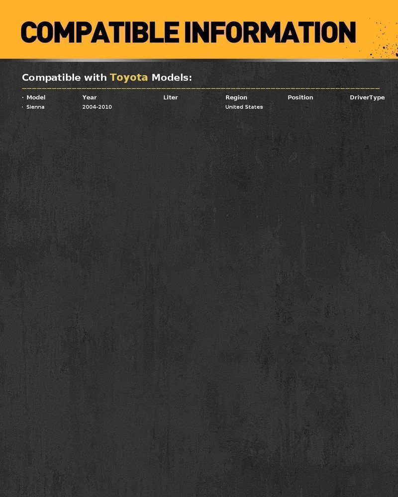 About this item 🚘Vehicle Compatibility: Power steering rack and pinion system fit for Sienna 2004-2010. 3-year warranty and 24-hour best service. 🚘OE-Quality: Brand new complete rack and pinion unit replace OE part number# 26-2619, 262619, 4425008040, 4425008041, 4550309250. Power steering rack and pinion manufactured to OE specifications, strict factory test match the fit form and function of the factory design. 🚘Superior Performance: The core and important parts of the power steering rack and pinion are made of chrome-plated alloy steel and aviation aluminum alloy, which have extremely resistance to wear and tear, corrosion and durability. Ensuring no gap in the rack and pinion even after prolonged use NO Noise & Vibration. 🚘Upgraded Seals: Adopts corrosion-resistant oil seals and lip seals, butyl rubber sealing cover. 360°Dust boot full protection effectively prevents dust and mud from entering the rack and pinion inside causing wear, ensuring longer service life. Working normally for a long time even under extreme conditions. 🚘Easy Installation: The power steering rack and pinion ISO/TS 16949 quality. Strict hydraulic pressure tested to ensure stable high and low pressure without leakage. Plug-and-play, perfect match with your model. 5-year warranty and 24-hour service. Product Description: Steering gear,also called steering gear, is the most important part of automobile steering system.Power steering (PAS) or steering assist system helps drivers steer by augmenting steering effort of the steering wheel. Power steering rack and pinion is the most important part for vehicle swerving and security assurance. It converts the rotational motion of the steering wheel into the linear motion needed to turn the wheels and provides a gear reduction,thus making it easier to turn the wheels. Features & Details 【SUPERIOR PERFORMANCE】 - The steering rack solves abnormal noise and oil leakage problems, ensures that the steering wheel rotation angle is proportional to the tire rotation angle, and reduces the steering wheel's control force when turning, which makes driving safer. 【DUAL-FUNCTION AVAILABLE】 - There are two functions this power steering rack and pinion unit can provide. Firstly, it is able to convert the rotational motion of the steering wheel into the linear motion needed to turn the wheels. Secondly, this unit could make a gear reduction, thus making it easier to turn the wheels. 【HIGH-QUALITY MATERIAL】 - This vehicle steering rack pinion is made of sturdy steel and aluminum alloy with anti-wear and scratch-proof quality. We put moderate lubricating oil into this assembly so that it can prevent rust and oxidation. 【CONSIDERATE DETAILS】 - Along with durable shafts, hydraulic lines, steel clamps, and rubber bellow boots, the steering rack unit is quick and easy to assemble that you don't need any adjustments. Before its delivery, it was tested to meet or exceed OEM specifications. Part Number 26-2619 Fitment MAKE MODEL YEAR RANGE SPECIFIC DETAILS POWER STEERING For toyota SIENNA 2004-2010 YES Kit Includes: 1x Power Steering Rack and Pinion Assembly Key Features: High-quality replacement:Power steering rack and pinion This part may also be known as:Power steering (PAS) or steering assist system 100% tested For reliability and performance. Not rebuilt or remanufactured Top performance For long service life Undergone strict tests to ensure reliable performance Air Tested to Ensure Reliable Performance Hydraulically Tested to Ensure Internal By-Pass for Both High and Low Pressures Road simulated for proper functioning Simple installation and and long life as a guarantee Backed by satisfying after-sales service 5 Years warranty Note: In order to ensure the normal operation of the steering gear, relevant parts shall be cleaned as much as possible before installation. 1.In order to avoid the fault caused by the dirt entering the steering oil circuit, the plug on each oil port of steering pump of steering gear shall be opened before connecting the oil pipe, and the oil pipe and plug shall be carefully cleaned and deburred. 2. Turn the steering wheel to the straight ahead position. 3. Clean the mounting bracket of the steering gear and relevant mating surfaces of the steering gear. 4. For the adjustable steering column, use a suitable rope to pass through the space of the cross fork of the steering shaft, hang the steering shaft, and connect the steering shaft and the input shaft of the steering gear. 5. Turn the steering gear to the middle position to align the relevant marks at the input end and output end of the steering gear. 6. Install the steering gear on the mounting base and tighten the fixing bolts. 7. Universal joint or coupling between mounting column and steering gear. 8. For the adjustable steering column, the upper end seal of the steering gear shall not be damaged when the universal joint is installed. 9. Keep the steering wheel in straight ahead position. 10. Put the pitman arm on the steering gear to align the two marks. 10. Tighten the locknut according to the specified torque and rivet (anti loose pit) How to Replace a Power Steering Rack 1.Drain the power steering fluid, loosen the front wheel nuts and jack up the car. Once the vehicle is properly supported on the jack stands, remove the front wheel lug nuts and the wheels. 2.Disconnect the tie rods Detach the clamps connecting the steering column to the piston. Disconnect the outer rod ends using a special tie rod separator or ball joint fork. Loosen the nuts and turn the rods. 3.Remove the faulty steering rack Insert a drainage pan under the car to catch any fluid and unbolt the power steering rack from its seating. Remove the rack via one of the wheel wells. Use plenty of effort, patience and ingenuity. 4.Install the new power steering rack Using the same exit point as your entry point, insert the replacement rack into position using the required force. Measure the length of the old rack to d