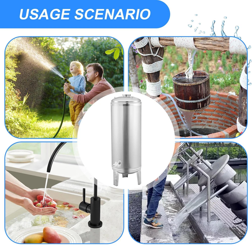 Store category Sign Up Now ! You may also like Product Description Bullet Points: Heavy duty stainless steel: Built to withstand extreme temperatures from -60 to 60 , this heavy-duty stainless steel well pressure tank is odorless and environmentally friendly. Can withstand 6kg pressure: Withstanding pressure levels up to 6kg, features an automatic discharge port, and includes a convenient cleaning port for easy maintenance. Its robust construction ensures a steady work pressure within 3kg. Improved Water Output: Our stainless steel well pressure tank helps in boosting low well water pressure, increasing water flow, and improving water supply efficiency, providing uninterrupted and reliable water flow. Automated Water Functioning: Experience uninterrupted water supply with our stainless steel well pressure tank. Its pneumatic supply principle enables automatic pumping and cessation when water decreases and fills up respectively. Flexible Water Storage: This stainless steel well pressure tank provides a versatile solution for all your home's water needs, from pumping well water and pressurized tap water to industrial cleaning. With high and low temperature resistance, automatic discharge port, and automatic stop when full, this tank ensures optimal performance and durability. Product material: stainless steel Product model: 100L Product size: 40x90cm/15.75x35.43 inches Product applicability: schools, factories, households, irrigation Product List: 100L stainless steel pressure tank * 1pcs Pressure on-off * 1pcs Pressure gauge * 1pcs Safety controller * 1pcs 2-in-1 air replenishment check controller * 1pcs Sewage outlet elbow * 1pcs Straps * 2pcs Water outlet joint * 1pcs Water outlet ball controller * 1pcs Sewage outlet ball controller * 1pcs Payment Delivery details Terms of sales About us Feedback & DSRs Shipping 1. We only ship to United States 2. Delivery Time: Ship from US via FedEx Ground or FedEx Home Delivery 1-5 business days with tracking number. 3. We ship the item out in 24-72 hours after received the payment.(Mon-Fri) 4. If you want to chose another address, please leave us a message on ebay.Please check your shipping address carefully before checkout,it can't be changed if order completed. Seriously promise:Refund or resend will be offered if item still not arrive in 7-10 business days. Just send us an email,we will give you a satisfied solution as soon as possible. Payment 1. We accept PayPal only. 2. After you have won the auction, an email will be sent to your eBay registered email address. 3. If you are paying through Paypal using eCheck, note that your item can be shipped only after eCheck has cleared. 4. All payments are expected within 7 days after the last winning auction is closed. A non-payment dispute will be opened if full payment is not received. 5. We only ship the item to your Paypal address for fast and accurate shipment. If you want to change the address, please add a note when you make the payment. after you have paid. Return & Warranty 1. For your best shopping experience in our store and saving your time .Please Do Not click "Return this item" except that you just don't need it any more.Because no return request is our company's Service. Please click "Contact seller" via Ebay Message(protected by Ebay),that is the fastest way to solve any problem for you.You will get the replacement or refund through the communication between us. 2. We fully guarantee Customers benefit within 14 business days if item DOA (damage on arrival), and please contact us within 30 days from the delivery date to exchange or refund.No need return just contact us. Refunds will be given via paypal only. 3. For malfunction products under warranty period, please contact our customer service via EBay Message. Replacements will be sent once after we have a fully communication.No need return the original one after we have fully communication. 4. The buyer has an obligation to cooperate with seller to verify defective item. If you want return, please double check if the item does not work or you just don't need it any more. If the item defective or no work, no need return. 5. All NON-Seller Mistake returns for refund are subject to 20% re-stocking fee and buyer should pay for the return shipping fee and handle fee.(For example,you brought wrong item or cancelled order after item was shipped). 6. A Merchandise Authorization Number (RMA#) is required for all need returned packages(After we have a fully communication). Please contact us to get an "RMA" number before you ship your items back to us. Items returned without an "RMA" number would be ignored or delayed in processing.Returns/Exchanges will not be accepted unless authorization has been issued by our customer service. 7. All return products should be in original package with all accessories included. Contact US Dear buyers, Welcome to our store! Your satisfaction is our top goal,we appreciate your business. 1. If you have any questions, please feel free to contact with us by ebay Message during our business hours ( 9:30a.m. to 5:30 p.m.), or email us through eBay, we will try our best to help you to resolve it. 2. If you are satisfied with our service, please rate the details of the transaction (Detailed Seller Ratings) on eBay and We will do the same for you. 3. If you are not satisfied with the product or service ,please contact us before leave negative or natural feedback, we will try our best to solve the issue to your satisfaction, thanks. Thanks for your patronizing, good luck !!