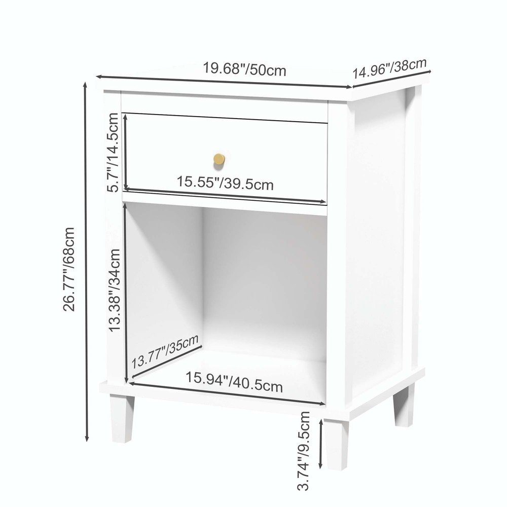 26.77''H Wooden Nightstand with One Drawer One Shelf for Kids, Adults Product Features 1. Comprises high-quality MDF and aluminum handles that contribute to its sturdy construction. 2. Available in a variety of pretty colors to add a fun style to your children's bedroom. 3. The top surface and shelf can hold up to 40 lbs, and the drawer can hold 15 lbs. 4. Setup is very easy and all the required accessories are included. 5. Spacious storage space for lamps, books, toys, etc.Features Material: MDF Package number :1 Assembly Required About :10 minNotes 1.Manual measurement has been used, there may be some reasonable errort, thanks for your understanding. 2.Due to factors such as display equipment and shooting environment, the color of the item may be slightly different from the Free Shipping Over $49.99* Details 26.77''H Wooden Nightstand with Drawer and Shelf for Bedroom Product Description: 26.77''H Wooden Nightstand with One Drawer One Shelf for Kids, Adults Product Features 1. Comprises high-quality MDF and aluminum handles that contribute to its sturdy construction. 2. Available in a variety of pretty colors to add a fun style to your children's bedroom. 3. The top surface and shelf can hold up to 40 lbs, and the drawer can hold 15 lbs. 4. Setup is very easy and all the required accessories are included. 5. Spacious storage space for lamps, books, toys, etc. Features MaterialMDF Package number :1 Assembly Required About :10 min Notes 1.Manual measurement has been used, there may be some reasonable errort, thanks for your understanding. 2.Due to factors such as display equipment and shooting environment, the color of the item may be slightly different from the picture, which is a normal phenomenon, please refer to the actual item 3.Improper use of screws may cause the product surface damage! Please be careful when installing. 4.It is recommended to put a layer of foam or soft cushion on the floor when installing to avoid scratching the floor. 5.If the item has any defects, damage or missing parts, please contact us with pictures or videos so that we can understand your needs and help you quickly, and always remember to retain its original packaging to ensure any return requests. We will try our best to solve any problems you may have. 6.If you receive the wrong product, please attach the product picture, the infographic of the outer package and the picture containing SKUs, so that we can verify and quickly deal with it for you Maintenance & Notice About Finish:Liquids should be immediately blotted with a damp cloth. Do not use surface cleaners that could remove the finish. About Hardware:Hardware may loosen over time; periodically check to make sure all connections are tight. About Fasteners:Don't over-tighten fasteners, as this may cause distortion or breakage. About Color:Real Product's Color may be a little different from the image due to the lighting or monitor's display. About Size:Manual measurement has been used, there may be some reasonable error.