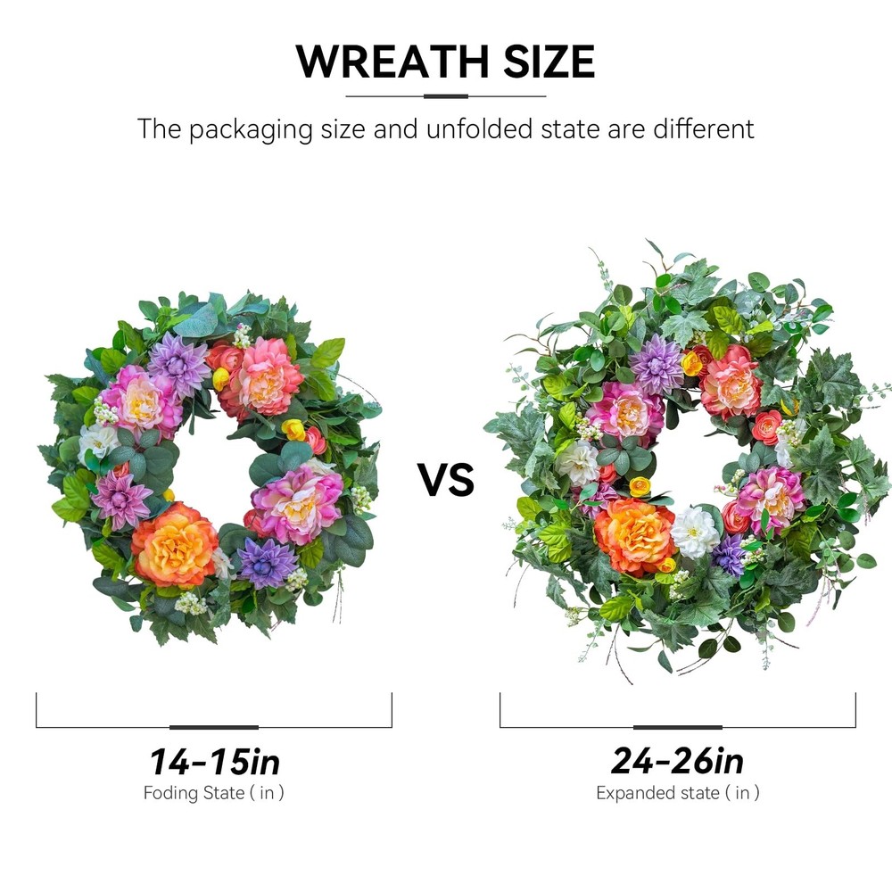 Spring Wreath 26 Inch Spring Wreaths for Front Door with Peony, Dahlia, and Rose, Beautiful Summer Door Wreath for Indoor and Outdoor Decor Product Details Color: Purple Brand: wreathqueen MPN: WSP004 UPC: Does not apply EAN: Does not apply Color: Purple Brand: wreathqueen Material: Silk Mounting Type: Door Mount Shape: Round Product Dimensions: 5"D x 26"W x 26"H Seasons: Spring Manufacturer: wreathqueen Indoor/Outdoor Usage: Outdoor Color: Purple Brand: wreathqueen Material: Silk Mounting Type: Door Mount Shape: Round Product Dimensions: 5"D x 26"W x 26"H Seasons: Spring Manufacturer: wreathqueen Indoor/Outdoor Usage: Outdoor Item Weight: 1.85 pounds Country of Origin: China Item model number: WSP004 Date First Available: December 5, 2024 Vibrant Spring and Summer Design This floral wreath features lifelike pink peonies, elegant purple dahlias, stunning red and white roses, and cheerful yellow mini roses. Perfect as a spring wreath or summer wreath for your front door, it adds charm and seasonal beauty to your space. Seasonal Versatility Whether you're searching for a spring wreath for front door or a summer wreath for front door, this design complements all your seasonal decorations, indoors or outdoors. Its a perfect addition to your all-season wreath for front door collection. Durable and Weatherproof Designed as an outdoor wreath, its crafted with premium silk flowers, making it a weatherproof outdoor wreath for all seasons, including spring and summer. Versatile Front Door and Indoor Use Measuring 26 inches in diameter, this wreath for front door fits perfectly on doors, walls, fireplaces, or as a centerpiece. Its an excellent choice for indoor wreaths, farmhouse settings, or as an all-season wreath. Perfect Gift for All Occasions Whether you need a spring wreath for front door, a decorative wreath for birthdays, weddings, or housewarmings, or a year-round wreath, this floral piece is the ultimate thoughtful gift option. Easy To Adjust To prevent the wreaths for front door from being damaged during transportation,the big spring wreath packed tightly in a sturdy 14 inch box.So before hanging, please refer to product instruction card to adjust the fluffiness of the grapevine wreath between to make it look fuller and more beautiful ! Excellent Customer Services Artificial valentine wreath decor don't need special cleaning, just wipe them with a dry cloth to keep them clean.Any problem in the process of use, please contact us in time, we will give you a satisfactory answer at the first time!
