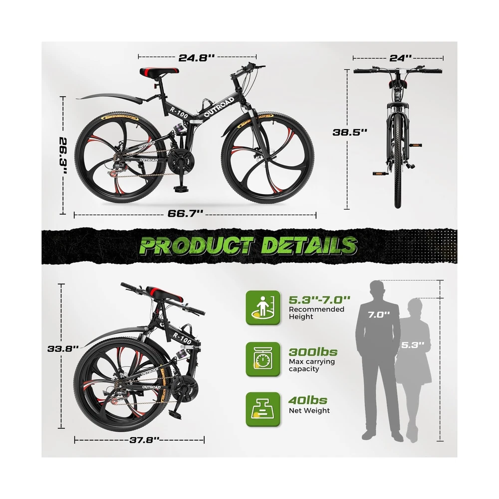 26 Inch Adult Folding Mountain Bike, 21 Speed Foldable Bicycle with Full Suspension, Dual Disc Brake, High Carbon Steel Frame, Folding Bikes for Men/Women/Teen Description Features: Rapid Folding CapabilityWith its quick-folding mechanism, this foldable bike effortlessly collapses within seconds to a compact size of 33"x38", facilitating easy transportation and storage wherever you go. Aerodynamic EfficiencyFeaturing 6-spoke magnesium alloy wheels, PanAme folding bike ensures superior aerodynamics and strength compared to traditional spoke wheels, enhancing speed and durability on any terrain. Enhanced ComfortFeatures front and rear dual suspension systems and an ergonomically adjustable seat extending up to 12", allowing riders to find their optimal position for maximum comfort, suitable for heights ranging from 5.3' to 6'. Precision HandlingEquipped with dual disc brakes and a 21-speed thumb shifter, this bicycle offers unparalleled control and maneuverability, ensuring a thrilling riding experience whether on rough trails or city streets. Easy Installation and Support:With 90% pre-assembly, the bike comes with installation tools and instructions. A helpful installation video on the product page further assists users in setting up their folding mountain bikes effortlessly. Product Details: Bike Type: Folding Bike, Mountain Bike Age Range (Description): Adult Brand: MarKnig Number of Speeds: 21 Color: HM-Black Wheel Size: 26 Inches Frame Material: Carbon Steel Suspension Type: Dual Special Feature: Adjustable Seat, Dual Disc Brake, Dual Suspension, Foldable, Portable Included Components: Kickstand, Mudguard, Tool Kit Bike Type: Folding Bike, Mountain Bike Age Range (Description): Adult Brand: MarKnig Number of Speeds: 21 Color: HM-Black Wheel Size: 26 Inches Frame Material: Carbon Steel Suspension Type: Dual Special Feature: Adjustable Seat, Dual Disc Brake, Dual Suspension, Foldable, Portable Included Components: Kickstand, Mudguard, Tool Kit Size: 26" Brake Style: Disc Wheel Width: 1.77 Inches Specific Uses For Product: Gravel, Road, Trail Style: Foldable Model Name: MarKnig Mountain Bike Power Source: Pedal Power Wheel Material: Magnesium Alloy steel Seat Material Type: Faux Leather Warranty Type: Customer Service Warranty Maximum Weight Recommendation: 330 Pounds Assembly Required: Yes Bicycle Gear Shifter Type: Thumb Is Autographed: No Seatpost Travel Distance Maximum: 12 Inches Skill Level: Intermediate Minimum User Height: 5.3 Feet Fender Material: Plastic Bicycle Drivetrain Type: Derailleur Manufacturer: MarKnig Item Package Dimensions L x W x H: 60 x 40 x 40 inches Package Weight: 52 Pounds Brand Name: MarKnig Material: carbon steel Date First Available: October 30, 2024 Delivery We Do Not Ship Outside of the Continental US. Return Policy All items qualify for returns within 30 days of receipt. Buyer is responsible for return shipping on any item that is not damaged. Feedback We take our reputation seriously, we buy and sell online, so we understand the value of trust. If you are unsatisfied with your order, please contact us and we will work with you to resolve it to your satisfaction.