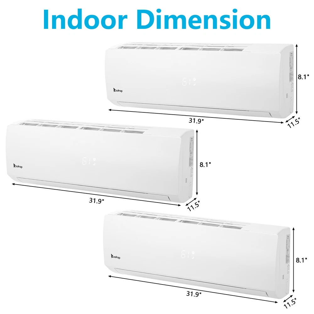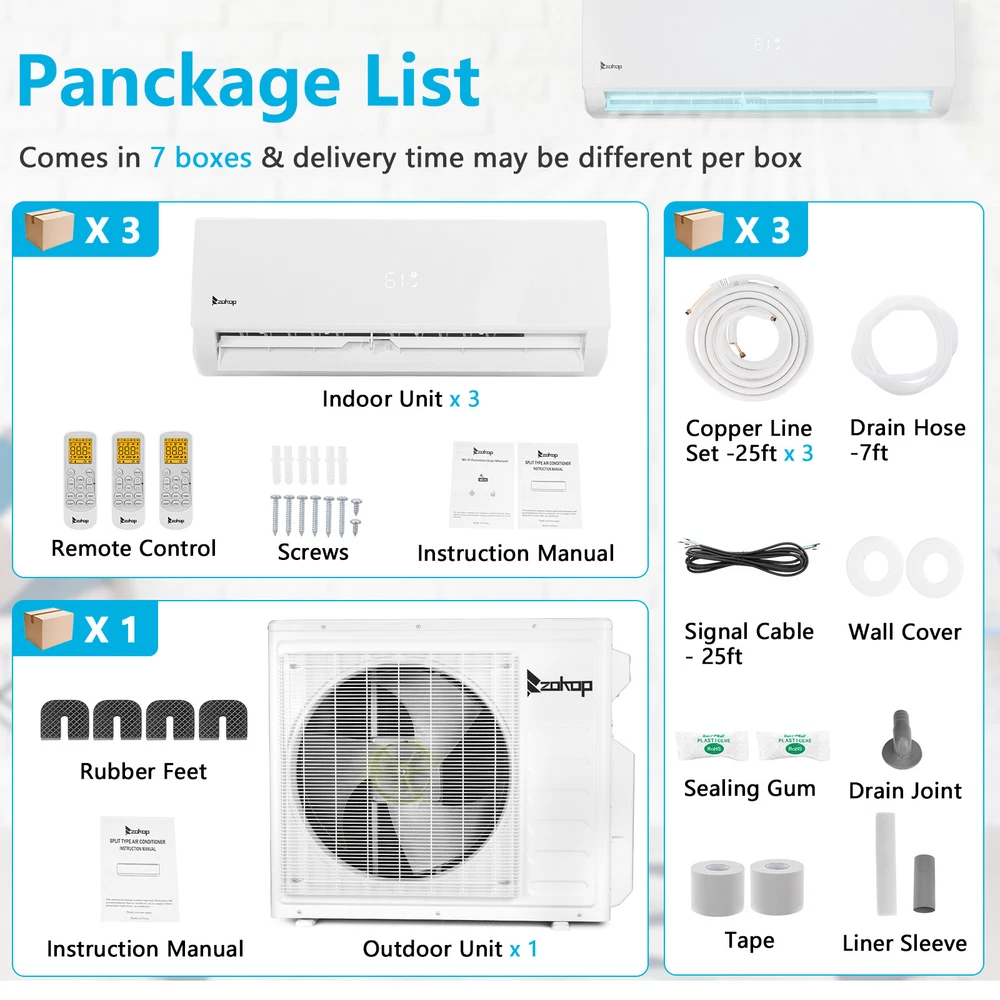 listing template VISIT OUR STORE SIGH UP FOR EMAIL 27000 BTU Wifi Tri Zone Split Heat Pump Air Conditioner (9000 + 9000+12000 BTU) ZOKOP 3 Zone Ductless Mini Split Air Conditioner Heat Pump System, 20 SEER2+21 SEER2 Ductless AC with 3 Indoor Air Handlers, 1 Outdoor Condenser, 25ft Installation Kit (9K+9K+12K) Introductions : ZOKOP smart Split Type Type Inverter Air Conditioners with heating function are made with high quality compressor, high speed pure copper motor & inner spiral copper tube which are powerful to quickly cool down / warm your home, office, garage or apartment for maximum comfort in quiet operation, perfect appliance in hot Summer or cold Winter. Comparing with others, machine featured with high SEER grade, which means that it is more energy efficient and much money saving! This unit also has Sleep, Turbo, ECO, Mute and Timer functions. These functions help you enjoy the true individual comfort. Let the ZOKOP Mini Split Air Conditioner 3-Zone be the solution to your home's heating and cooling needs. Features: 1. [MULTIPLE ROOMS] Comes with 3 indoor air handlers 9,000 BTU+9000BTU+12,000 BTU with separate controller for individual rooms and 1 outdoor condenser. Enjoy individual temperature controls in each room for ideal climate control. This unit provides cooling and heating for up to 1350Sq. Ft ( 2 indoor unit recommended area 400 Sq. Ft., another one 550 Sq. Ft. ) and able to work in environments as low as 5 degrees Fahrenheit. 3 pcs 24.6ft copper pipes (Standard size 1/4" & 3/8" outer dimension) and 4 installation kits included. The length for drain pipe is 78.7". Featured with Cooling, Heating, Dehumidifying and Fan only modes in one compact unit. It is ideal for using in home's bedroom, living roo, kitchen, office, apartment, garage and so on. 2. [Energy Saving] ZOKOP the speed of the air conditioner equipped with frequency converter directly affects the service efficiency of the air conditioner. The frequency converter is a control system used to control & adjust the speed of the compressor to make it always in the best speed state, so as to improve the energy efficiency ratio (at least 35% more energy-saving than the conventional air conditioner). This 20 SEER2 9000BTU+ 9000BTU + 21 SEER2 12000BTU, 208/230V~60Hz, AHRI Certified AC unit with a heat pump(up to 5℉/-15℃) is featured high quality compressor for more efficient cooling and longer working life; Higher SEER grade & Eco-friendly design which leads you for money saving ( please confirm voltage before making purchase) . 3. [Quiet Cooler & Heater] Ultra Silent at only 29-43 dB(A) and beautifully built adds a touch of elegant charm to your room. In sleeping & mute mode, It's able to maintain the temperature while you are sleeping. And you can use the 24-hour timer in combination to free you from additional worries. Featured with 4-way swing function, unit provides scientific airflow in your room to suit your comforts in just a few minutes. Best choice to decorate your home. 4. [Smart Operation] Operating this conditioner is an easy-understanding and enjoyable cooling experience (61-88degree Fahrenheit ). We can set all functions on remote control (Fan Speed Selection, Sleep Mode, 24 Hour Timer, ECO Mode, Turbo Mode, and Mute Mode). Built-in microprocessor chip & sensor in the remote controller makes it more convenient to operate the air conditioner from a distance. Digital LED display controls offer precise temperature adjustments and the remote control lets you control the air conditioner from across the room. 5. [Washable Air Filter] This indoor AC machine comes with a permanently washable and easy cleaning air filter. Keep your air conditioner running more efficiently by cleaning the filter once a month. Specifications: 3*Indoor Unit : 1. Color: White 2. Power Supply: 208/230V, 60Hz 3. Cooling : Rated Capacity: 9000Btu/h, 12000Btu/h Rated SEER2: 20 Btu/W.h, 21 Btu/W.h Rated EER2: 10Btu/W.h, 9.5Btu/W.h 4. Heating: Rated Capacity: 10000Btu/h, 12600Btu/h HSPF2 Rating (Region IV): 8.5Btu/W.h, 8.2Btu/W.h 5. Operation temperature: (16~31)degree Celsius/(61~88)degree Fahrenheit 6. Use the air conditioner in the following temperature conditions: Indoor(cooling/heating): 17 ~32degree Celsius(63 ~90degree Fahrenheit)/0 ~27degree Celsius(32 ~80degree Fahrenheit) Outdoor(cooling/heating): 15 ~55degree Celsius(59 ~131degree Fahrenheit)/-15 ~24degree Celsius(5 ~75 degree Fahrenheit) 7. Moisture removal: 1.1L/h, 1.6L/h 8. Indoor air circulation/Hi : 580/520/460m³/h, 520/450/380m³/h 9. Indoor noise level at cooling (Turbo/High/Med./Low/Mute): 43/41/36/31/29dB(A), 45/42/35/30/28dB(A) 10. Application Area: 9000BTU Up to 400 sq.ft, 12000BTU Up to 550 sq.ft 11. Certificate : AHRI, ETL 12. Indoor Dimensions: 81.1x29.2x20.5cm(31.9x11.5x8.1inch) 13. Indoor Package dimensions: 88.5x36.6x27.8cm(34.8x14.4x10.9inch) 14. Indoor Net weight: 9kg/19.8Ibs 15. Indoor Gross weight: 12kg/26.5Ibs 1* Outdoor Unit : 1. Cooling Capacity: 28000BTU/h 2. Heating Capacity: 28000BTU/h 3. SEER2: 20.0BTU/h.W 4. Rated Voltage: 208/230V~60Hz 5. Refrigerant type: R454B/2200g/77.66ozs 6. Outdoor Dimensions: 97.8x42.1x80.3cm(38.5x16.57x31.61inch) 7. Outdoor Package dimensions: 102.2×48×83.5cm(40.27x18.9x32.96inch) 8. Outdoor Net weight: 54kg/119lbs 9. Outdoor Gross weight: 68kg/127.9lbs 4*Copper pipes : 1. Connecting Pipe:Gas 3/8''-24.6FT/7.5M Liquid 1/4''-24.6FT/7.5M 2. Signal Cable Length: 24.6FT/7.5M 3. Drain Hose:6.6FT/2M Package Includes: 3*Indoor box includes: 1 x Indoor Unit 1 x Remote Control 1 x Screw Pack 1*Outdoor box includes: 1 x Outdoor Unit 3*Copper pipes box includes: 1 x Copper pipes set(24.6FT) 1 x Signal Cable(24.6FT/7.5M) 1 x Drain pipe(6.6FT) 1 x Drain pipe adapter 2 x Sealant 2 x Wall sleeve cover 2 x Pipe tape 1 x Insulation pipe 1 x Wall sleeve You might like this more>> Set of 10 Plastic Folding Chairs Wedding Party Event Chair $135.99 Makeup Case Cosmetics Organizer 2 Small & 5 Large $23.65 12-Batten 4 Tier Storage Organizer 