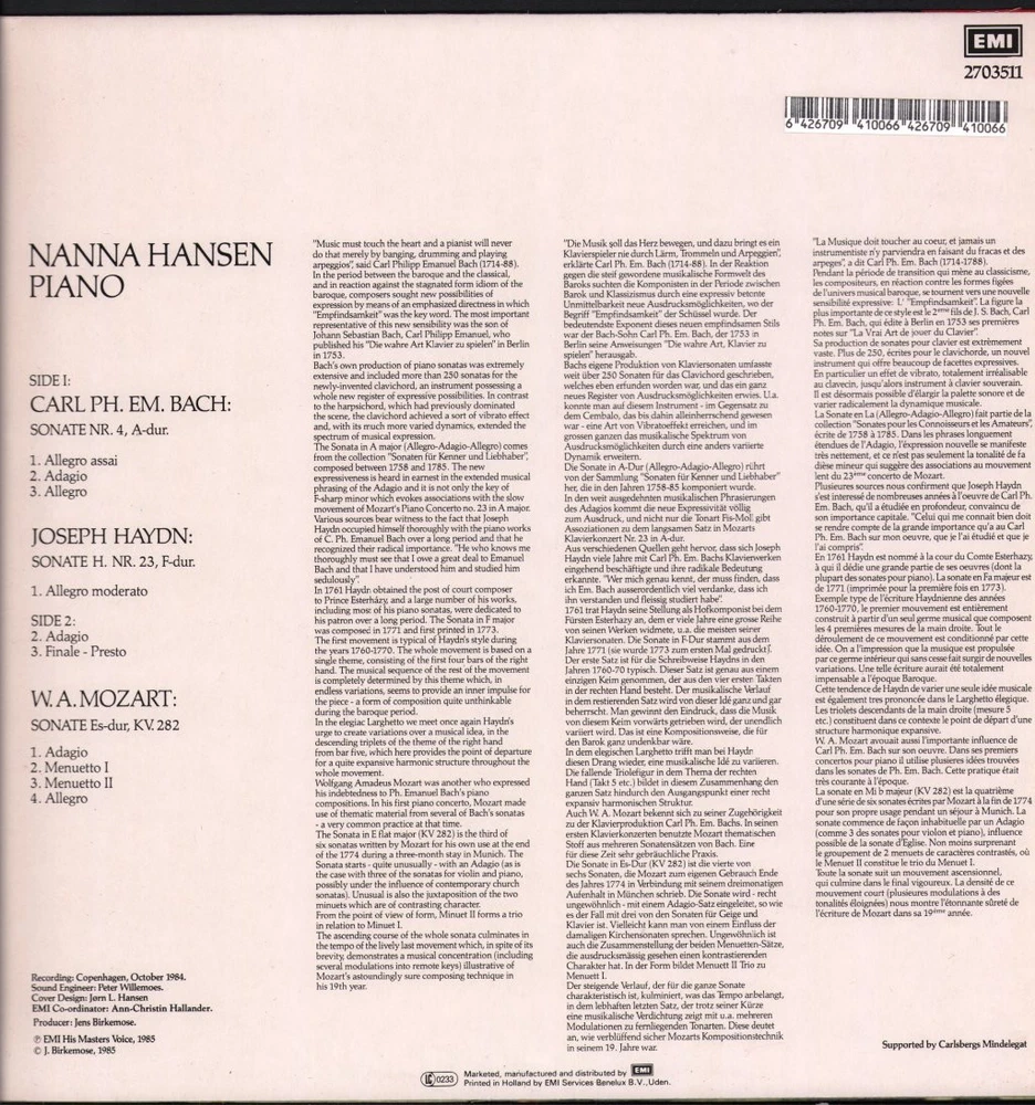 GRADING Our Grading System The table below is an overview of how our grading system works. The first grade is for the sleeve and second grade is for the media/disc, e.g. VG+/EX means that the item's sleeve is in Very Good Plus condition and the media/disc is in Excellent condition. If there is only one condition, e.g. /EX, it means that the item is not in a picture sleeve and that the media/disc is in excellent condition. Records that aren't in picture sleeves will either be in a company sleeve or a generic plain sleeve. If you have any questions, please get in touch. Condition Sleeve Media MINT (10/10) Mint, perfect Mint, perfect EX+ (9/10) Excellent plus, near mint Excellent plus, near perfect EX (8/10) Excellent, well looked after, clean, only slight signs of use Excellent, well looked after, clean, only slight signs of use EX- (7/10) Excellent minus, light wear and signs of use Excellent minus, light wear and signs of use VG+ (6/10) Very good plus, some moderate wear Very good plus, some scuffs, no deep marks VG (5/10) Very good, well used and worn Very good, well used and marked VG- (4/10) Very good minus, very worn Very good minus, very worn and marked GOOD (3/10) Good, some major wear Good, some major wear and scuffing FAIR (2/10) Fair, major wear Fair, major wear and scuffing POOR (1/10) Poor, severe wear Poor, severe wear and scuffing DELIVERY Combined Postage If you add all the items you wish to purchase from us to your shopping basket/cart, and then go to the checkout page from the shopping basket page, the shipping cost will be automatically combined. Packaging All of our items are parcelled using strong specially designed packaging, each vinyl in an order is placed in a clear plastic sleeve and plain paper white sleeve, and is separated from its cover (unless it is advertised as sealed), to prevent any damage during transit. If an item is sealed, and you would prefer the vinyl to be placed outside of its sleeve before dispatch, please let us know. Prices You can see all delivery options and prices for an item on the "Postage and payments" tab. Tracked delivery If you wish to have a tracking number with your order, please select the "Signed" or "Express" delivery option, "Standard" delivery does not include a tracking number. SHOP Click here to view our Ebay shop, with over 200,000 items in stock FAQ Does a used item include the original inner sleeve/insert/poster etc.? We will always include in the description if a used item includes any additional parts, e.g. "with inner" or "includes poster", if you know an item originally came with any additional parts, such as a printed inner sleeve, and it isn't mentioned in the description, then generally the used item won't include it, but please feel free to ask. New items will always be complete, unless otherwise specified. CATEGORIES Shop Home 10" Vinyl Records 12" Vinyl Records 7" Vinyl Records Cassettes (Tape) CDs (Compact Discs) LP Vinyl Records Music Memorabilia Other Artist Nanna Hansen Title Nanna Hansen, Piano Format LP Vinyl Country Netherlands Label Emi Catalogue Number 2703511 Year 1985 Description 11 track stereo Condition (Sleeve/Disc) EX/EX Track List Sonate Nr. 4, A-Dur - A1. Alegro Assai - A2. Adagio - A3. Allegro Sonate H. Nr. 23, F-Dur - A4. Allegro Moderato - B1. Adagio - B2. Finale - Presto - B3. Sonate Es-Dur, KV. 282 - B4. Adagio - B5. Menuetto I - B6. Menuetto II - B7. Allegro DELIVERY INFORMATION If you wish to have a tracking number with your order, please choose the Signed or Express delivery option, the Standard delivery option does not include a tracking number. Please note, the Express option for delivery outside of the UK includes a tracking number, but has the same delivery time as the Standard option. ABOUT US Vinyl Tap has been in the business of selling music for over 30 years, and in that period we have supplied many thousands of collectors and music fans around the globe with vinyl, CDs and music memorabilia. You can check out the over 200,000 items that we have in stock on our Ebay shop, here . Artist: Nanna Hansen - Title: Nanna Hansen, Piano - Format: LP Vinyl - Country: Netherlands - Label: Emi - Catalogue Number: 2703511 - Year: 1985 - Description: 11 track stereo