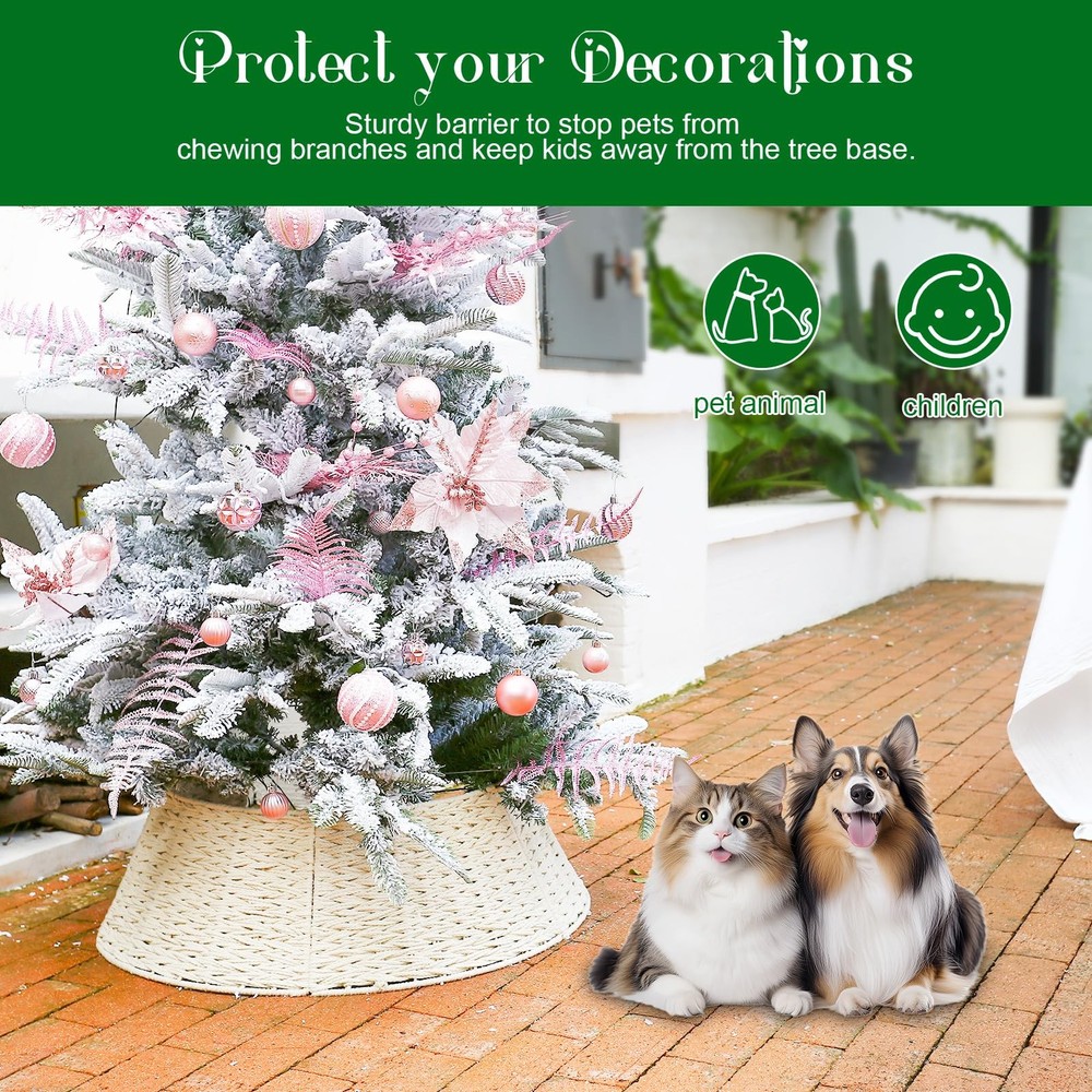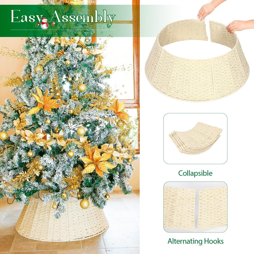 Christmas Tree Collar, 27.5" Hexagon Christmas Tree Base Collar for Artificial Tree, Foldable Woven Tree Collar, Christmas Tree Ring, Tree Skirt Collar, Christmas Tree Base Cover DURABLE CHRISTMAS TREE COLLARS: Christmas tree collars are made with an iron frame and heavy yarn hand knitted for durability; the beautifully knitted pattern adds a sophisticated and unique touch to your holiday decorations. Size Fits Various Tree Types: Once assembled, The tree skirt collar forms a ring shape with an upper opening diameter of 19 inches and a lower opening of 25.5 inches, standing 10 inches tall. The Christmas tree ring is suitable for Christmas trees ranging from 4 to 7.5 feet or with a base diameter of up to 25.5 inches. Design and Versatility: This handcrafted Christmas tree base cover adds a festive touch and elegant charm to any home or commercial space. The tree collar not only enhances aesthetics by covering the unattractive base of the tree but also keeps children and pets away from the bottom. Structure and Assembly: The large tree collar consists of 5 panels, each with locking clips for easy folding and storage. Assembly is simple and requires no tools—just lock the side panels into the front panel and slide the Christmas tree collar box into place in front of the tree. Eye-Catching Decoration: Decorate your Christmas tree with this Christmas tree stand cover. If you want your tree to stand out, this is the ideal choice. The Christmas tree box base complements any style, whether modern, farmhouse, or traditional, and will surely impress.