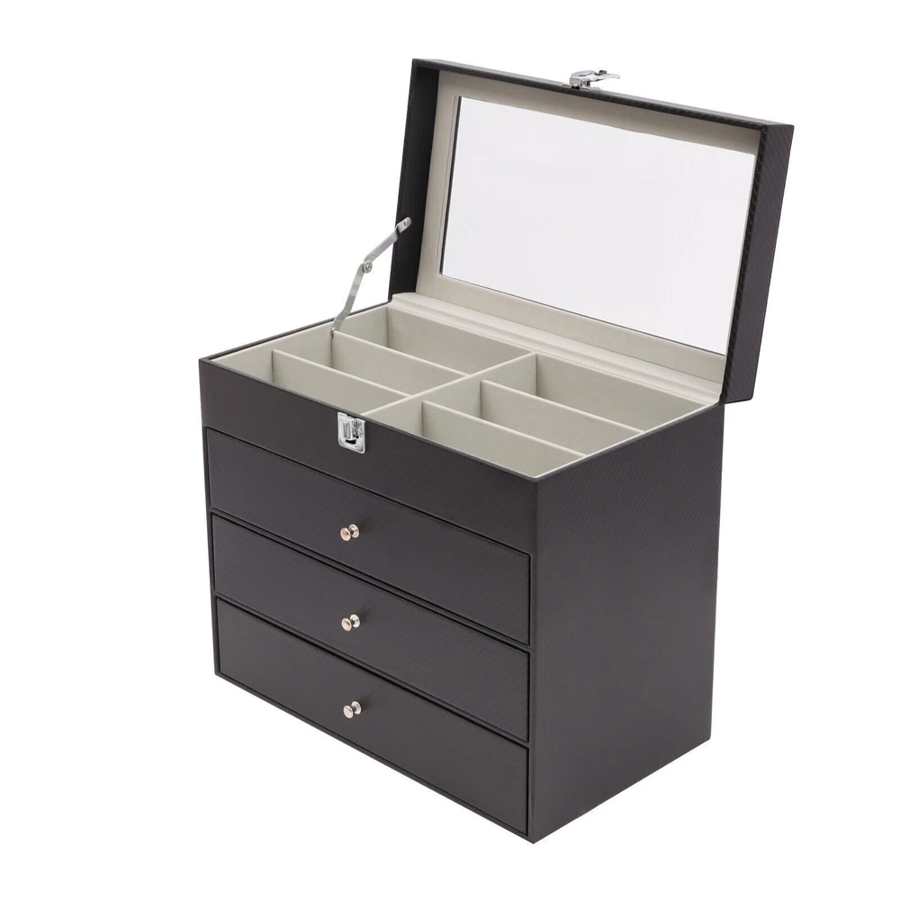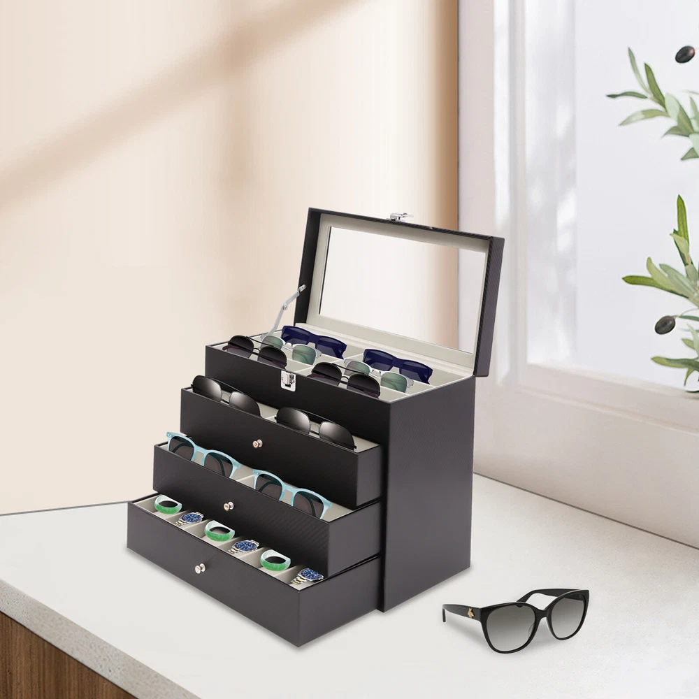 Application This storage box can hold all kinds of glasses, watches, and all kinds of accessories. This beautiful organizer is suitable for home or travel storage and gift-giving. Specification Material: Carbon Fiber PU, Medium Fiber Board, Hardware Locking, Velvet Fabric, Glass Color: Black Function: Dustproof Number of Layers: 4 Shape: Rectangular Gross Weight: 4kg/8.82lbs Net Weight: 3.5kg/7.72lbs Each Glasses Storage Slot: 16*6*4cm/6.3*2.4*1.6in Product Size: 33.5*19*29.5cm/13.2*7.5*11.6in Package Size: 35*22.5*34cm/13.78*8.86*13.39in Package Included 1* Sunglass Storage Box 27-Grids Eyeglass Sunglasses Glasses Storage Display Box Holder Organizer Case Description Are you still worried about not being able to find a certain pair of glasses or a certain piece of jewelry? If you want to find your glasses or other jewelry easily, then you definitely need this organizer. Its four-layer structure can hold enough glasses, watches, and jewelry. And the lockable design can also ensure your privacy. In addition, the clear glass design at the top allows you to display your beautiful glasses or accessories. This storage box can hold all kinds of glasses, watches, and all kinds of accessories. This beautiful organizer is suitable for home or travel storage and gift-giving. Specification Material: Carbon Fiber PU, Medium Fiber Board, Hardware Locking, Velvet Fabric, Glass Color: Black Function: Dustproof Number of Layers: 4 Shape: Rectangular Gross Weight: 4kg/8.82lbs Net Weight: 3.5kg/7.72lbs Each Glasses Storage Slot: 16*6*4cm/6.3*2.4*1.6in Product Size: 33.5*19*29.5cm/13.2*7.5*11.6in Package Size: 35*22.5*34cm/13.78*8.86*13.39in Package Included 1* Sunglass Storage Box Key Features Storage Assistant: The multi-layer design of this box allows you to store different accessories in different categories. You will say goodbye to the difficult search in the pile of cluttered glasses and jewelry with it. Excellent Dustproof Function: The top of this box is equipped with a buckle to improve sealing, which can effectively block dust. And the drawers are tightly connected to well protect the glasses and jewelry from the outside environment. More Decorative: This organizer has a sophisticated look and does not take up too much space. Place it on your dresser not only to store your glasses and watches but also to decorate your dresser and show your unique taste. High-quality Material: This stylish organizer is made of moisture-proof carbon fiber PU, which is waterproof and easy to clean. The inner compartment part is a medium fiberboard made by high-temperature pressing after the plant fiber is crushed, which is environmentally friendly. Enough Space: This organizer has a total of three layers of 6 slots for glasses and one layer for watches, necklaces, and bracelets, which can hold up to 18 pairs of glasses, 6 watches and many valuables. With it, you don't have to worry about the lack of storage box capacity! Exquisite Gift: The product's elegant appearance and thoughtful design make it a good gift for mothers, wives, friends, colleagues, etc. Ready to Use: It has a one-piece design without the need for installation. You can use it directly after you receive it, which is very convenient. Easy to Access: The transparent design at the top allows you to clearly see your various collections and various styles of eyeglasses at a glance, greatly reducing the time spent searching for items. Details Interior Velvet: The box is fully lined with soft velvet, which effectively protects the watch and jewelry from scratches. Removable Pillow: The small fleece pillow in the irregular storage slot can be removed. If necessary, you can then remove it to provide space for more things. Scratch-resistant Glass Top: We use clear glass as the top window because it helps to display your collection beautifully and you can easily pick your favorite pair of glasses for any occasion. What's more, the glass material is hard to scratch and its lifespan is longer. Notes Please allow the slight color difference caused by the shooting light and 1-3cm error due to manual measurement. Please make sure you do not mind before you order. Payment Delivery details Terms of sales About us Contact us Payment We accept ebay payment 。 Fees such as import duties, taxes are not included in the item price or shipping costs. These charges are the buyer's responsibility. Delivery details Shipping: 2-9 working days to: USA Terms of sales We maintain high standards of excellence and strive for hundred percent customer satisfaction. Feedback is very important to us. We hope that you contact us immediately before you give neutral or negative feedback, so that we can address your concerns. It is impossible to address issues if we do not know about them! About us Your satis faction is our ultimate goal. We work hard to earn your trust and future business. Our certified technicians have tested each item before shipping. The unit comes with 1 year limited warranty on all manufacturing defects. a) If you receive a defective item, you may return it or ask for a discount. Please contact us within 14 days after you receive the package. b) What you returned must be intact and in its original packaging as re? u. Customer is responsible for shipping costs of the returned item. c) We will cover the cost of shipping back t with the shipping rate indicated in the registration page. We will send you a new unit or refund the full payment you paid. Thank you. Contact us Business Hour Business Hour: Monday To Friday: 8:30 AM to 5:00 PM (Beijing China time) Due to time zones, our reply to your questions may not be immediately. But within above working time, we will reply your email within 24 hours. If it's non-workdays, please kindly be patient and wait till Monday. Please contact us with ebay message. Please feel free to contact us if you have any questions. Monday To Friday: 8:30 AM to 5:00 PM (Beijing China time) Due to time zones, our reply to your questions may not 