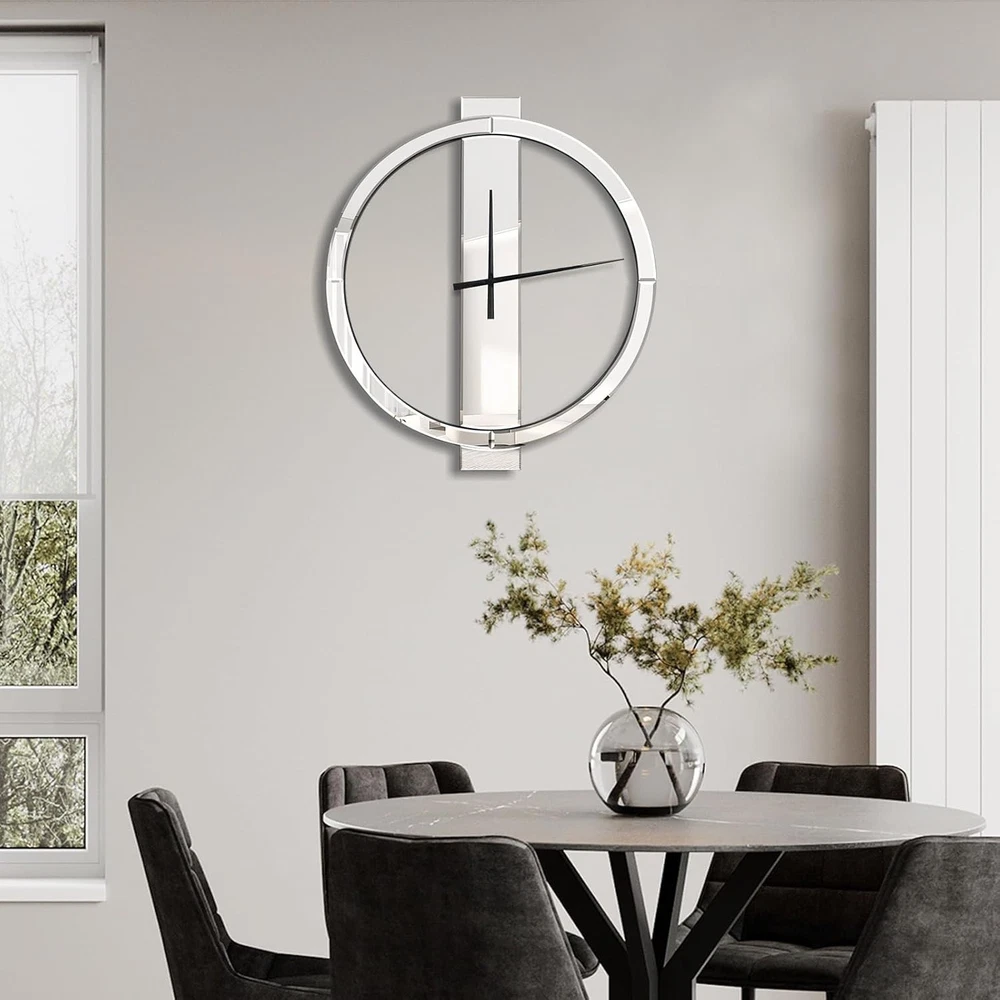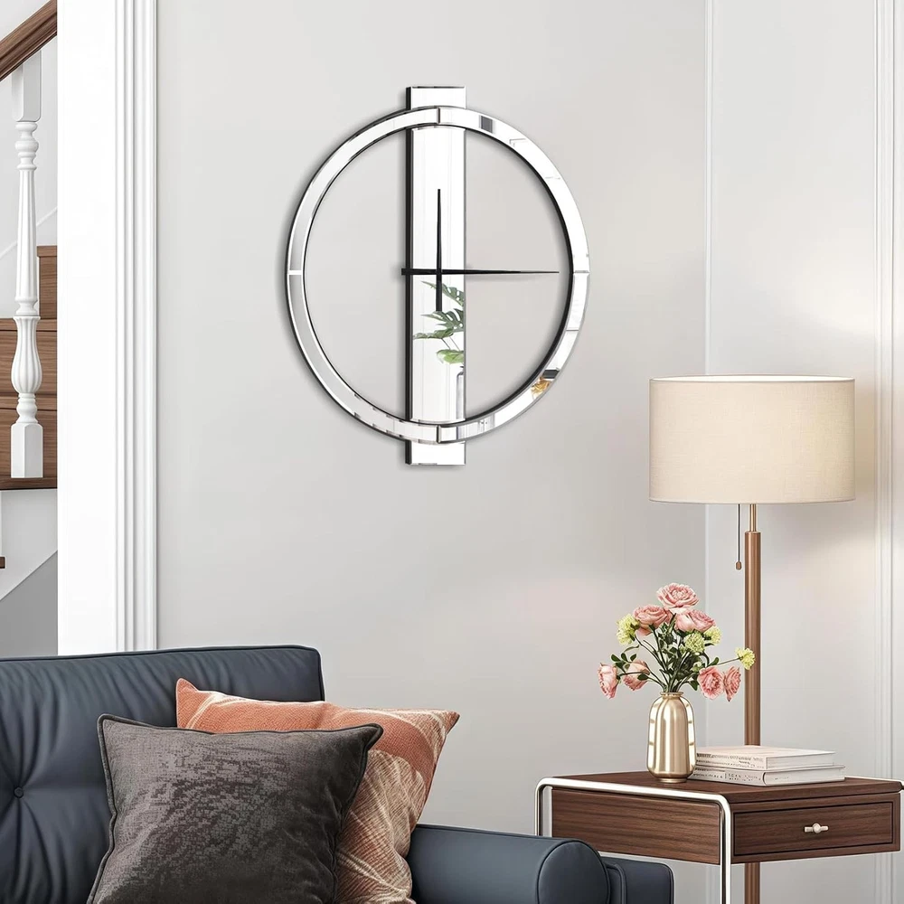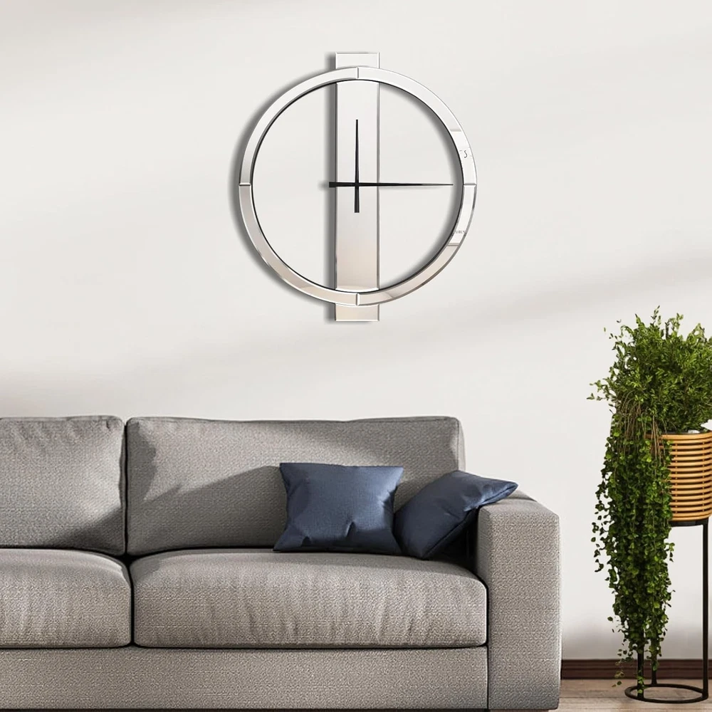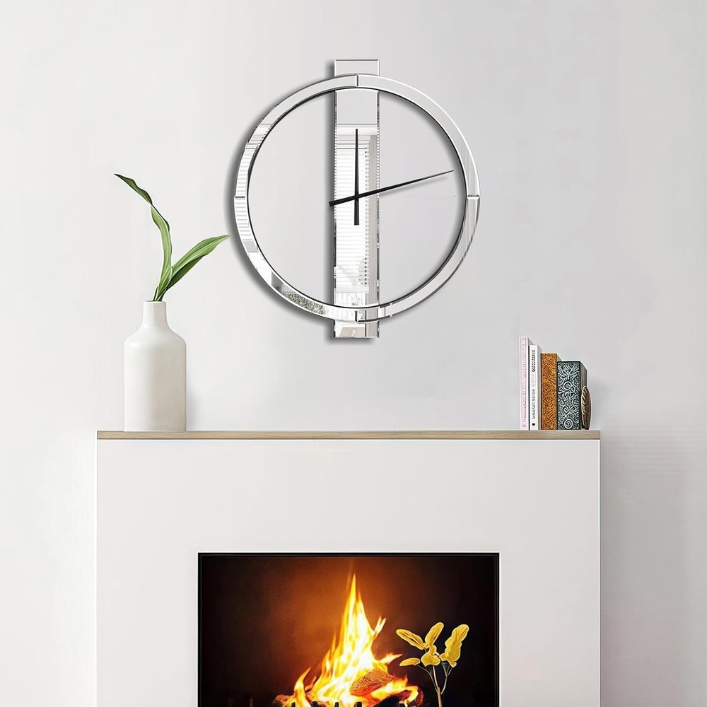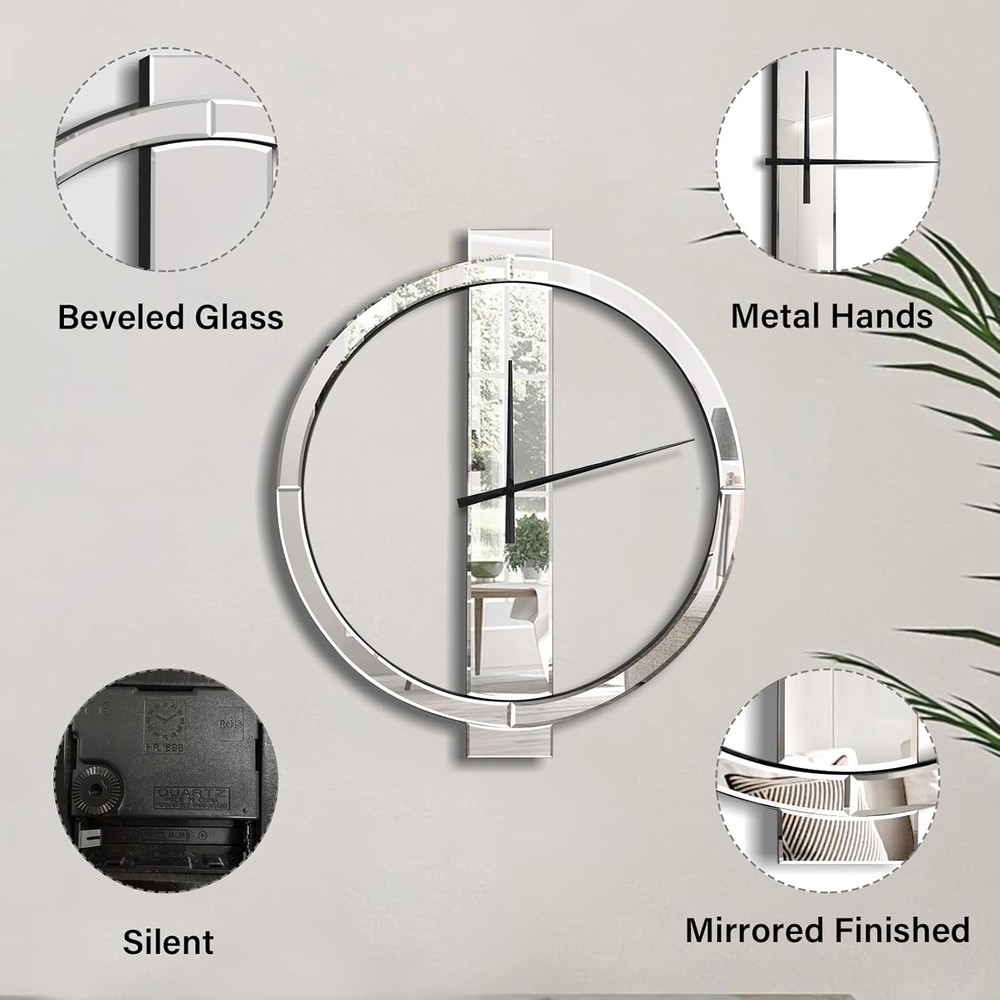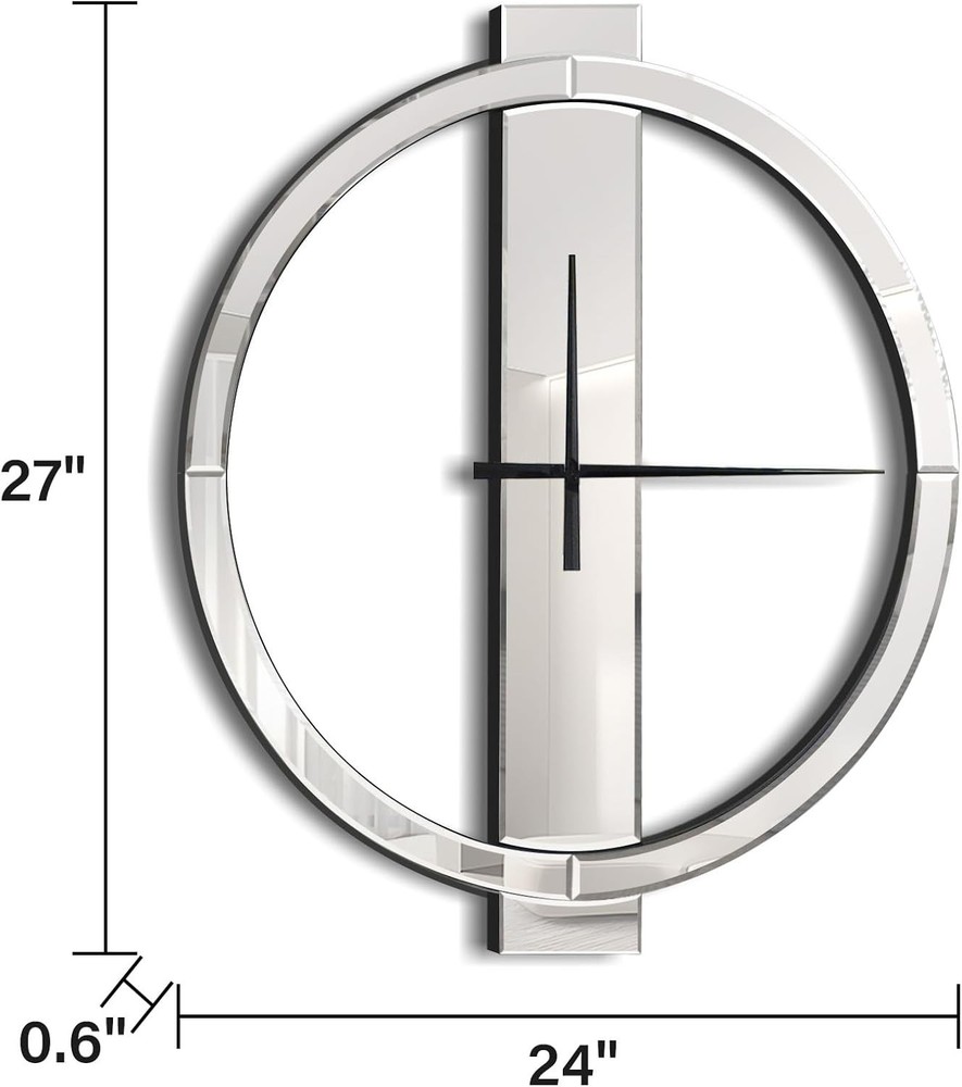Beautiful Appearance: This mirrored wall clock with simple geometric design breaks the traditional round clock design, and is more stylish, simple yet elegant. It can be used as an excellent decoration in the living room and entrance, and will be praised by family and friends Material: The decorative wall clocks is made of HD silver mirror and solid MDF. After repeated tests, it ensures that the mirror reflection is clear and the structure is stable, and it can be used continuously for many years Proper Size & Weight:Large wall clock measures 27 inches tall, 24 inches wide, and 0.6 inches deep. Net Weight: 6 Pounds Precise Timing: This battery operated wall clock uses a non-tick-tick high precision quartz movement to ensure accurate time. Only one AA battery is needed to make the metal hands move (Batteries are not included due to shipping safety issues) Easy installation: There is a metal keyhole pre-installed on the back of the 24 inch wall clock. You only need to screw the provided wall anchor and screw into the wall, and then align the keyhole with the screw to hang it Sturdy Packaging: The modern wall clock packaging has been repeatedly dropped before leaving the factory, so you can buy it with confidence188