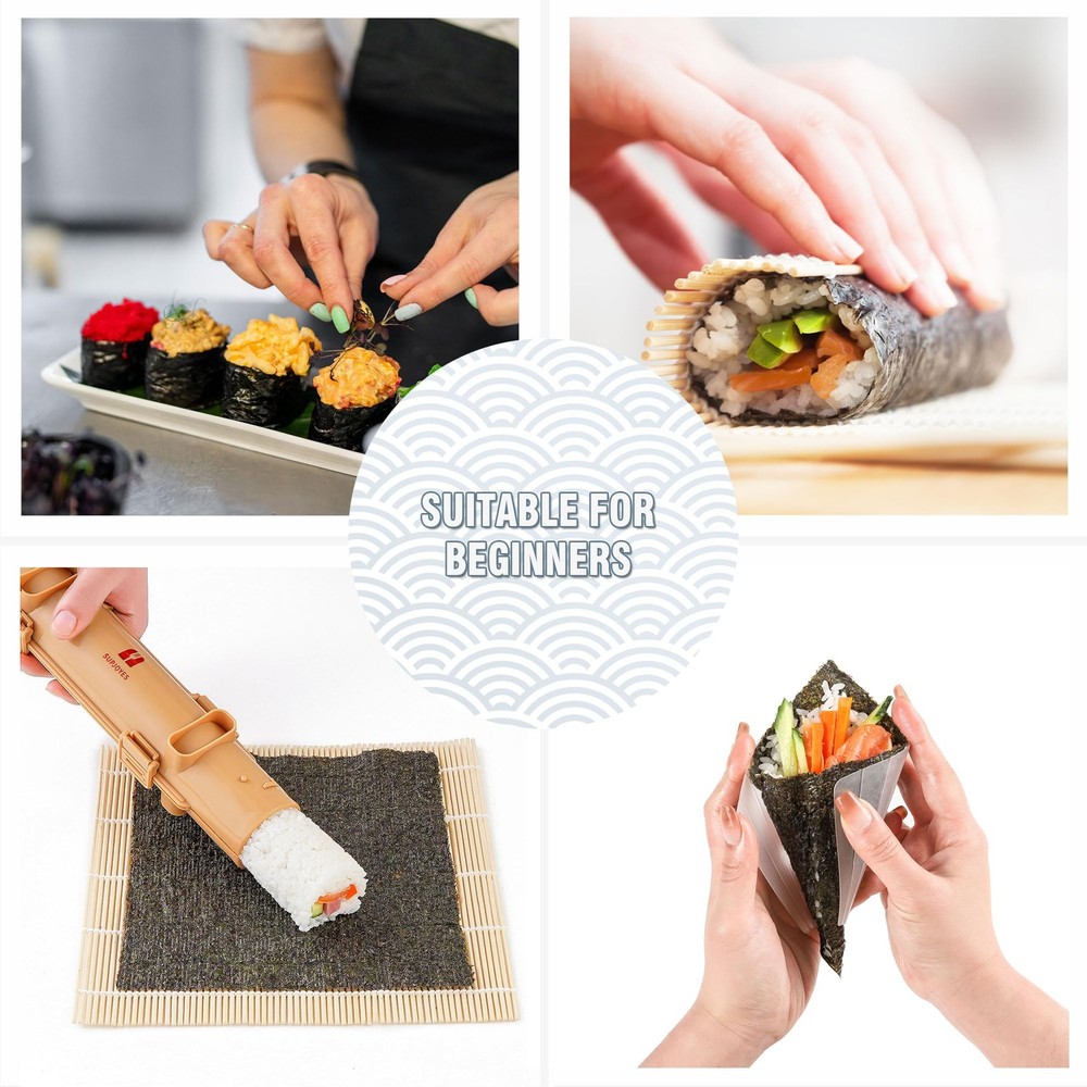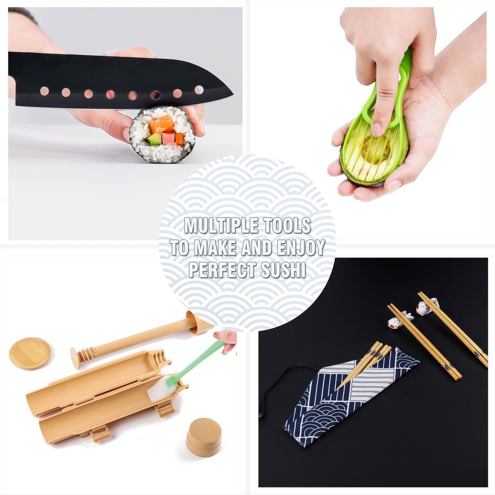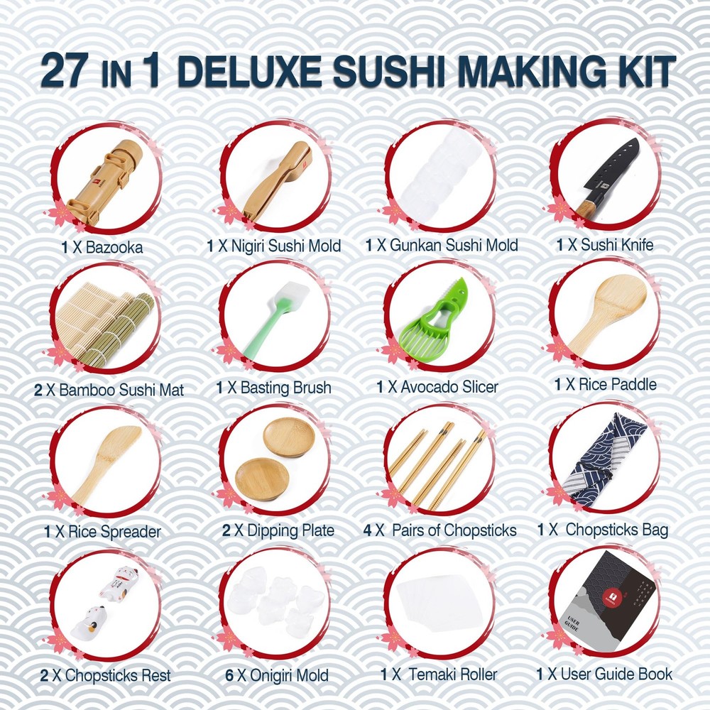 sushi making kit is made of premium PP plastic, safe and reliable. 100% natural bamboo Sushi Mats. 100% No-BPA premium materials and dishwasher-safe. Warm tips: Before first use, Please soak the sushi rolling mat in warm salt water for 1 hour and then clean it normally. After cleaning, store in a ventilated and dry place to dry. Dry thoroughly. Please note that high temperature electrical appliances such as disinfection cabinets, microwave ovens and boiling water cannot be used. Proper cleaning can extend the life of your sushi set. Dishwasher is not recommended. Protect from heat and sunlight to protect bamboo and prevent splinters. 27 IN 1 DELUXE SUSHI MAKING KIT: sushi maker includes all the accessories for making perfect sushi. This kit contains Sushi Bazooka, Nigiri Sushi Mold, Gunkan Sushi Mold, Sushi Knife, 2 Sushi Mats, Basting Brush, Avocado Slicer, Rice Paddle, Rice Spreader, 2 Dipping Plates, 4 pairs of chopsticks, chopsticks bag, 2 chopsticks holders, 6 Onigiri Molds, Temaki Roller and User Guide Book. EASY TO USE: All the accessories are designed for ease of use, you can make fascinating sushi in your own home with our sushi making kit. Also there is detailed guide book to tell you how to create different kinds of delicious sushi with each tool of sushi making kit even for beginners. DETAILED GUIDE BOOK: Easy to craft perfect sushi follow the guide book step-by-step. You will find out making sushi never been so easy with our kit. There are various sushi you can make like Maki sushi, California rolls, Gunkan sushi, Nigiri sushi, Temaki, Onigiri and etc. Discover the fun of making sushi. FOOD SAFE AND HEALTHY: All the kitchen accessories are made of premium food-safe material. Each product in the sushi set is non-toxic, BPA-free, odorless and environmentally friendly. Versatile kitchen gadgets are crafted from sustainable natural bamboo material. Enjoy making sushi at home for your family. IDEAL GIFT CHOICE: Comprehensive sushi maker packed in exquisite gift-ready box makes it a special gift for sushi lovers. Simply making sushi like a chef by this sushi making set. Multiple molds allow you to have fun with kids, families and friends. You never want to miss sushi making kit.