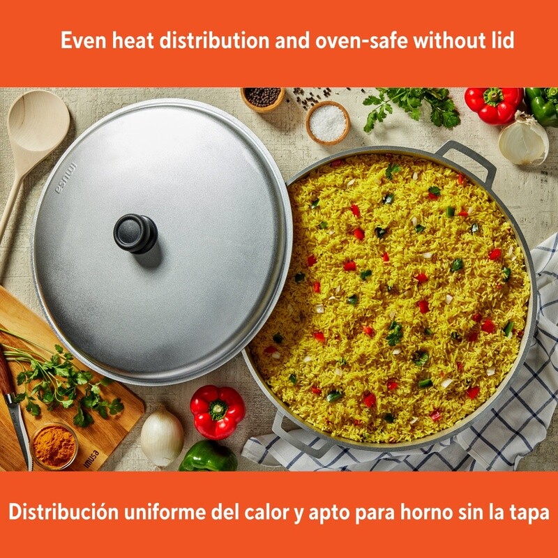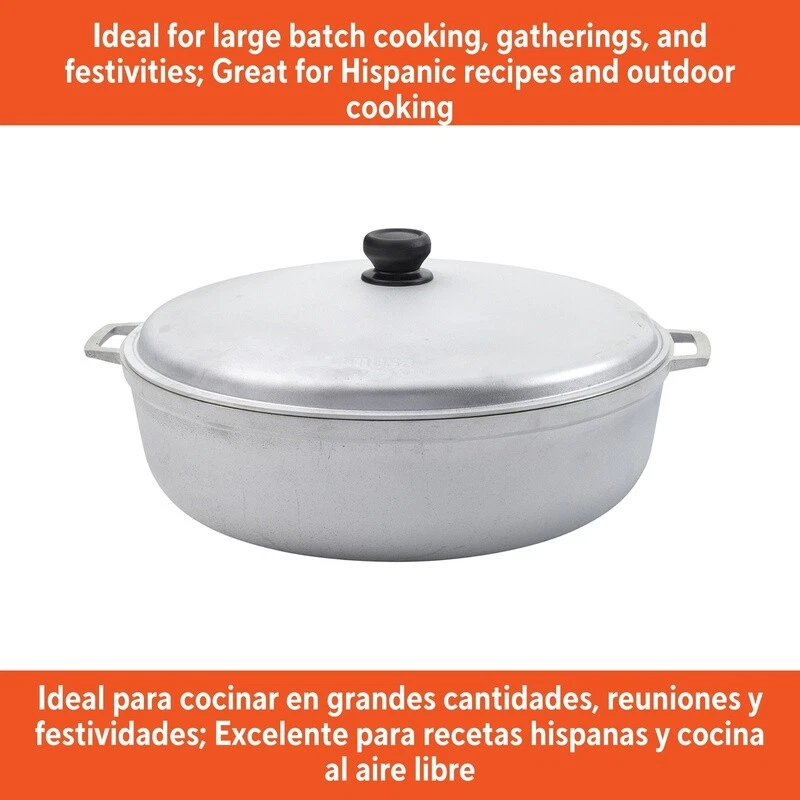 You may also like 6 Qt Nonstick Jumbo Cooker Pots Dishwasher Oven Safe Durable Aluminum Aqua New 24.55 USD 25.84 USD Free shipping 5% off Non-Stick 5 QT Saute Pans W/ Glass Lid Handles Stainless Steel Base Oven Safe US 38.9 USD 40.95 USD Free shipping 5% off 5 Quart Non-Stick Dutch Oven W/ Venting Lid Easy Meal Prep Induction Safe New 45.08 USD 47.45 USD Free shipping 5% off 13"Saute Pan W/ Glass Lid Non-Stick Coating Dishwasher Safe Kitchen Aluminum Red 56.96 USD 59.96 USD Free shipping 5% off The 27Qt Basic Caldero is an essential piece in every Hispanic kitchen, renowned for its durability and unique design. This caldero is manufactured in Colombia and is made of cast aluminum with a natural finish cooking surface that seasons over time. This cookware piece has a capacity of 27Qt. The Basic Caldero includes its tight-fitting lid, steam vent for moisture control, and a convenient knob and side handles for safe operation. The thick walls will deliver consistent and delicious results each time. With this versatile piece, you can cook a variety of different meals. Whether creating gourmet dishes, cooking rice, simmering beans, braising meats, preparing stews, crafting sauces, or enjoying comfort foods, the Basic Caldero excels. The Basic Caldero is oven-safe without the lid, making it perfect for grilling and baking. After cooking, take this caldero straight from the kitchen to the table as a stylish serving dish. Trust the Basic Caldero for balanced, home-cooked meals. It will surely become your kitchen's beloved companion, uniting tradition, and innovation in every delectable creation. Elevate your culinary experience with this enduring symbol of Hispanic heritage. LARGE COOKING CAPACITY: This caldero has a capacity of 27 quarts, making it ideal for substantial meal sizes effortlessly, providing extensive versatility in various cooking applications DURABLE AND RELIABLE: Made of cast aluminum for reliable durability, with a cooking surface that seasons over time for enhanced flavor TRADITIONAL AND CONVENIENT DESIGN: provides even heat distribution and oven safety without lid, and also features easy grip handles and tight-fitting glass lid with steam vent CULINARY ADAPTABILITY: Perfect for cooking rice, simmering soups, beans, sauces, stews, and a wide variety of other delicious dishes, this versatile caldero adapts to numerous cooking styles and recipes, making it an essential tool in any kitchen VERSATILE ESSENTIAL: Perfect for preparing a diverse array of traditional Hispanic recipes, making it an indispensable choice for everyday culinary endeavors