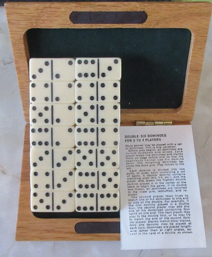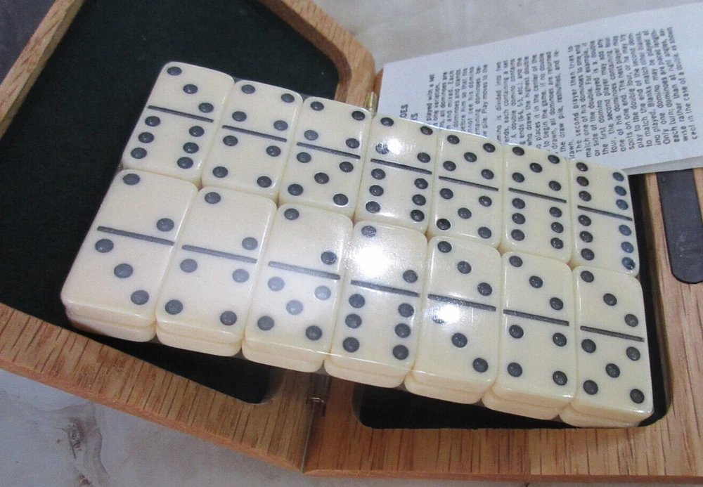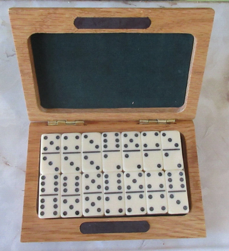 Full Set Dominoes are still sealed. Quality 5x4 Box is solid wood with brass hinges.