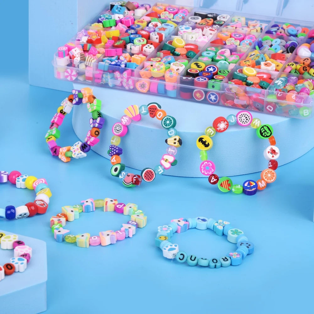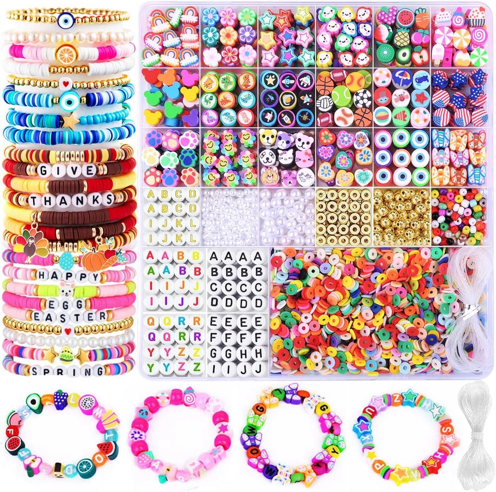 【2880PCS BRACELET MAKING KIT】Include 1 storage box, 27 different styles Bracelet Making beads,contains pony beads, flat round beads, opaque letter beads,colorful letter beads,white letter beads,gold letter beads,peal beads,flat gold spacer beads,round gold spacer beads, rainbow, flower, pentagram, cloud, fruit, candy, mouse head, dinosaur, universe, football, basketball, volleyball, rugby, ocean series, national flag, cat's paw, sunflowers, animals, love, eyes, butterflies beads etc and plus 5 meter elastic string, unique and creative to meet all needs. 【Suitable Size】The polymer clay beads about 6mm long with a 2mm hole, and the size of letter beads is 6*6*3mm,the diameter of the hole is 2mm. the diameter of the other beads are about 10mm, the holes are about 2mm, All beads are separately stored in a 26 grid plastic box, which is very convenient to store and carry 【Premium Materials】 All of our beads are made of healthy materials, light and durable, comfortable to the touch, not easy to fade, waterproof, and can be worn when bathing or swimming. You can use and wear it with confidence 【Wide Application】 Perfect for Beading, Jewelry Making, bead bracelet keychain for women, bracelet earring necklace making supplies, phone charm, phone lanyard wrist, pendants, waist beads kit, hairpin or hair braids, fashionable shoes decor and party decoration. Animal beads adhered to hairpin would be a perfect hair decoration. 【Great Gift for Friends】 This great value bracelet making kit would be a perfect gift to help your Friends to improve hand-eye coordination, improve the practical ability and concentration, broaden imagination, training creativity and logical thinking. Your best friend will love to receive this craft kit for Christmas, Birthday, Thanksgiving Day. Not for children under 3 yrs:Toy contains a small part. Not for children under 3 yrs. To be used under the direct supervision of an adult Product Description