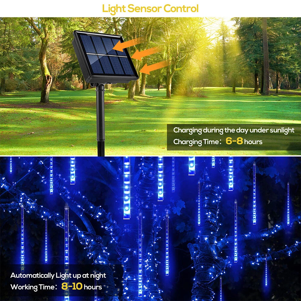 Meinuousa Your Best Online Business Partner 288LED Solar Meteor Shower String Light Falling Rain Garden Party Xmas Tree Lamp Features: 【 Premium Material 】 Transparent PVC bulb tube is bright but energy saving leds which are waterproof,dustproof,corrosion resistant,super durable and environment friendly. 【 Meteor Shower Effect 】 The 288 LED 8 Tube light‘s every bulb turns on and out one by one in sequence and quickly just like meteoric shower or falling snow in the night sky. 【 High-brightness lamp beads 】 Fully upgraded PCB circuit board, high-quality lamp patch, higher light efficiency 【 Upgraded Solar Panel 】 Efficient absorption & conversion, using A-level solar chips, the conversion rate is higher, and the lighting time is longer 【 Solar powered 】 It will work at night and charge by the sunlight in daytime automatically. No battery or electricity required .It can work up to 6-8 hours or more when fully charged, low power consumption and energy saving 【 IP65 waterproof 】 Low and high temperature resistance, waterproof connectors &plugs, PVC pipes can also be used normally in heavy rain , high temperature or cold weathe 【 Widely Application 】 Used for Christmas,Halloween Day,New Year,Wedding,Parties,Valentine's Day,decoration for trees along streets,business celebration and any celebrating time,also perfect for market engineering lighting,parks,urban night lighting,attractions landscaping,yard,garden,shopping malls and more Specifications: Material of Tube: PVC Suitable for: outdoor or indoor Tube Length: 50cm/20in, cable length: 293cm .Light distance: 31cm, Battery: 1000 mAh LED Quantity: Totally 288 Pcs LED bulbs of per tube: 36 Tube Quantity: 8 Tubes Irritation Angle : 360° Solar Power : 2V / 100mA Rechargeable Battery : 1.2V /1000mA Waterproof : IP65 LED Color:Mulitcolor,Warm White,Cool Blue Use at: New Year, Garden Decortation, Holidays, Mall Opening, Christmas, Congratulations, Easter, Halloween, Multipurpose, Party, Wedding Package include: 1 x 288 LED 8 light bars with LED light &connectors &plugs 1 x Solar Panel with Stak 1 x R emote Control Payment Shipping Returns Contact Us About US - We accept the payment through :Credit, debit, and gift cards, Apple Pay, Google Pay, PayPal, and PayPal Credit. - Payment must be fulfilled within 4 days after the end of auction. - Please make sure your ebay address is correct. Or not, please correct it before payment. - If you are a big customer, Please contact with us about the item's PRICE and SHIPPING. - Your feedback & suggestion is deeply appreciated, thanks. 1. Please make sure your address in ebay is correct. 2. We will only follow your address listed in the ebay orders for the shipment. 1. We can exchange the item within 30 days after you received it if it is defective. 2. Returned item must have all original packaging and accessories. 3. Buyer are responsible for the returning shipping costs. 1. We greatly appreciate your POSITIVE feedback. 2. Negative or Neutral feedback does not resolve any underlying issues that you may be experiencing as a buyer. 3. Any question or unsatisfaction please contact us with ebay message, we will sincerely solve for you. Feedback is very important to us, if you are satisfied with us, please leave us 5 star positive feedback to us. If you h have any problem, please contact us first BEFORE you give us neutral or negative feedback, so we can try our best to help you solve your problem. All rights reserved.