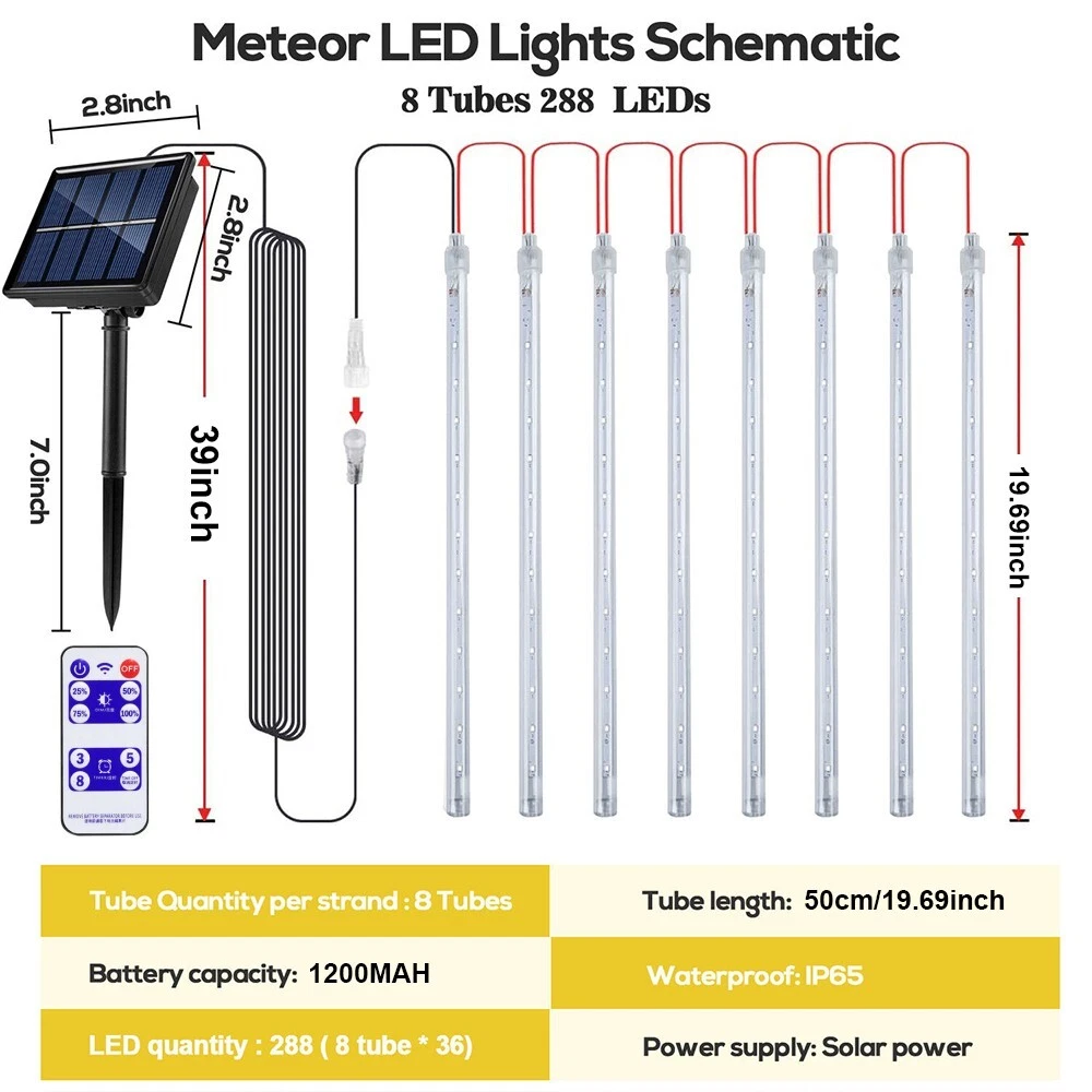 Energy Star: 5 Stars Light Shape: TUBE Size: 8 TUBE / 288 LED Number of Settings: 8 UPC: Does not apply Features: Solar, Waterproof Theme: Holiday/Christmas LED String/Strip Type: // MPN: Does not apply Cord Color: Clear Department: Adults EC Range: A++ - E Sensor Type: Light gtin13: Does not apply Brand: Unbranded Control Style: Remote Control Installation Area: Indoor & Outdoor Occasion: Party Lighting Technology: LED Type: Waterfall Power Source: Solar Color: Clear