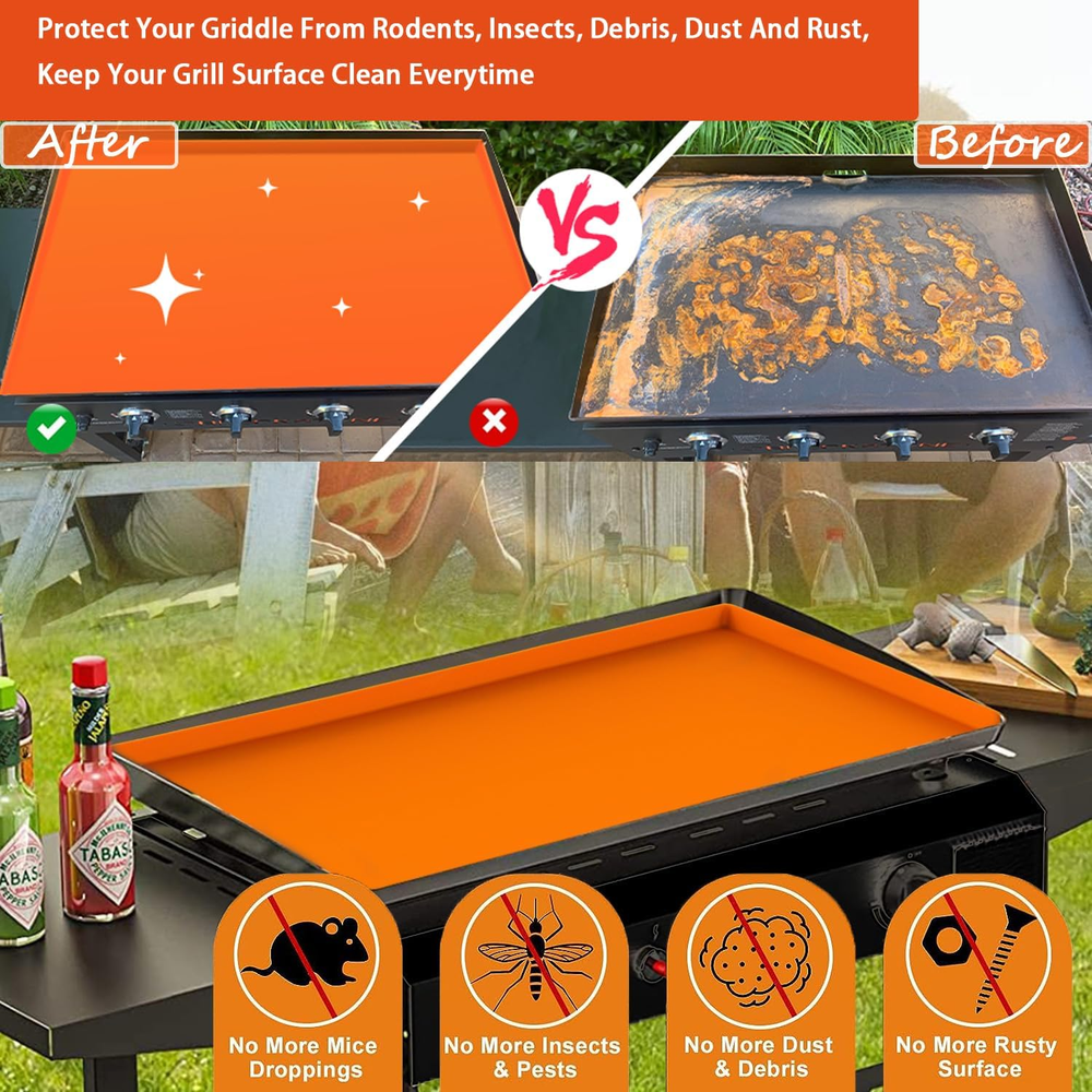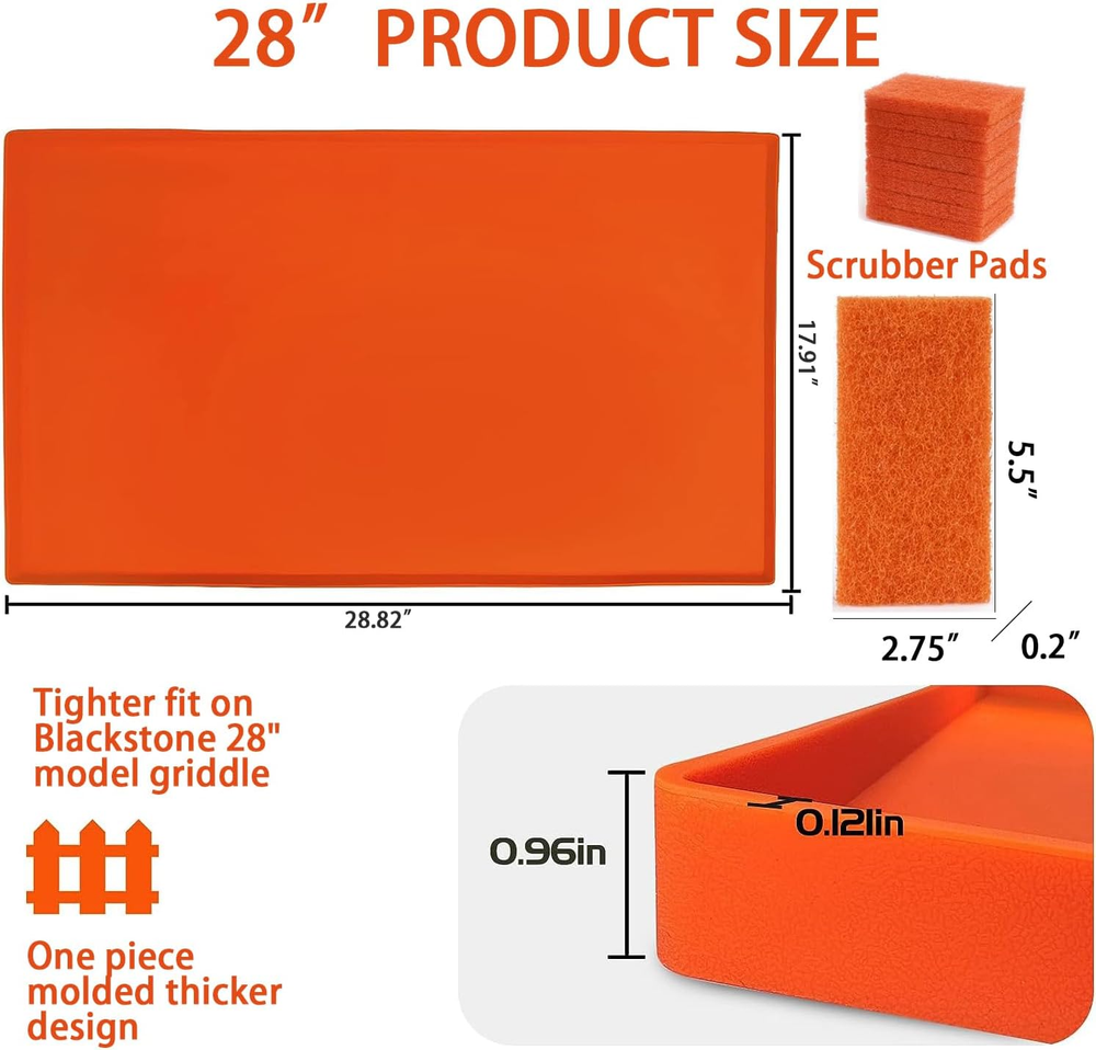 Grill Mat L: 28.82", W: 17.91", H:0.96". Our grill mats are designed to fit your 28" Blackstone griddle, it fits perfectly without any trimming to ensure it won't wobble or slip, we also supply 3 pieces of high quality sponge cloths to help you clean your grill or grill mats before and after use without damaging any of your equipment. Our Heavy Duty Blackstone Grill Mat is made of 100% grade silicone, heavy duty thickened design, soft and flexible, the silicone is thick, easy to clean, foldable for storage, reusable, heat resistant also ensures safety and , it is the safest material to protect the surface of the Blackstone Grill. The Silicone Grill Mat is a perfect fit for the Blackstone Grill. It provides protection against rodents, insects, dirt and rust. The high-sided design of the grill also helps to trap moisture and debris, protecting it from moisture and oxygen. This prolongs the life of the pan and keeps it in pristine condition. Keep your griddle looking new with our silicone grill mat and protect your investment all year round. Enjoy healthy and delicious grilled with friends and family! If you are not satisfied with the tin floor mats or have any quality problems, you can find us through and we will provide you with a satisfactory solution. SILICONE GRIDDLE MAT FOR BLACKSTONE 36" 28" 22" 17” MODEL GRIDDLE GRIDDLE BUDDY MAT BLACKSTONE The Gearmatte Silicone Griddle Mat is an excellent grill accessory that adds convenience and effectiveness to your outdoor griddle cooking. BLACKSTONE GRIDDLE MAT SILICONE This practical tool substantially cuts down on the time needed for both cleaning up and preparing your griddle, as it ensures the griddle surface remains clean and from rust when not in use. BLACKSTONE SILICONE GRIDDLE COVER Gearmatte Griddle Buddy Mat has evolved from its original built-in design to now provide full coverage, effectively extending the lifespan of your BBQ and shielding it from adverse weather conditions. This, in turn, reduces the need for you to incur costs for griddle replacements. Product Feature: Universal Size Easy to Clean 100% Silicone Non-stick,Heavy Duty and Reusable Design Full Protection to Griddle All the Year. PRODUCT Details: 100% Silicone Fit for Griddle 28in Packing List: Grill Mat Silicone x 1pcs Tips: Our Griddle Silicone MAT SIZE: 28.82x17.91x1in(L*W*H). Great for 28" Blackstone griddles and similar model
