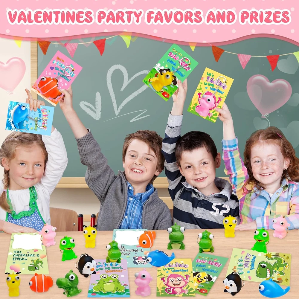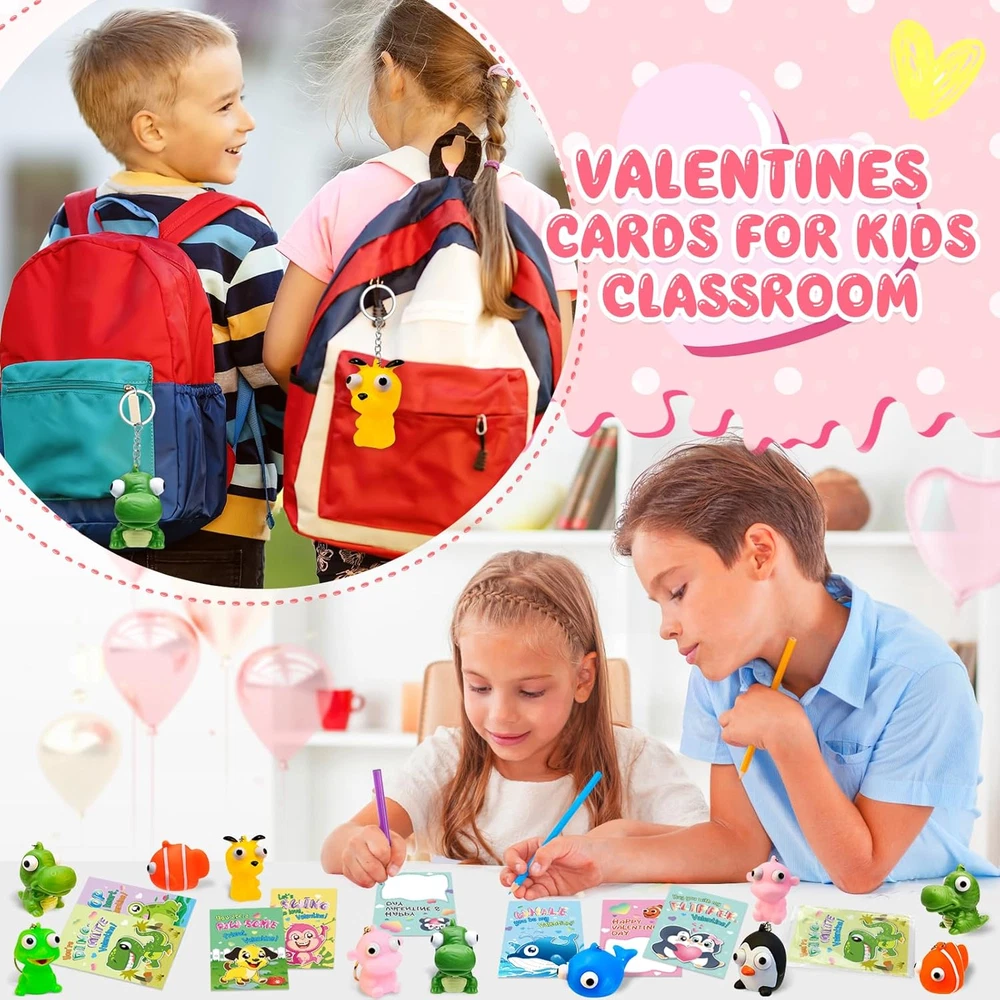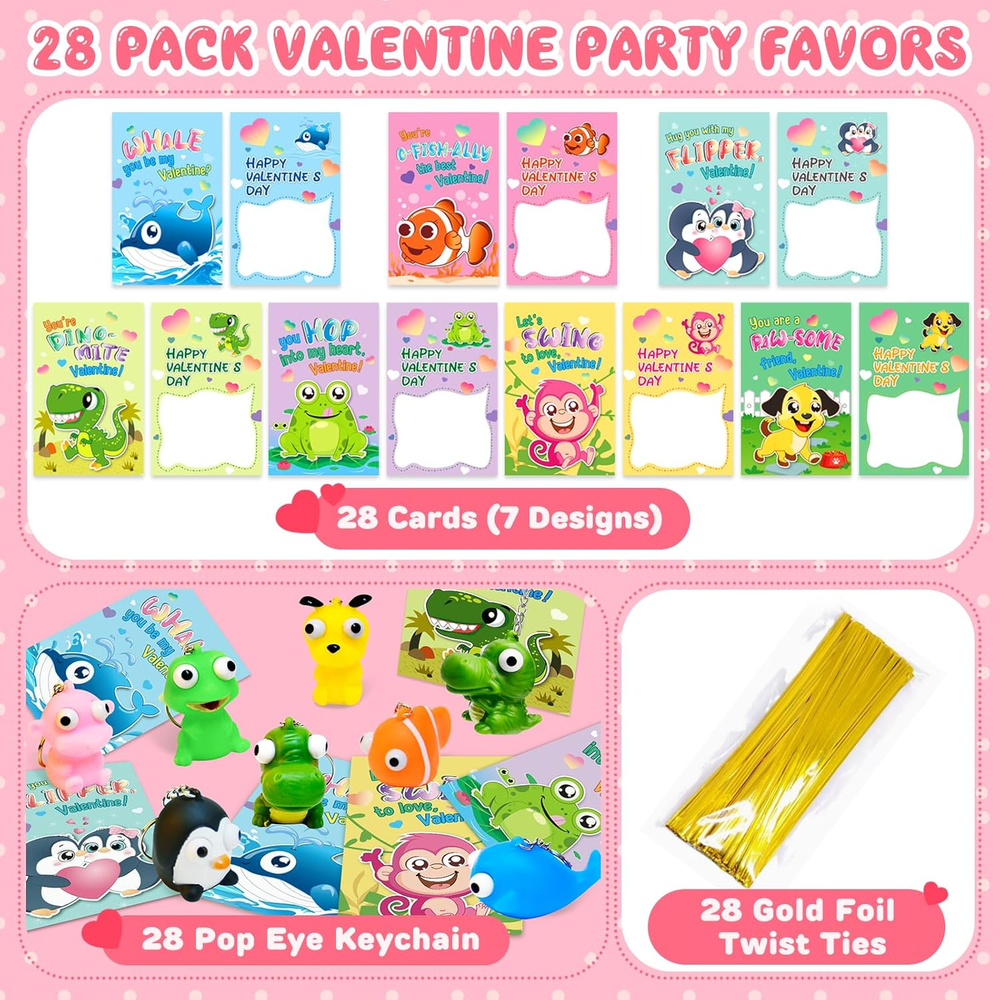 Great Valentine's Day Gift Set - If you're looking for a unique and funny Valentine's Day gift for kids, our popping eyes keychain is the perfect choice! This set includes 28 pcs cards + 28 animal keychains in 7 different styles. Each Valentines Card has a special blessing that matches the animal keychains. Quantity enough for your child to share with classmates. Let’s prepare interesting Valentine’s Day gifts for the kids! Great Valentine's Day Gift Set - If you're looking for a unique and funny Valentine's Day gift for kids, our popping eyes keychain is the perfect choice! This set includes 28 pcs cards + 28 animal keychains in 7 different styles. Each Valentines Card has a special blessing that matches the animal keychains. Quantity enough for your child to share with classmates. Let’s prepare interesting Valentine’s Day gifts for the kids! Funny Card Design - Compared with traditional Valentine's Day cards, our cards add more lovely cartoon elements and rich colors, making your child's gift stand out. Each Valentines card has a cute, humorous messages that uniquely match the animal keychains. Get ready to write blessings on the card and exchange it on Valentine’s Day, will bring endless fun to the kids. High Quality & Easy to Assembly - For the health and safety of children, we use high demanding quality standards. Animal keychains made of safety material, non-toxic, non-BPA. And the cards part is made of high quality coated paper, which is Clear printing and bright colors. The entire set of products has passed the children's product safety test and complies with US toy standards. Tie the keychain and card together with a twist tie, the unique Valentine's Day gift is ready! Fit for Various Occasions - This great value is Ideal gifts for kids valentines day gifts, school event prizes,valentines class exchanging gifts and other. By squeezing the animal, children can atisfying relax fun and entertaining, both entertaining and practical.We believe kids will like this, but if you are not satisfied for any reason, please let us know and we will refund your amount. Product Description