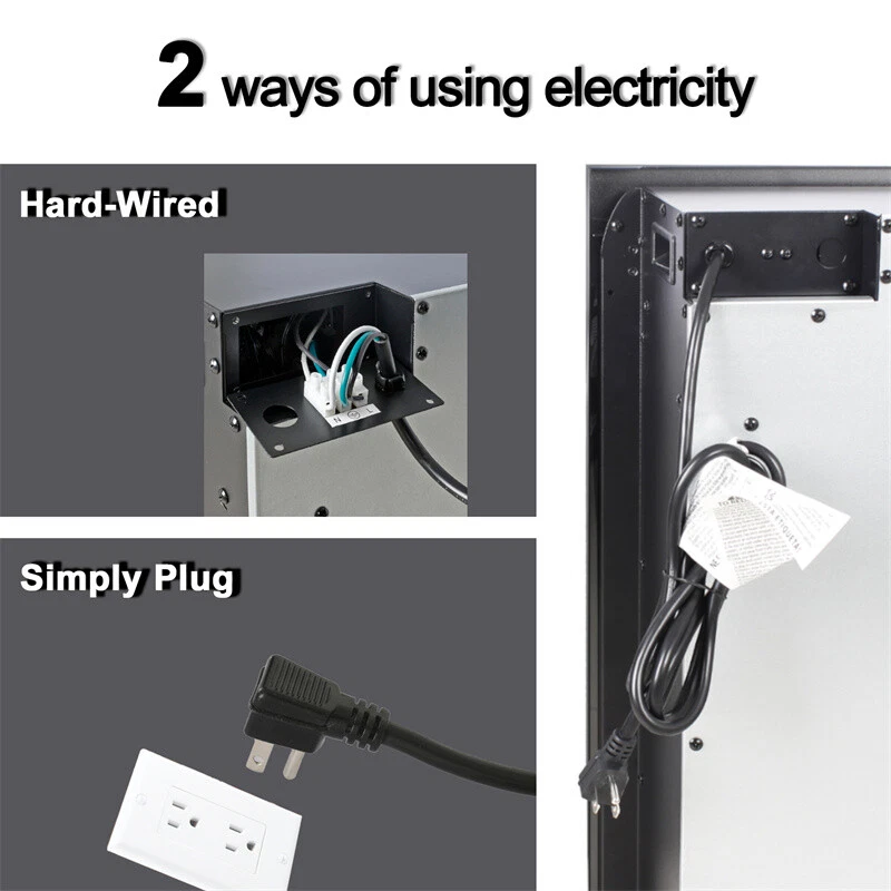 Specification Product Information Product Type:General Item Product Name:28inch Infrared Electric Fireplace Insert, Touch Panel Home Decor Heater, With Cracking Sound Main Color:Antique Black Main Material:Tempered Glass+Sheet Metal+Plastic Use Case:Primary Living Space Remote Included:yes Power Type:Electric Fireplaces Mount Type:Wall Mount Fuel Type:Electric Fireplaces Finishes:Powder Coated Vents:Vent Free Product Dimensions Assembled Length (in.):30.20 Assembled Width (in.):8.20 Assembled Height (in.):24.10 Weight (lbs.):39.57 Package Size Length (in.):33.15 Width (in.):11.42 Height (in.):27.95 Weight (lbs.):47.15 Product Features Electric Fairplace with CSA/UL certification ensures long time services and user's safety Double safety protection device, one is overheat protection device, automatically cut off when thetemperature is too high, the other one is fuse 1500W heat/ 5000 BTU's per hour provides supplemental heat up to 400 Sq. ft. 2 installation methods:Built in wall with surround trims&Insert to mantel from the front directly. 4 flame color and ember bed brightness can be adjust with 5 levels,flame speed can be adjust with 3 levels Timing function can set the time from 1 to 9 hours,don't worry about forgetting switching off this room heater or fire risk . 11 temperature settings ,64F to 82F,ON meas heater keep working,can enjoy the 3D flame with or without heat. The infrared quartz heat helps to maintain the natural humidity in the air, resulting in comfortable heat without drying out the room's Infra red remote control and high quality and sensitive touch button with clear digital display on the top right conner, no need stoop downand prevent to touch by pet mistake Two power supply connection methods: 1, Hardwired installation design 2. Simple plug -in cord.Users can choose the appropriate power connection method based on actual needs. Description Clear size description Dimension with Trim Kit:30.2 inch X 4.1nch X 8.2inch,Easy to install fix the trim kit and slid into the opening of your old fireplace. Digital display touch control panel and infrared remote control,it's so easy to operate for everybody. Realistic Flame & Adjustable Brightness The electric fireplace brings a warm and cozy atmosphere to your home. There are 4 style 3D Flame effect for you choose , the flame and ember bed brightness can be adjust with 5 levels,flame speed can be adjust with 3 levels.This will give your house a different kind of coziness. Two types of power connection In situations requiring convenience and flexibility, the plug-and-play connection method is a better choice; whereas in situations requiring stability and durability, the hardwired connection method is more suitable. Western Modern Fireplace with Fire Cracking Sound Realistic dancing flames and burning log effect, built-in speaker simulating the sound of charcoal cracking, give you a real fireplace-experience. Give your room a dreamlike ambiance