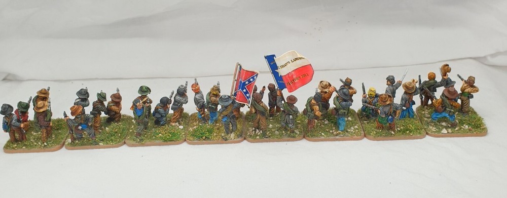 As per the photo a well painted unit of Confederate Infantry of the 1st Texas Regiment of the CSA. There are 32 figures based in fours on 40x40 mm bases. All figures finished to a high standard and have 3 coats of varnish. All figures are Dixons metal minis.