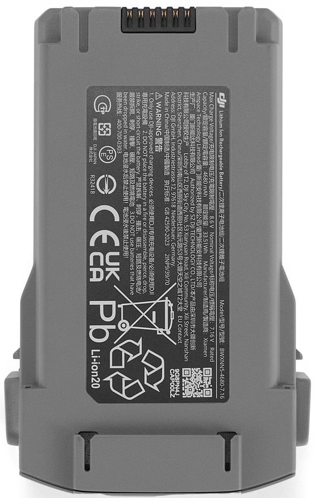 Overview The longest endurance time is 52 minutes *, allowing you to easily find the best parking spot, adjust the composition, and take off with a full load. *In a windless environment, the obstacle avoidance behavior of the aircraft is set to braking and the camera is set to photography mode. It was measured by flying forward at a speed of 25.2 kilometers per hour at sea level until a low voltage forced landing, for reference only. Please pay attention to the app prompts during actual flight. The results may vary to varying degrees in different external environments, usage methods, and firmware versions. Please refer to the actual experience for accuracy. Packing List Intelligent flight battery x 2 Technical Specifications Model: BWXNN5-4680-7.16 Capacity: 4680mAh Battery type: Li ion Charging environment temperature: 5 ℃ to 40 ℃ Compatible products DJI Mini 5 Pro