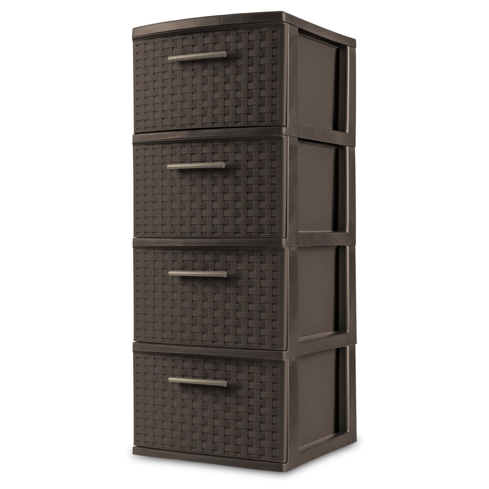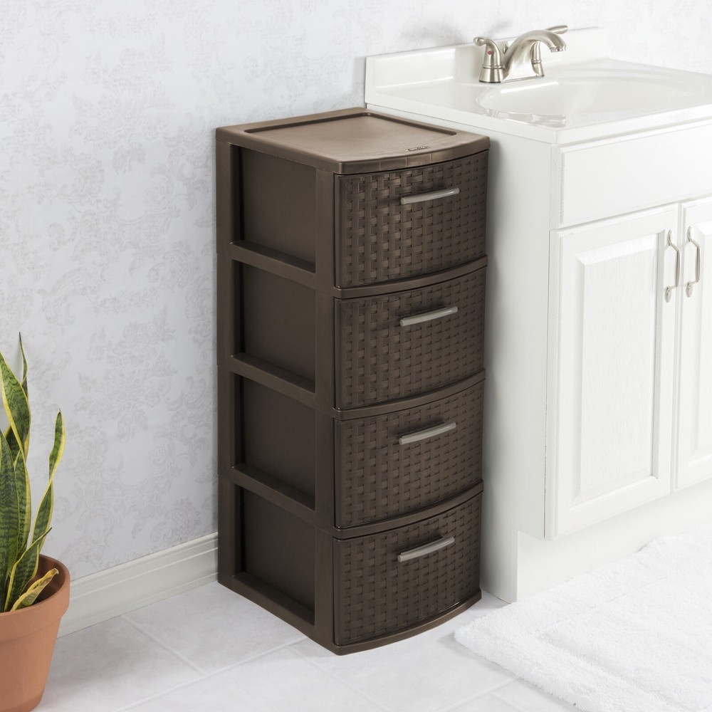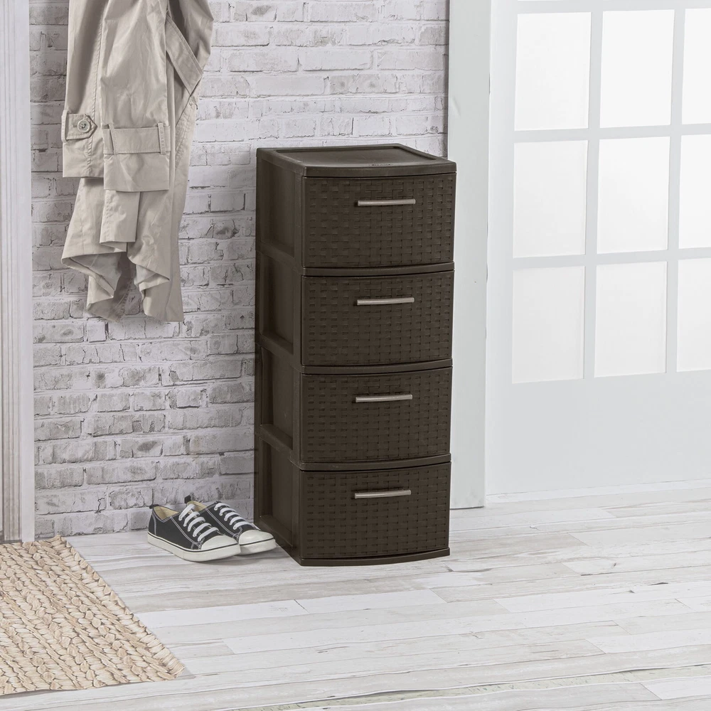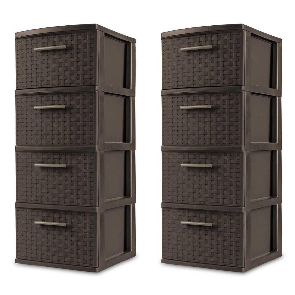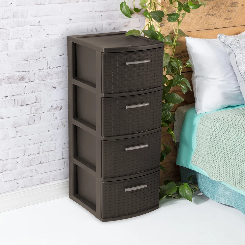 Kids Sliding Bin Toy Storage Organizer Box with 4 Storage Bins White Age 3+ 60.32 USD Free shipping Heavy Duty 18 Gallon Plastic Stackable Container Tote Bin Storage Box Set of 8 55.1 USD Free shipping US 4-Drawer Wide Plastic Storage Drawer Chest Home Closet Bedroom Cabinet Black 62.28 USD Free shipping Play 'n Store Lightweight Toy Chest Kids Storage Organizer Toy Box for Playroom 56.96 USD Free shipping 120 Qt Plastic Stackable Storage Boxes Set of 4 Home Containers Bins with Lids 65.52 USD Free shipping 12 Gal Plastic Stackable Container Bin Garage Utility Storage Box Tote 6 Pack US 62.38 USD Free shipping 32 Qt Latching Storage Box Plastic Stackable Container Bin with Lids Set of 6 54.06 USD Free shipping Case of 6 Nesting Wreath Box Really Red Wreath Storage Box Container with Handle 59.28 USD Free shipping Kid's 9 Plastic Bin Toy Box Storage Organizer Trunk with Chalkboard Side Panel 62.37 USD Free shipping US 19 Gallon Heavy Duty Plastic Storage Box Container Bin Utility Tote Set of 4 79.97 USD Free shipping Portable Locking File Chest Adjustable File Rails Letter/Legal Files Storage Box 59.28 USD Free shipping US 27 Gallon Plastic Stackable Storage Box Container Bins with Snap Lid Set of 4 65.52 USD Free shipping Organize visible storage areas with Sterilite’s Weave collection. These Weave Storage items combine style and function; the trendy look of weave with the convenience, durability and value of plastic to provide a variety of décor solutions for your living spaces. The 4 Drawer Weave Tower is ideal for "out in the open" storage needs. Four opaque drawers keep clutter controlled and concealed while providing access to frequently used items, where they are most often used. The easy pull handles allow drawers to open and close effortlessly, with a drawer stop to prevent drawers from being removed accidently. The overall assembled dimensions of this item are 15" D x 12 5/8" W x 31 3/4" H. Sterilite Adult Plastic 4 Drawer Weave Tower Plastic, Espresso, Set of 2: Outside Dimensions: 15" x 12 5/8" x 31 3/4" Set of 2 Espresso Interior Dimensions at bottom of drawer: 12 1/2" x 10" x 7" Stylish weave pattern in easy to clean, durable plastic is ideal for "out in the open" storage needs Versatile decorative storage solution is ideal for use throughout the home Opaque drawers keep contents concealed and clutter controlled Keep frequently used items contained and organized where they are most often used BPA-free and phthalate-free You may also like 15x6.00-6" Front Tire Assembly Replacement for Craftsman Riding Mowers 2-PCS US 66.8 USD Free shipping 71" Tall Adjustable Framed 5 Shelf Wood Bookcase Storage Shelving Wide Bookshelf 70.32 USD Free shipping 3 Drawer Letter Width Vertical File Cabinet with Pencil Drawer Storage Black US 69.0 USD Free shipping 40-50 Gallon Metal Aquarium Stand Fish Tank Stand Storage Cabinet w/Power Outlet 98.44 USD Free shipping Home 5-Shelf Wood Bookcase Adjustable Storage Shelving Book Wide Bookshelf NEW 56.23 USD Free shipping Pet Kennel for Cat Dogs Hard-Sided Plastic Pet Carrier Medium 28-in Length Crate 54.0 USD Free shipping C900054 905e AutoRight Multi-Purpose Steam Cleaner Car Cleaning Machine Portable 136.79 USD Free shipping 20 In 2 Cool Single-speed Steel BMX Girl's Bike Durable Steel Frame Satin Purple 98.0 USD Free shipping 40-50 Gal Fish Tank Stand Metal Aquarium Stand w/Cabinet&Power Outlets/LED Light 98.44 USD Free shipping 5 Gallon 3 HP Wet/Dry Shampoo Shop Vacuum Portable Shop Cleaner Vac Car Carpet 59.35 USD Free shipping 10' x 27' White Drawstring Carport Canopy Cover Outdoor Garden Shelter Cover US 86.04 USD Free shipping 120V Corded Electric Impact Wrench Gun 7.5-Amp 1/2''High Power Driver PCE211 US 82.95 USD Free shipping On Feb 6, 2025 at 02:18:37 PST, seller added the following information:
