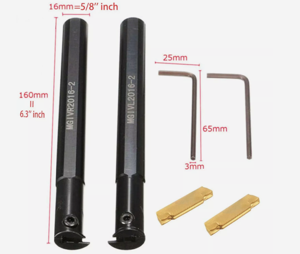 2PCS 5/8" MGIVR2016-2 MGIVL2016-2 Lathe Boring Bar Grooving Cut-Off Tool Holder with 2PCS MGMN200-G NC3020 Insert Description: Features: Model:1PCS MGIVR2016-2 + 1PCS MGIVL2016-2 + 2PCS MGMN200-G NC3020 Shank Diameter: (5/8" inch / 16*16mm) ; Overall Length:( 6.3" inch / 160mm) Grooving holder : Each tool holder is black oxidized smooth surface and tool hardness (HRC 48 degrees up and down) and precision are up to the first grade. Insert : Turning inserts exquisite workmanship, high strength, high toughness, stable and durable. Product Details: Package Dimensions : 7.44 x 2.32 x 1.38 inches; 1.22 Pounds Item model number : 01