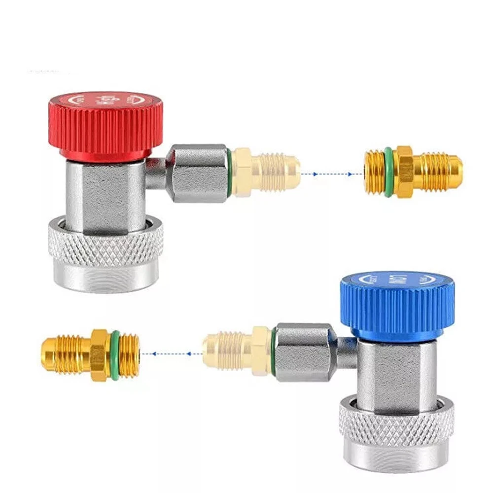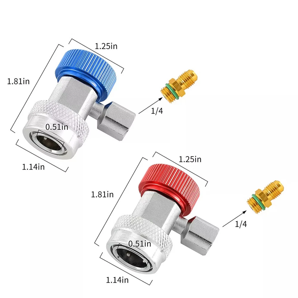 Product Description Features: This 90 Degrees Quick Connectors set can provide a reliable and safe valve accessory to system at working pressure. Compatible with R134 service ports, 1/4" male flare. Side fitting for A/C manifold gauge set (R-134A) type. Specifications: Material: Brass and metal Red: High Side Quick Connector/Adapter (1/4" SAE Male Flare) Blue: Low Side Quick Connector/Adapter (1/4" SAE Male Flare) Package includes: 1 x High side quick connector 1 x Low side quick connector If you have any doubts or uncertainty about this item, contact us with no hesitation, we are always here and will solve your problems. Thanks and wish you a nice day! About Us We dedicated to provide excellent products and services for all customers on ebay. hope we all can have a nice experiences on eBay. Payment We accept all verified payment through PAYPAL payment. Shipping Usually, Item will be shipped within 1-2 working day after full payment is received. Normally, you will receive the item in 5-7 days. Please contact us if you don’t receive the items after 10 working days after the payment If you have any questions about shipping, please feel free to contact us. Returns Always believe we can solve problems by communication if it comes to any problems about products or any others. If it comes to a return, the products must be intact and as original when you received, and should be within 30 days after you received it. Contact Us Work time: 9:00 AM to 18:00 PM Beijing Time You can contact us at anytime you want, we will reply all messages at the first time. powered by