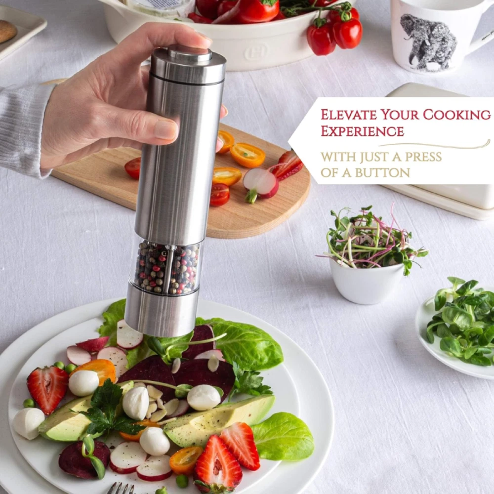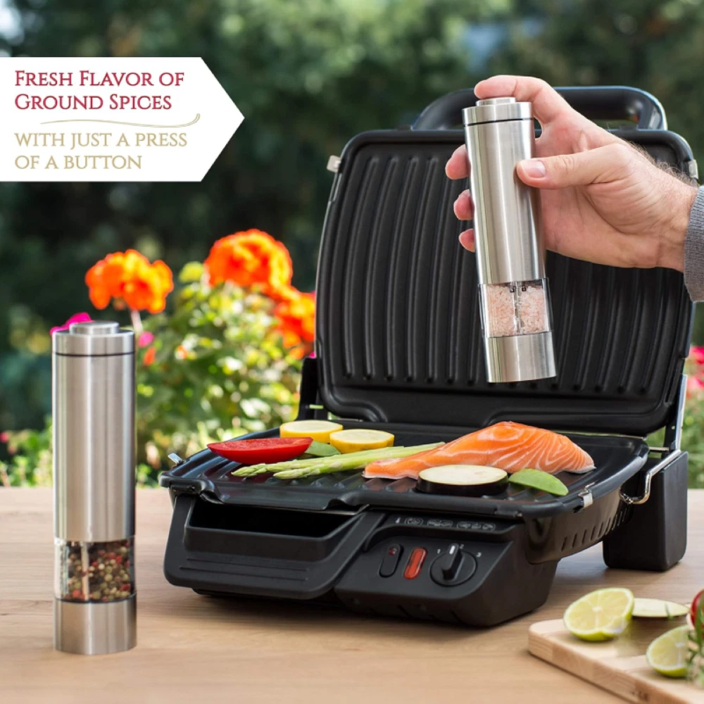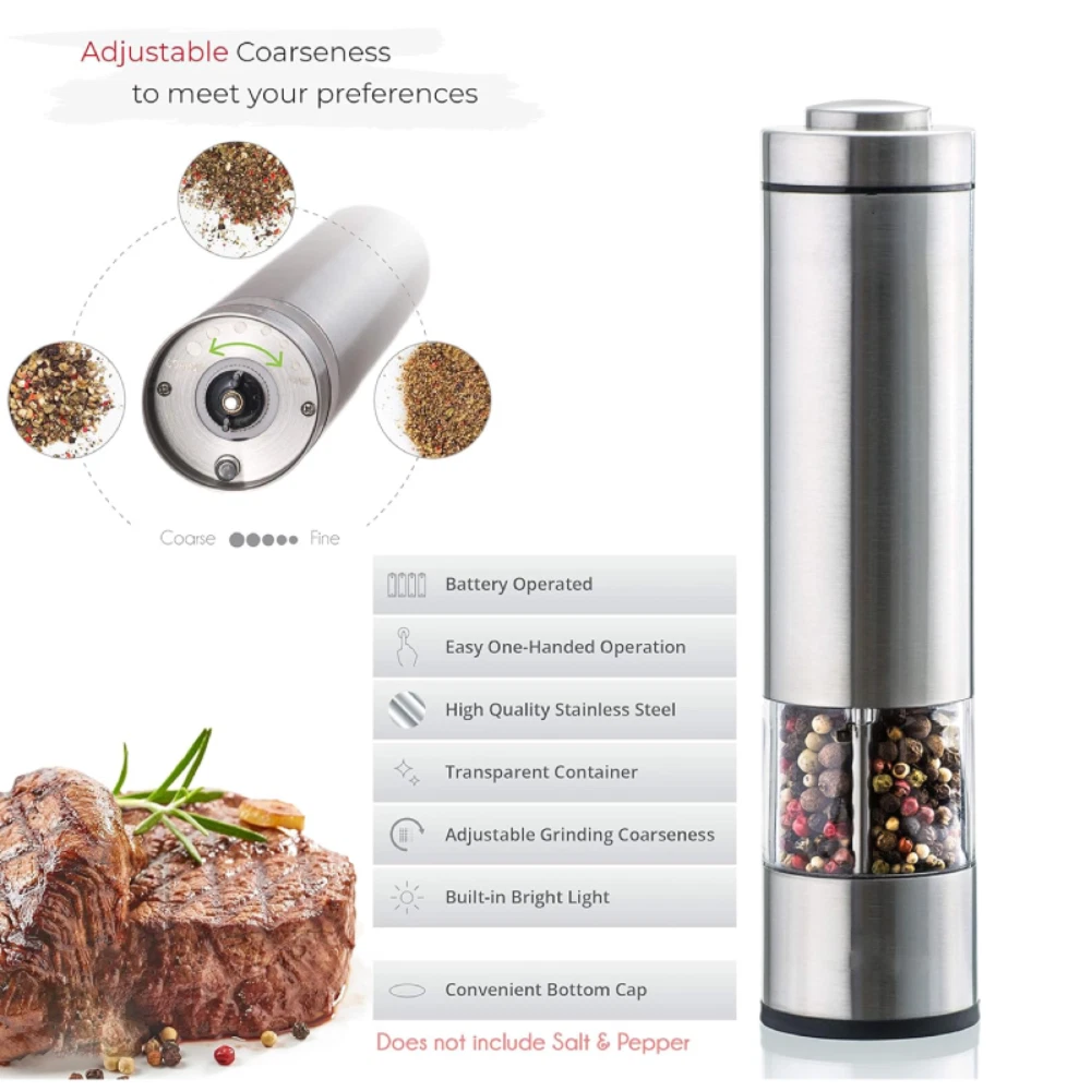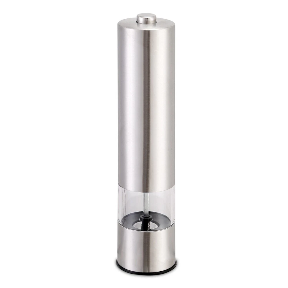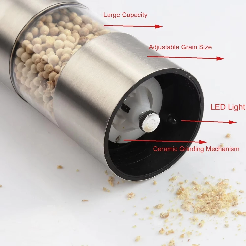 Features: *ELECTRIC PEPPER GRINDER FOR TIME & ENERGY SAVING:Still manually grind pepper,which waste time and energy? Our electric salt & pepper grinder is battery operated to save your time and energy. Also it's economical and practical,ideal for cooking in the kitchen and grilling BBQ outside and also is a stylish addition to your kitchen and dinner table. *CONVENIENT ONE HAND OPERATION:The premium salt and pepper grinders are battery operated and incredibly easy to use with their smart one-hand design so you can season your food with just the push of a button. *PREMIUM QUALITY MATERIALS:Electric salt and pepper grinders are made of the highest quality stainless steel and BPA-free acrylic glass and have a rustproof ceramic core to ensure smooth and easy grinding. *COARSENESS ADJUSTABLE:Feature coarseness adjustment,which makes it easy to adjust the coarseness for perfect grind and seasoning. *CONSIDERATE DESIGN:Designed with a light to make it clearer & easier to add the right amount of pepper or salt to your dish. Bottom caps prevent leakage and keep your salt and pepper fresh in humid environment. Warm Note: 1. The grinding particles should be less than 8mm/0.31in,if over,please break them before grinding. 2. Suggest fry the pepper before grinding,which makes pepper taste better. 3. Suggest not wash with water,just wipe the external with rag,and grind rice to clean the ceramic core(adjust to coarse status before cleaning). Specifications: Brand: iMounTEK Product Type: Electric Salt & Pepper Grinder Material: Stainless Steel + Acrylic Glass + Ceramic Core Color: Silver Battery Required: 4 x AA Batteries (Not Included) Capacity: 50ml or so Application: Pepper, aniseed, Coarse Salt, Sichuan Pepper, etc. Pepper Size Required: Less Than 8mm/ 0.31in Product Size: 5.5x5.5x21.8cm/ 2.17x2.17x8.58in (LxWxH) Product Weight: 277.5g/ 0.61lbs Package Size: 6x6x23cm/ 2.36x2.36x9.06in (LxWxH) Package Weight: 314g/ 0.69lbs Package Contents: 2 x Electric Salt & Pepper Grinder 2 x User Manual