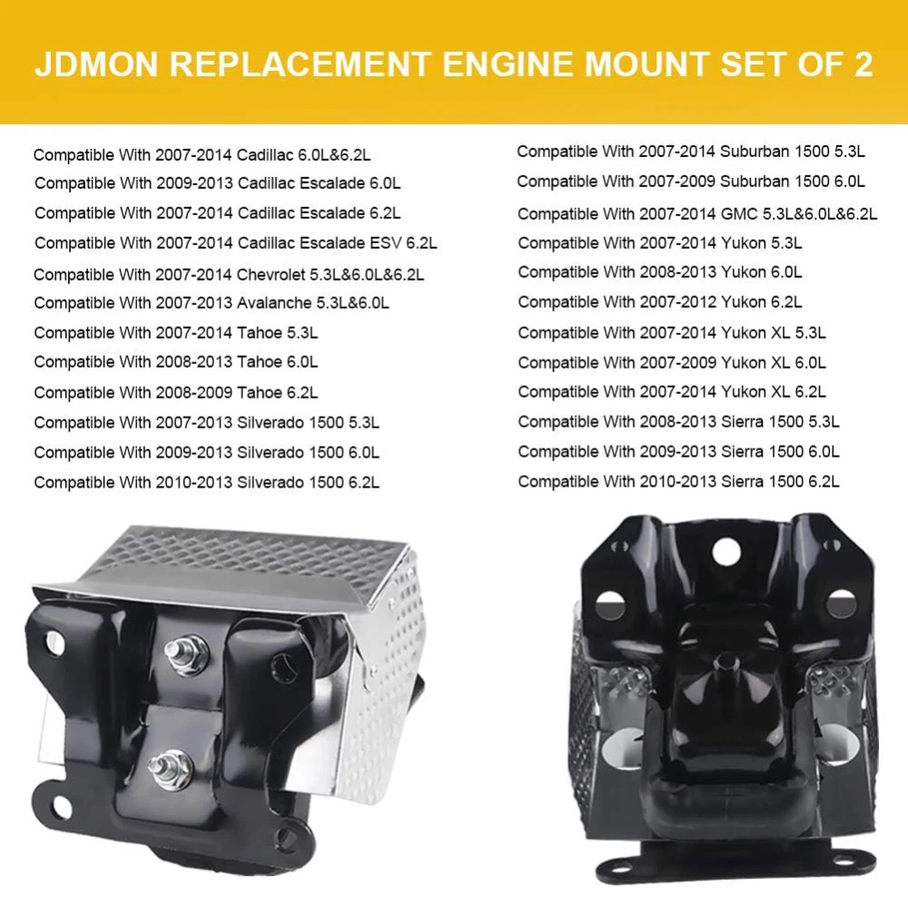 WHY OUR CUSTOMERS KEEP SHOPNG WITH US ✅All items are covered by manufacturer warranty. ✅FAST FREE SHIPPING. ✅Most orders ship within 1 business day with Tracking Number. Customer also can choose two-day or expedited shipping. ✅100% customer satisfaction is backed by a 30-Day Money Back Guarantee for New items and a 30-Day Money Back Guarantee for Recon. FEATURES Benefits of Replacing Broken Engine Mounts: Reduce the engine noise and shock. Protect the engine and prolong its service life. Keep your car engine stable, which will improve your driving comfort, smoothness and driving safety. 2PCS Engine Motor Mount for Chevy Silverado GMC Sierra Cadillac 5.3L 6.0L 6.2L WHY OUR CUSTOMERS KEEP SHOPNG WITH US ✅All items are covered by manufacturer warranty. ✅FAST FREE SHIPPING. ✅Most orders ship within 1 business day with Tracking Number. Customer also can choose two-day or expedited shipping. ✅100% customer satisfaction is backed by a 30-Day Money Back Guarantee for New items and a 30-Day Money Back Guarantee for Recon. FEATURES Benefits of Replacing Broken Engine Mounts: Reduce the engine noise and shock. Protect the engine and prolong its service life. Keep your car engine stable, which will improve your driving comfort, smoothness and driving safety. Fitment: JDMON Engine motor mount compatible with Cadillac Escalade 6.0L, 6.2L 2007-2014, Compatible with Escalade ESV 6.2L 2008-2014 , Compatible with Avalanche 2003-2014 , Compatible with Silverado 1500 5.3L, 6.0L, 6.2L 2007-2013, Compatible with Suburban 1500 5.3L, 6.0L 2007 - 2014, Compatible with Tahoe 2007 - 2014 , Compatible with Sierra 1500 2008 - 2013, Compatible with Yukon & Yukon XL. Please check the fitment carefully before purchasing. Replacement for Part Number: SUSUCAR Engine motor mount replaces 15854941, 15854939, A5365 , MK5365 5365. Package Includes: 2* Engine mounts High Strength and Durable: Our engine mounts are made from premium iron, aluminum and rubber, which has good durability and can withstand long-term use and various complex working conditions, reducing the frequency of maintenance and replacement. Recommendation and Services: The installation of auto parts is a very professional work, we strongly recommend that you install it under the guidance of professionals. If you have any questions, please feel free to contact us. FITMENTS Compatible with Chevy: Compatible with Avalanche 5.3L&6.0L 2007-2013/Compatible with Tahoe 5.3L 2007-2014 Compatible with Tahoe 6.0L 2008-2013/Compatible with Tahoe 6.2L 2008-2009 Compatible with Silverado 1500 5.3L 2007-2013/Compatible with Silverado 1500 6.0L 2009-2013 Compatible with Silverado 1500 6.2L 2010-2013/Compatible with Suburban 1500 5.3L 2007-2014 Compatible with Suburban 1500 6.0L 2007-2009 Compatible with GMC: Compatible with Yukon 5.3L 2007-2014/Compatible with Yukon 6.0L 2008-2013 Compatible with Yukon 6.2L 2007-2012/Compatible with Yukon XL 5.3L 2007-2014 Compatible with Yukon XL 6.0L 2007-2009/Compatible with Sierra 1500 5.3L 2007-2013 Compatible with Sierra 1500 6.0L 2007-2013/Compatible with Sierra 1500 6.2L 2007-2013 Compatible with Cadillac: Compatible with Cadillac Escalade 6.0L 2009-2013 Compatible with Cadillac Escalade ESV 6.2L 2007-2014/Compatible with Cadillac Escalade 6.2L 2007-2014 OEM NUMBER 15854941/15854939/ A5365 /MK5365 /5365 ITEM INCLUDES 2* engine mount FREE RETURN If you are unhappy with your purchase for any reason, you can return it to us in an un-used condition in the original packaging within 30 days of purchase and we'll give you a refund or exchange. The refund/Exchange will not include postage/eBay costs. Please note you MUST contact us to obtain a Return Authorization Number before returning any part. Any parcel without the Return Authorization Number will be rejected *If your item is faulty or was incorrect, you must contact our sales representative before returning the parcel and we will endeavour to solve the problem effectively. Video or picture is required to show the item 、condition before we issue the Return Authorization Number. * Professional installation is highly recommended (No Instruction Included) * For any needs please contact us Item Specifics Brand : susucar Items Included : Engine Motor Mount with Heat Shield Type : Engine Mount Kit Number in Pack : 2 Placement on Vehicle : Front Rear OE/OEM Part Number : 15837373, 15837375, 15854939, 15854940, 15854941 Interchange Part Number : 15878845, 3211 A5365, 5365, MK5365, 5365MK Material : composite metal and molded rubber Item Weight : 10.58 pounds Fitment Type : Direct Replacement OE Spec or Performance/Custom : OE Spec About My Store : 100% SATISFACTION, 100% Source manufacturer Manufacturer : SUSUCARpartsWhosale Manufacturer Warranty : 2 Years Why choose US? Susucar is passionate about maintaining our culture of demonstrating value and building personal client relationships in perfecting the client experience. We are also a culture of giving back to the community and preserving our precious planet - a passion that runs deep throughout our Company. Every single item we sell goes through thorough inspection processes to make sure it works perfectly for you. If for any reason you are not satisfied with our product, please shoot us a message. We will do everything in our power to make things right Returns and Exchanges Hassle Free Returns! All our new and refurbished products come with a 30-Day Free Return Policy. If you would like to return your item and you are within 30 days of the purchase, and it is still in its original condition, you can request a return label and return the item by contacting us through eBay messaging. We offer Free Returns in the USA and will provide you with a prepaid return label. Once the item has been received and verified, a refund of the purchase price and any taxes paid will be issued. Shipping & Payment Policy Ground Shipping is always Free within the US (48 contiguous states)! Once payment is received, your order will be processed a