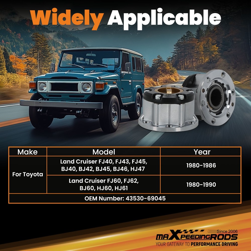 carpartsharehouse Home | Contact us | Promotion Fast hipping International Shipping 30 Days Return Policy Secure Shopping 2PCS Free Wheel Hub Locking Manual Lock for Toyota Land Cruiser w/30 spline Most Competitive Price Manufacturer We know our products Easy Return Quick, Simple Guaranteed Fitment Always the correct part DESCRIPTION Note:Please turn screw vertically into the mounting hole when installing !!! Locking Hub for Toyota LandCruiser FJ40 FJ45 FJ60 FJ62 BJ40 BJ42 BJ60 Fit for 8/80-4/86 for Toyota Land Cruiser FJ40, FJ43, FJ45, BJ40, BJ42, BJ45, BJ46, HJ47 8/80-1/90 for Toyota Land Cruiser FJ60, FJ62, BJ60, HJ60 OEM number 43530-69045 Quantity 1 Pair(2 pieces,as pictures show) Splines 30 (NOT for leaf springs models) Notice -Please turn screw vertically into the mounting hole!!! - Instruction is not included. Professional installtion is recommended. - Please contact us for whatever we can help. SHIPPING US Domestic Shipping Notice - All items will be dispatched within 24hrs(Mon-Fri) Our carrier collects all the parcels at 4:30am PDT, any payment paid after 5:00am PDT will be shipped the next day at 4:30am PDT. If you paid Item Shipped On Est.Delivery Time Before Apr. 1st at 4:30am Apr. 1st at 5:00am Apr. 5th - Apr. 7th After Apr. 1st at 4:30am Apr. 2nd at 5:00am Apr. 6th - Apr. 8th If our estimated delivery time and eBay’s are contradictory,please refer to the standard delivery time of ours. Estimated Delivery Time From To Service Est.Delivery Time US US UPS or Fedex Ground 3-5 Business days Outside of US DHL FedEx 4-7 Business days Please provide the following shipping information for your order Otherwise your shipment will be deferred. We are not responsible for any shipping lost caused by wrong shipping information International Shipment For international shipment, we do not cover any import taxes or duties. Import tax is charged by the government, not us. Our item price and shipping cost do not include any import tax which will be charged by the shipping company when you got the parcel. Please be noted that is not the extra shipping fee. WARRANTY We aim to provide you the good buying experience, 30 days return policy is offered in our store. Please follow our return policy before you return any item(s): If you are unhappy with your purchase for any reason, you can return it to us in an un-used condition in the original packaging within 30 days of purchase and we'll give you a refund or exchange. The refund/Exchange will not include postage/eBay costs. Please note you MUST contact us to obtain a Return Authorization Number before returning any part. Any parcel without the Return Authorization Number will be rejected. If your item is faulty or was incorrect, you must contact our sales representative before returning the parcel and we will endeavour to solve the problem effectively. Video or picture is required to show the item condition before we issue the Return Authorization Number. All VehicalPartsLearder products have 2 year warranty (unless otherwise stated) Important notice: 1. Any returned item(s) without Return authorization number will be rejected. 2. Please return your item(s) in original packaging and ensure that all packages are securely wrapped 3. We will not accept responsibility for loss or damage of goods during transit, please ensure that the insurance cover option is taken where possible 4. Upon receipt, all products will be inspected at our discretion in 3-5 business days. Then, the updated result will be informed. If you have made a mistake on purchase and wish to cancel the order before it is dispatched please contact us by ebay message as quickly as possible. Note: All parcel will be collected by carrier at 8:00am on Monday to Friday. F A Q Will this fit my car? We have used the eBay compatibility list as a guide for buyers to use, but the eBay data system is not accurate and incomplete sometimes. Please make sure you have read through the whole listing and paid attention to “note” and “notice”. If there is any uncertain, please use the eBay message to check with our sales first. How much does delivery cost and how long will it take? You can check the delivery cost in the listing “Shipping and payments” section by selecting your country and entering your zip code. If it is not specified, please provide us your shipping address and zip code via eBay message. For UK domestic shipping, the delivery time is around 2-3 business days. The international shipment delivery time is around 4-7 business days. What payment methods do you accept? We currently only accept payment via PayPal. You can also use PayPal as a guest and pay using a debit or credit card. When will my order be dispatched? We will arrange the shipment in 1 business day after the payment is cleared. The tracking number will be updated on eBay in 24 hours after the shipment. Please notice that there is no shipment during weekend and holidays. Can I amend my order? Sorry no. Once the payment is cleared, we cannot amend any item(s), quantities, or add or remove items. We are also unable to change the delivery address. Therefore, please double check all the order information before making payment. What do I do if I have not received my order? Please simply contact us via eBay messages, and then, we will get back to you as soon as possible with the update. Usually, we will follow up every shipment till customers get their order. What do I do if my product is faulty? Please simply contact us via eBay messages, and then, we will get back to you as soon as possible. It will speed up the process if you could provide us some pictures or video to illustrate the issue details. 1 Pair Universal Retractable Seat Belts 3 Point Retractable Safety Strap Belts CT20 Turbo Turbocharger for Toyota 4-Runner / Hiace /Landcruiser 2.4L 2L-T 1984-