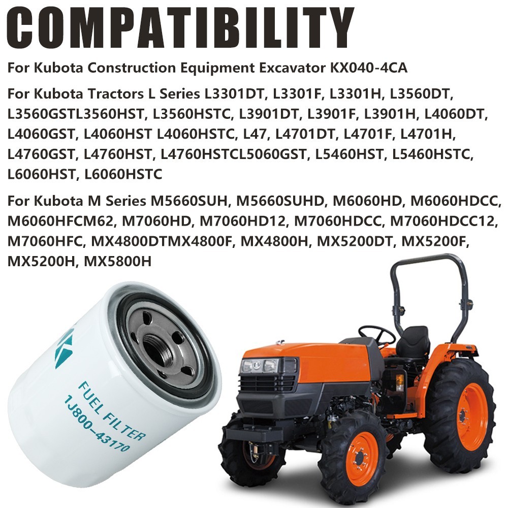 Part Number 1J800-43170, 1J800-43172, SN25220, 600383, FC10121, SFF68235, WF10383, FF42110 Compatible with For Kubota Constr uction Equipment Excavator KX040-4CA For Kubota Tractors L Series L3301DT, L3301F, L3301H, L3560DT, L3560GST, L3560HST, L3560HSTC, L3901DT, L3901F, L3901H, L4060DT, L4060GST, L4060HST, L4060HSTC, L47, L4701DT, L4701F, L4701H, L4760GST, L4760HST, L4760HSTC, L5060GST, L5460HST, L5460HSTC, L6060HST, L6060HSTC For Kubota M Series M5660SUH, M5660SUHD, M6060HD, M6060HDCC, M6060HFC, M62, M7060HD, M7060HD12, M7060HDCC, M7060HDCC12, M7060HFC, MX4800DT, MX4800F, MX4800H, MX5200DT, MX5200F, MX5200H, MX5800H Package Included 2 x Fuel Filter Payment We accept payment via Paypal,Google Pay,VISA,Master Card,American Express,Discover,eBay Mastercard payment . Shipping All items will be shipped to buyer's eBay address. Please make sure your address in eBay matches the address you would like us to ship to before payment. Easy Return If you are unhappy with your purchase for any reason, US buyers can return it to us in an un-used condition in the original packaging within 30 days of purchase and we'll give you a refund or exchange. The refund/Exchange will not include postage/eBay costs. Please note you MUST contact us to obtain a Return Authorization Number before returning any part. Any parcel without the Return Authorization Number will be rejected. If your item is faulty or was incorrect, you must contact our sales representative before returning the parcel and we will endeavour to solve the problem effectively. Video or picture is required to show the item condition before we issue the Return Authorization Number. Important notice: 1. Any returned item(s) without Return authorization number will be rejected. 2. Please return your item(s) in original packaging and ensure that all packages are securely wrapped. 3. We will not accept responsibility for loss or damage of goods during transit, please ensure that the insurance cover option is taken where possible. Feedback We aim to maintain high standards of service and strive to achieve 100% customer satisfaction! Your feedback is very important to us, and we sincerely hope that you can contact us immediately before providing us with neutral or negative feedback, so that we can solve your problem satisfactorily.