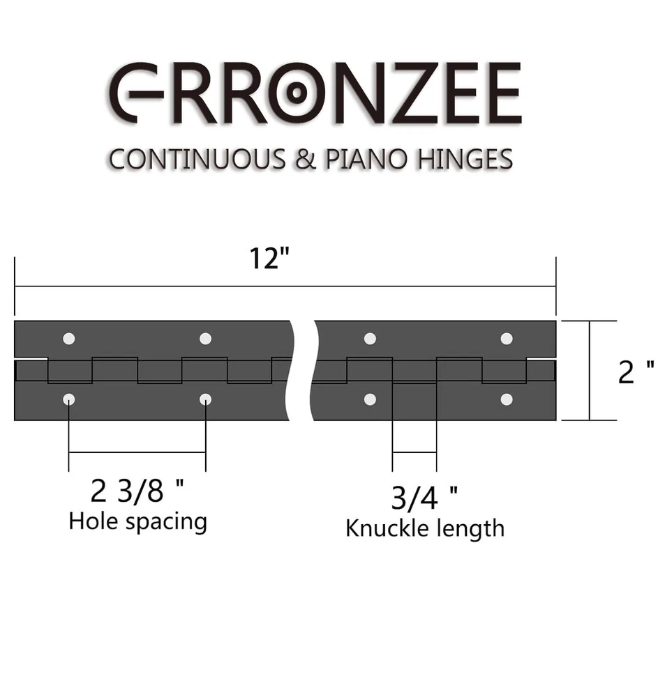 2Pack Piano Hinge with Holes, 304 Stainless Steel 2" Open Width x 12" Continuous Hinge, 0.047" Leaf Thickness, Screws included How to Install a Piano Hinge Cut the piano hinge to length with a hacksaw and file down any rough edges. Mark the location of the screw holes using a hinge center punch. Drill pilot holes and attach the hinge. Features: Made of 304 Stainless Steel Bright nickel finish Screws included 2 3/8 in. spacing between the screw holes Designed to be cut to any desired length Specifications: Hinge Type: Piano Mount Type: Screw-On Material: 304 Stainless Steel Leaf Thickness: 0.047" Overall Width: 2" Pin Material: 304 Stainless Steel Knuckle Length: 3/4" 【Heavy Duty Piano Hinges】The Continuous Piano Hinges are Composed of extremely durable 0.047" thick 304 Stainless Steel with polished surface, rust proof, durable and prevents misalignment. 【2PCS 12" Piano Hinge】Package Include 2pcs 12in continuous hinge, It includes screws, and there are 2 3/8 in. spacings between each screw hole. Each knuckle of continuous hinge is a load-bearing point, providing uniform strength and smooth pivot action; friction-type pins won't fall out. 【Easy to Cut】This 2 in. x 12 in. continuous hinge can be cut to the length needed for your project and it is ideal for wood working project, RV project, folding tables, cabinets, tool sheds, chests and cabinets. 【Countersunk Mounting Holes】12 inch hinges with holes have countersunk mounting holes to aid surface-mounting to door or frame. They provide more stability than traditional hinges, making them ideal for heavier doors and lids that require extra support. 【Heavy Duty Conceal Box Hinges】The piano hinges offer continuous supports along the entire length of the door and lid for durability. Continuous hinges are ideal for various doors, cabinet, tool box, wooden box, gift box.