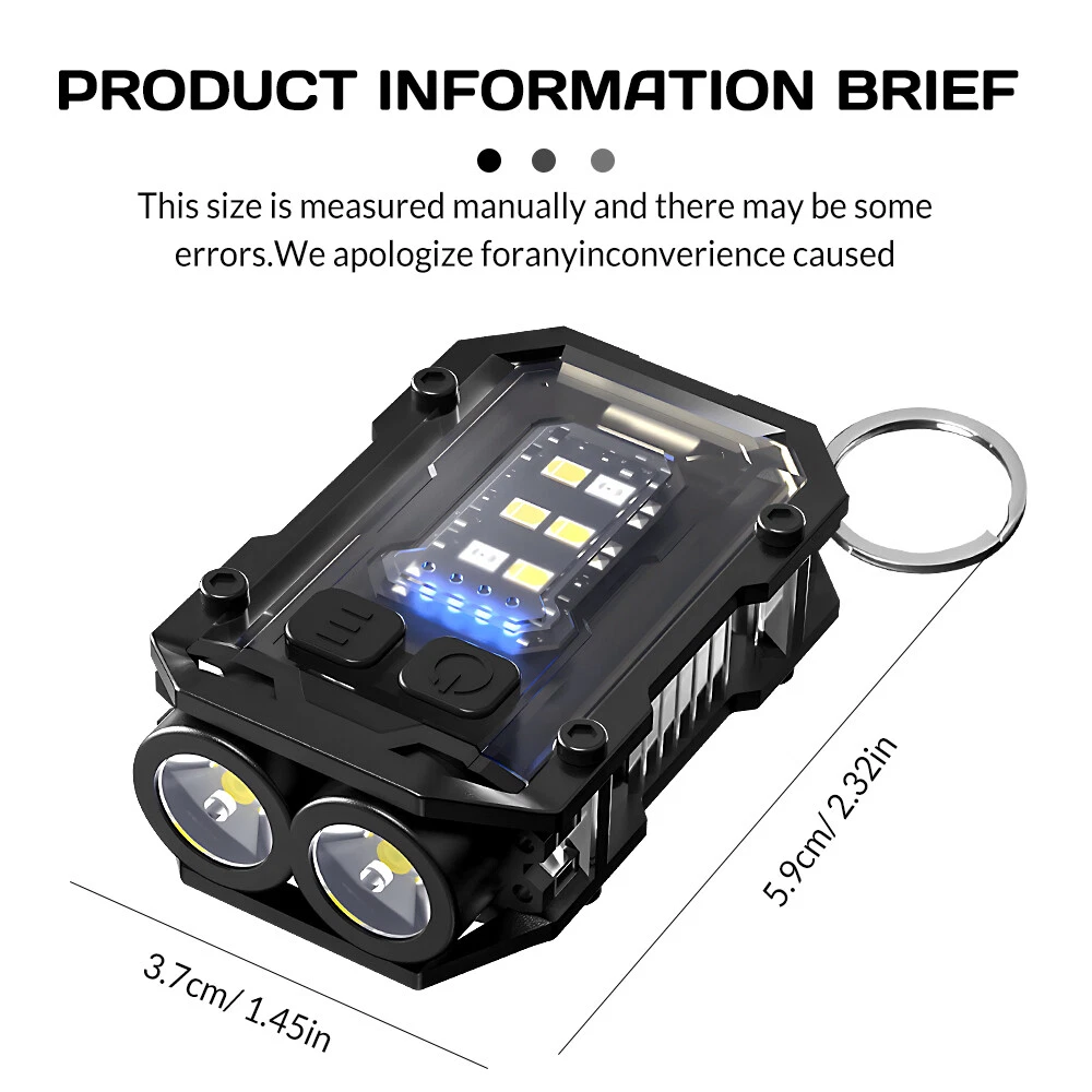 Product Description Purchase Specification: Light bulb: 2 * XTE+4 * COB+1 * LED red light+1 * LED blue light Material: Zinc alloy+Acrylic+ABS Switch: Double press switch Battery: Built in 1 * 800mAh polymer battery Charging method: Type-C USB charging Charging time/battery life: Charging time: ≤ 3H battery life: 3-4 hours Left gear button: 1 * XTE Strong Light -1 * XTE Weak Light -2 * XTE Strong Light -2 * XTE Weak Light Right click: Side light 4 * COB strong light - Side light 4 * COB weak light - LED red light - LED red blue light flashing Long press to turn on/off, click to shift gears Zoom mode: None Waterproof grade: IPX4 Lumen/Range: ≤ 2000lm ≦50m Features: Compact and exquisite, with pen clip and magnet for easy carrying Indicator light: 4 blue LEDs Power indicator: 25% -50% -75% -100% After turning on the light, the LED blue light stays on for a long time. When charging, the LED blue light flashes Product color: Black The package includes : Flashlight USB line English manual Color box