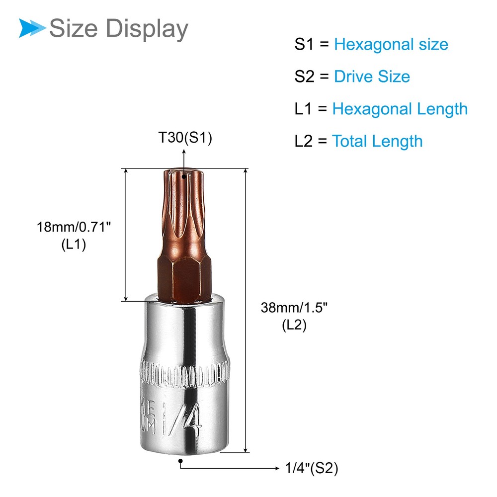 Document Attributes: * Driver Size: 1/4 Inch* Bit Size: Torx T30* Bit Length: 18mm / 0.71 Inch* Total Length: 38mm / 1.5 InchWhat Is Included: * 2 Pieces x Bit SocketsApplications & Features: --- The Bit Socket is made of S2 alloy steel with high hardness and strong rust resistance. The chromium-vanadium steel sleeve increases the rotation power.--- The drill bit end is chamfered for smooth fastener insertion and protects the drill bit and fasteners from edge damage. Stamped size markings for easy identification.--- Bit sockets are hand repair tools for fastener applications that can help you repair cars, bicycles, motorcycles, machinery, appliances, home improvement construction, woodworking, etc.--- The square drive end is suitable for driving ratchets or extensions, preventing them from falling out. When used with a ratchet, it increases the speed of tightening hex drive fasteners.Useful Tips: --- Ensure that the socket securely fits the hex fastener before applying force. Avoid using excessive force to prevent damage to the socket or the fastener. Regularly inspect the socket for signs of wear or damage, and replace it if necessary. 2PCS Torx Bit Socket Metric T30 Bit 1/4-Inch Drive 1.5" Long Steel CR-V Socket Attributes: * Driver Size: 1/4 Inch * Bit Size: Torx T30 * Bit Length: 18mm / 0.71 Inch * Total Length: 38mm / 1.5 Inch What Is Included: * 2 Pieces x Bit Sockets Applications & Features: --- The Bit Socket is made of S2 alloy steel with high hardness and strong rust resistance. The chromium-vanadium steel sleeve increases the rotation power. --- The drill bit end is chamfered for smooth fastener insertion and protects the drill bit and fasteners from edge damage. Stamped size markings for easy identification. --- Bit sockets are hand repair tools for fastener applications that can help you repair cars, bicycles, motorcycles, machinery, appliances, home improvement construction, woodworking, etc. --- The square drive end is suitable for driving ratchets or extensions, preventing them from falling out. When used with a ratchet, it increases the speed of tightening hex drive fasteners. Useful Tips: --- Ensure that the socket securely fits the hex fastener before applying force. Avoid using excessive force to prevent damage to the socket or the fastener. Regularly inspect the socket for signs of wear or damage, and replace it if necessary. Hot Item Payment 1.We accept eBay payment . 2.Payment must be received within 7 business days of auction closing. Shipping 1.We ship to your eBay or Paypal address. Please make sure your eBay and Paypal address is correct before you pay. 2.Items will be shipped within 1-3 business day when we received payment. 3.Delivery time depends on destination and other factors. Description Policy 2PCS Torx Bit Socket Metric T30 Bit 1/4-Inch Drive 1.5" Long Steel CR-V Socket Attributes: * Driver Size: 1/4 Inch * Bit Size: Torx T30 * Bit Length: 18mm / 0.71 Inch * Total Length: 38mm / 1.5 Inch What Is Included: * 2 Pieces x Bit Sockets Applications & Features: --- The Bit Socket is made of S2 alloy steel with high hardness and strong rust resistance. The chromium-vanadium steel sleeve increases the rotation power. --- The drill bit end is chamfered for smooth fastener insertion and protects the drill bit and fasteners from edge damage. Stamped size markings for easy identification. --- Bit sockets are hand repair tools for fastener applications that can help you repair cars, bicycles, motorcycles, machinery, appliances, home improvement construction, woodworking, etc. --- The square drive end is suitable for driving ratchets or extensions, preventing them from falling out. When used with a ratchet, it increases the speed of tightening hex drive fasteners. Useful Tips: --- Ensure that the socket securely fits the hex fastener before applying force. Avoid using excessive force to prevent damage to the socket or the fastener. Regularly inspect the socket for signs of wear or damage, and replace it if necessary. Hot Item Payment 1.We accept eBay payment . 2.Payment must be received within 7 business days of auction closing. Shipping 1.We ship to your eBay or Paypal address. Please make sure your eBay and Paypal address is correct before you pay. 2.Items will be shipped within 1-3 business day when we received payment. 3.Delivery time depends on destination and other factors.