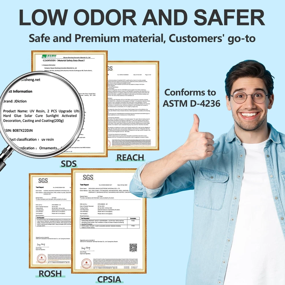 💦【Higher Efficiency】Simple operation, UV resin can be used directly without modulation; Curing time is very short, you will complete your handicrafts after irradiate under UV lamp for 2-4 minutes. 💦【Safe & Premium】Made of premium materials, good transparency and no impurities; has strong stain resistance and anti-yellowing, self-leveling and self-degassing properties can be cured more smoothly(a little odor before curing) 💦【Easy to Store & Use】Comes with 2 bottles of solar cure resin(each 100g), which is more conducive to your storage; Ours is easier to squeeze and use the remaining resin at the bottom of the bottle than round bottles 💦【Wide Application】Can be mixed with glitter, sequins, colorants to create more brilliant colors; Suitable for jewelry making, mobile phone case, craft ornaments, small molds, casting and coating, resin painting, etc.