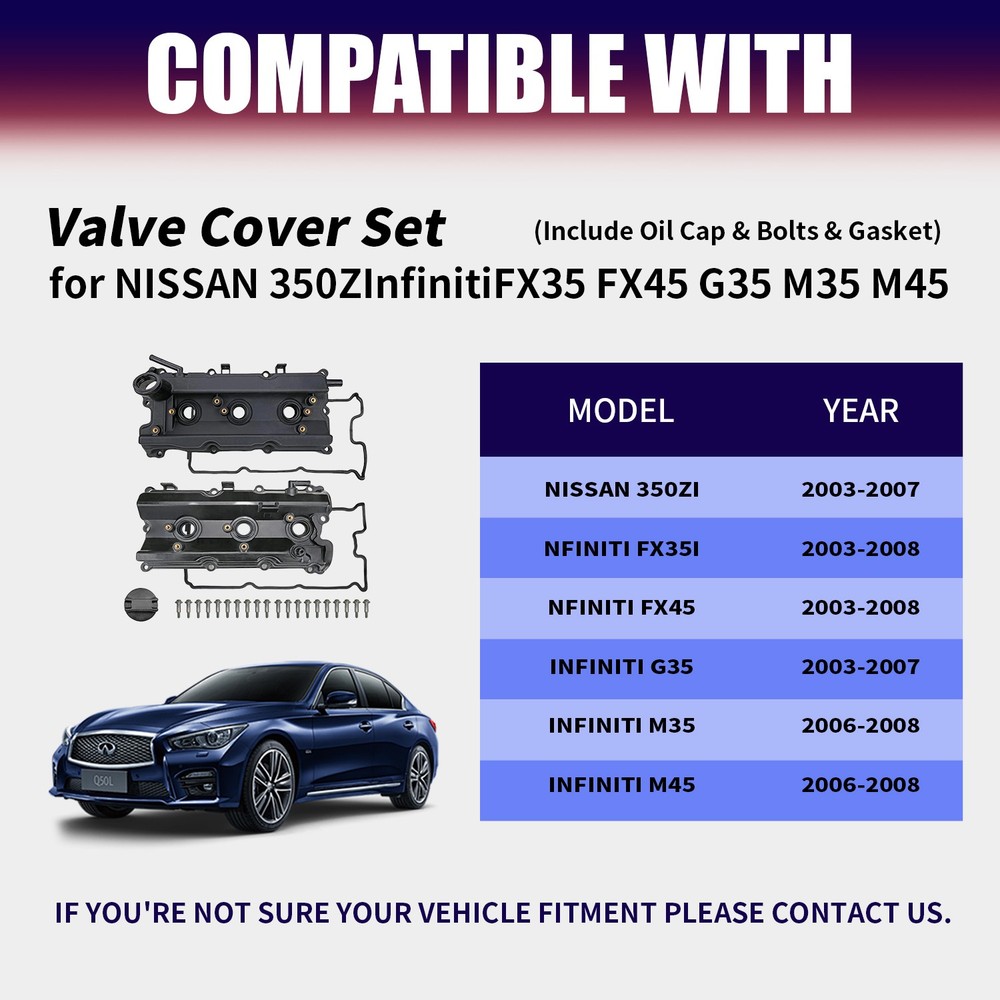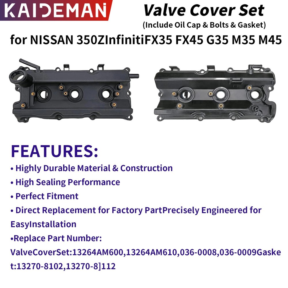 Store Categories Store Categories Car & Truck Engine Thermostats Other 2PCS Valve Cover Set w/ Gasket & Cap for 03-07 Infiniti FX35 G35 M35 Nissan 350Z Product Description ONE YEAR WARRANTY Specification: Brand New Valve Cover OEM: 13264-AM610, 13264AM610, 13264 AM610, 036-0009 Direct replacements Compatible: 2003-2006 NISSAN 350Z 3.5L V6 DOHC 2003-2006 INFINITI G35 3.5L V6 DOHC 2007 INFINITI G35 3.5L V6 DOHC VQ35DE 2003-2008 INFINITI FX35 3.5L V6 DOHC 2006-2008 INFINITI M35 3.5L V6 DOHC 2007-2008 NISSAN 350Z 3.5L V6 DOHC VQ35DE Note: Please check your original part number.This is the best way to confirm the fitment. Product Description: 【 Fitment】: Please confirm compatibility based on your vehicle's year, brand, model, and the OE number of the replacement parts.Compatible with Infiniti ,More information can be found in the pictures or on the details page. 【OE Part No】: 100% brand new and high quality auto parts with OE grade durability for the ultimate comfortable driving experience.Engine valve covers OE No.13264-AM610, 13264AM610, 13264 AM610, 036-0009 【Higher-quality】: The valve cover is made of high-quality material that resists warping, cracking, seepage, and rust, and continuously protects the rocker arm. It firmly seals the gasket set and prevents oil leakage whenever lubricant enters the c ylinder head's oil drain. 【Buy with Confidence】: When your car is leaking oil, smoking in the engine compartment, misfiring, lack of power, or smells like gasoline when the engine is running, you may need a new valve cover. Choosing our valve covers will not only make your car look brand new, but also save you money! 【About KAIDEMAN】: We are a professional automotive component manufacturer with a mature industrial production line. If you encounter any issues with our products, please contact us immediately, and we will respond to you within 24 hours.Choose KAIDEMAN, choose high-quality products. Feedback Shipping Returns Contact us Feedback We hope to give you a positive eBay experience by working hard, and we expect to receive a positive feedback and Detailed Selling Rating (DSR) of 5 Rating in all of the feedback categories from the buyer upon receiving the item . Our eBay account setup auto feedback, so eBay system gives you automatically Positive feedback back after your positive feedback left. If you plan to give us a negative feedback Or open ebay case, please write to us immediately so that we can do our best to resolve your problem. We always put our customers first and your satisfaction is guaranteed. Communication is the best way to solve problem.Thank you for your understanding. Shipping 1.We only ship to the confirmed delivery address provided by eBay. Before you pay, please make sure your address in eBay matches the address you would like us to ship to. 2.eBay does not support changing the delivery address after placing an order, if you find the address is wrong, please cancel the order in time and choose the correct 3.Handling Time: 1~2 business day,We ship our items to USA only(Does NOT include Hawaii, Alaska or Puerto Rico, PO Boxes/APO's).arrives to your door in about 2-5 business days.For PO Box address, please provide complete physical addressTracking number will be updated once shipped out. Returns 1.Please contact us first before returning your item, we’ll solve the problem for you. 2.If a part arrives damaged, or is defective, it is our responsibility to take care of it but it must be reported to us immediately.please contact us with a detailed description and digital picture of defective product as a proof of damage.we will figure out a proper solution for you. Contact us We have been doing our best to provide every customer with the best service and reliable products. If you have any questions or concerns about your eBay order, please feel free to send us an email. Just contact us via the "Seller Questions" link on eBay. We will reply to your message within 24 hours. Trust us, we always strive to solve any problems for our valued customers. Please contact us for resolutions before leaving negative feedback, we strive to providing the greatest service and bringing the highest satisfaction to all of our customers. And our Office is closed on Sunday and public holidays.We apologize for the late reply during the holidays. Copyright © 2023 Dianxiaomi