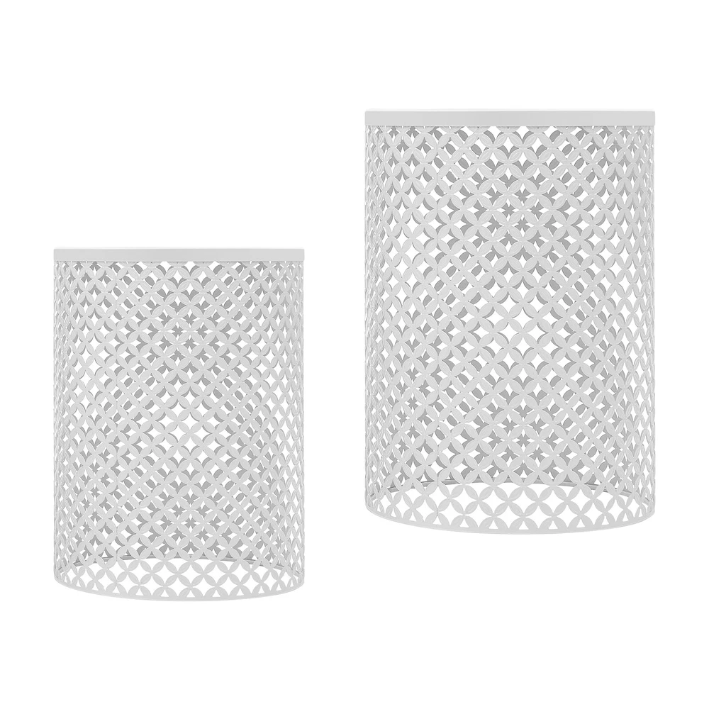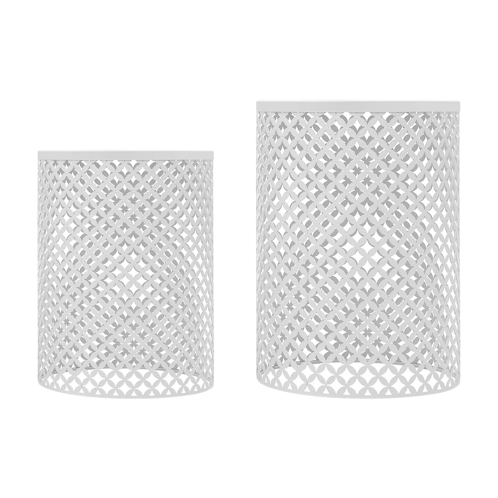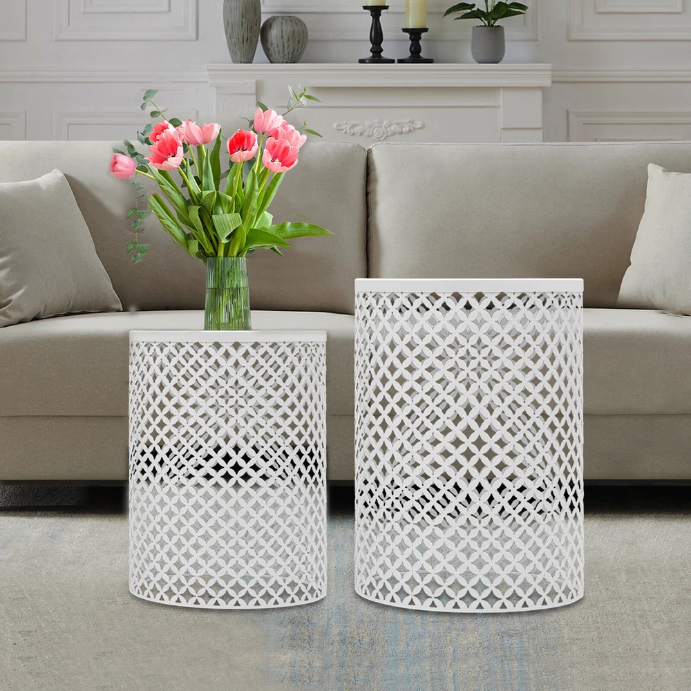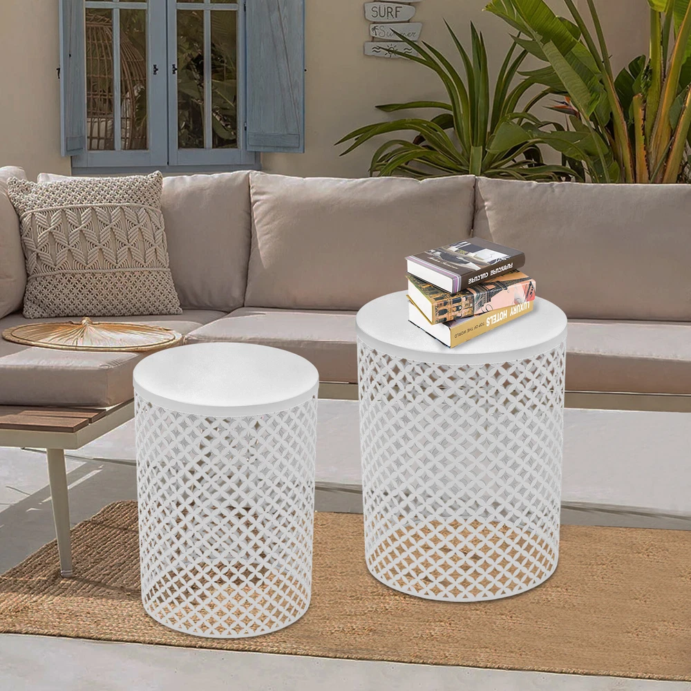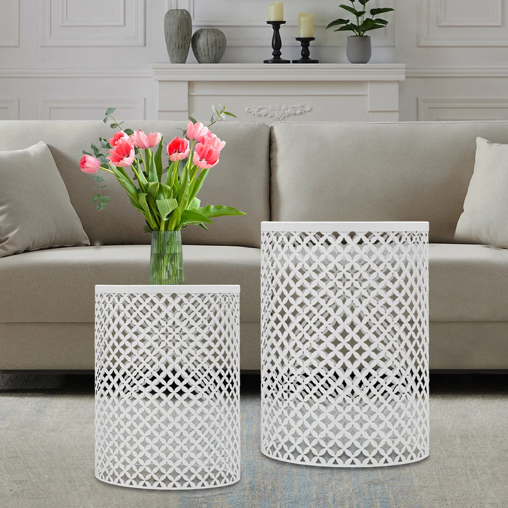 2PCSModern In/Outdoor Side Table Metal Frame Accent Table Round End Table Decor Welcome to my store 2PCSModern In/Outdoor Side Table Metal Frame Accent Table Round End Table Decor Description Made of high-quality iron through the spray molding process, this side table is sturdy and durable to ensure long-term use. The top has a smooth placing surface and the openwork design on the surface is very pleasing to the eye. It is a great table to place in a garden corner or patio, and can also be a good decoration for a patio and home. Key Features Build to Last: It is made of high-quality iron with a spray molding process , sturdy, waterproof, rustproof, and wear-resistant , with high impact and shatter resistance , so it can be placed outdoors all year round, and has a long service life. Strong Load-bearing Capacity : The high-quality iron material and sturdy construction allow this product to withstand large weights( 66.14lbs , 33.07lbs ), allowing you to use it with confidence. Suitable Height : The height of 19.29in and 16.54in are suitable for most people's height, which is ideal for putting books, drinks, snacks, and flowers (not included) on top to be within reach. Set of 2: The product package includes two tables of different sizes, which are enough to meet your usage needs. In addition, you can purchase more to meet your needs. Powerful Function: It can be used not only as a table end/side table, nightstand, decorative table and plant stand in living rooms, bedrooms, balconies and offices, but also as a decorative item in gardens, patios, decks and backyards. Enjoy Cozy Time: You can place this table on your balcony to enjoy a cup of afternoon coffee, or you can place it in your garden to view the flowers you have planted and feel the spring. Space-saving : Its maximum size is only 14.57*19.29in, and you can nest it without taking too much space. You can easily put it on the balcony, by the sofa and so on. In addition, the spacious bottom space can be used for storage, thus saving you even more storage space. Vintage and Elegance: It comes in a classic white color scheme that is simple and warm. The unique openwork floral pattern gives it a classic chic appeal and interesting light and shadow effect that will fit nicely into any modern, vintage and rustic decor. Hassle-free Cleaning: Thanks to its smooth surface and simple structure, you can easily clean it with water and a rag (not included). Details Openwork Pattern: The circumference of the product is designed with with openwork floral patterns, which is not only highly aesthetic but also allows ventilation. Smooth Edges: Its tabletop edges are designed with smooth curves, so it effectively avoids scratching your body and your clothes. Application It is suitable for use in gardens, balconies, bedrooms, living rooms, kitchens, cafes, parks, porches, backyards, pool sides, decks, lawns, taverns, and other places. Specifications Material: Iron Process: Spray Molding Style: Modern Color: White Indoor/Outdoor Usage: Indoor and Outdoor Mount Type: Freestanding Shape: Cylindrical Assembly Required: No Load-bearing Capacity: 30kg/66.14lbs, 15kg/33.07lbs Number of Items: 2 Gross Weight: 3.92kg/8.64lbs Net Weight: 3.4kg/7.94lbs Package Size: 53*43*43cm/20.87*16.93*16.93in Product Size Large(D*H): 37*49cm/14.57*19.29in Medium(D*H): 32*42cm/12.6*16.54in Package Included 2*Side Tables Notes Please double-check that the size fits before ordering. Please note that this product is intended for decorative use in most places and items placed must be within the load-bearing range. Please note that items such as drinks and magazines are not included in this product. Please allow the slight color difference caused by the shooting light and 1-3cm error due to manual measurement, and make sure you do not mind before you order. NOTE NOTE:The bottom of table is not very slip resistant and cannot be used as a garden stool. Payment Delivery details Terms of sales About us Contact us Payment We accept ebay payment 。 Fees such as import duties, taxes are not included in the item price or shipping costs. These charges are the buyer's responsibility. Delivery details Shipping: 2-9 working days to: USA Terms of sales We maintain high standards of excellence and strive for hundred percent customer satisfaction. Feedback is very important to us. We hope that you contact us immediately before you give neutral or negative feedback, so that we can address your concerns. It is impossible to address issues if we do not know about them! About us Your satis faction is our ultimate goal. We work hard to earn your trust and future business. Our certified technicians have tested each item before shipping. The unit comes with 1 year limited warranty on all manufacturing defects. a) If you receive a defective item, you may return it or ask for a discount. Please contact us within 14 days after you receive the package. b) What you returned must be intact and in its original packaging as re? u. Customer is responsible for shipping costs of the returned item. c) We will cover the cost of shipping back t with the shipping rate indicated in the registration page. We will send you a new unit or refund the full payment you paid. Thank you. Contact us Business Hour Business Hour: Monday To Friday: 8:30 AM to 5:00 PM (Beijing China time) Due to time zones, our reply to your questions may not be immediately. But within above working time, we will reply your email within 24 hours. If it's non-workdays, please kindly be patient and wait till Monday. Please contact us with ebay message. Please feel free to contact us if you have any questions. Monday To Friday: 8:30 AM to 5:00 PM (Beijing China time) Due to time zones, our reply to your questions may not be immediately. But within above working time, we will reply your email within 24 hours. If it's non-workdays, please kindly be patient and wait till Monday. Please contact us with ebay message. Please feel free to contact us if you have