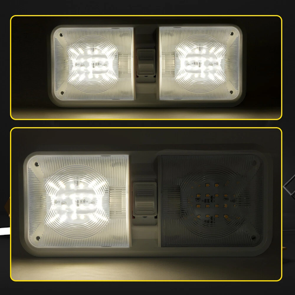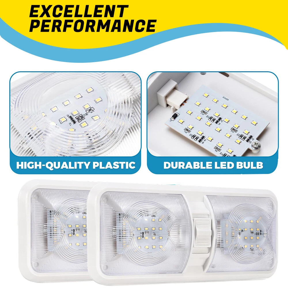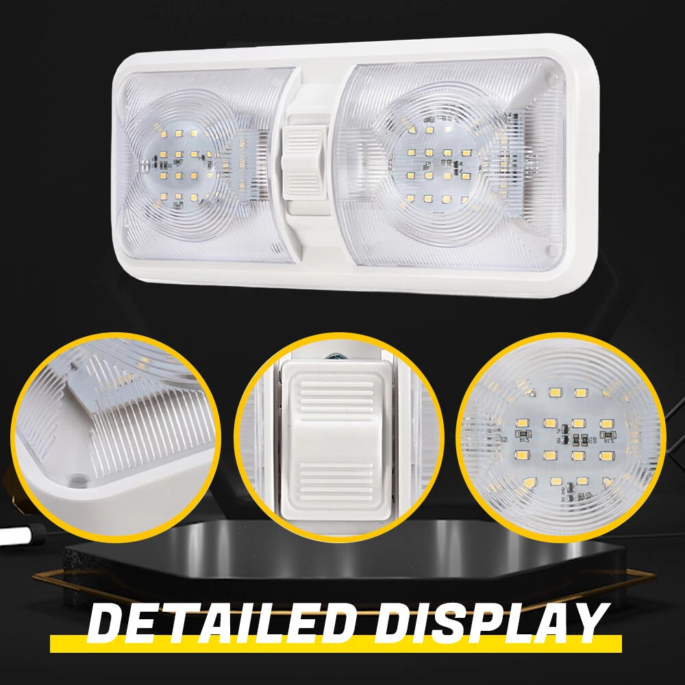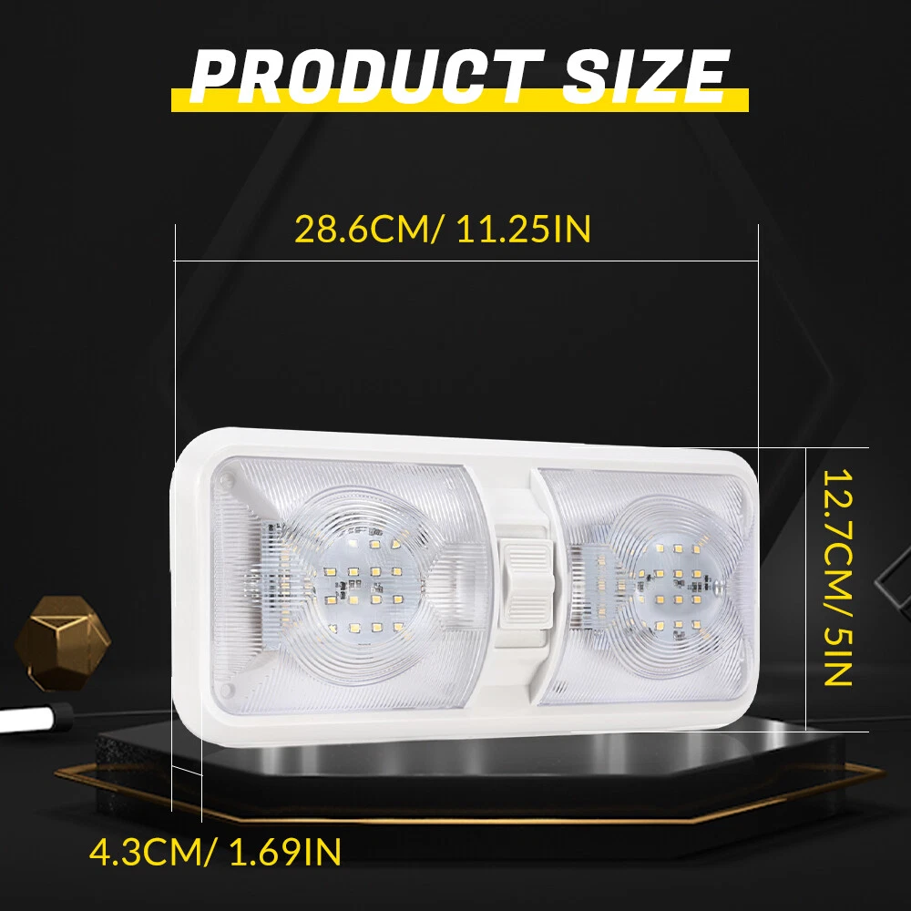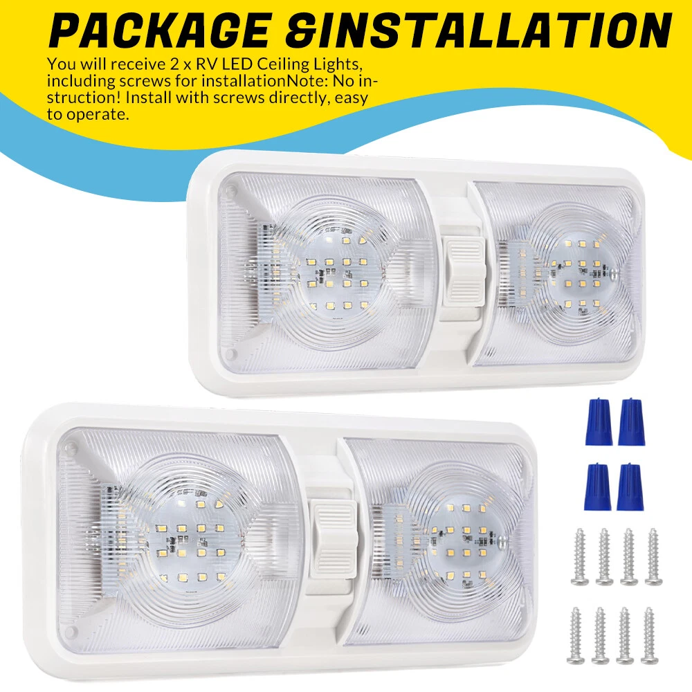 Features: Perfect replacement light for Car/RV/Trailer/Camper/Motorhomes/Marine Boats. It uses high-quality environmentally friendly plastic materials and the most advanced LED lighting technology, which is heat-resistant and corrosion-resistant. Convenient ON/OFF switch design with built-in 2-way switch, allowing you to use one or both sides of the lamp independently. Low power consumption and high energy efficiency, LED bulbs are designed to consume less power than traditional incandescent bulbs. This ensures that your RV's battery or power source is not overtaxed, extending its lifespan. Easy to install. It has 2 non-polarized two wires and comes with nuts and screws to hold it directly in place, suitable for smooth surface mounting. Specification: Material:Plastic Color: Clear Lens Voltage: 12V LED chip: 2835 Power: 8.5W Working life: 50000h Dc voltage: 0.71A Operating temperature: -20-60℃ Number of lamp beads: 48 Product color temperature: white light 4000~4500k Built in 3-way switch (to use one or both sides of light fixture) Fit for: Applications include 12 Volts DC, recreational vehicles Package Includes: 2 X Double Dome Lights (Mounting hardware Included)