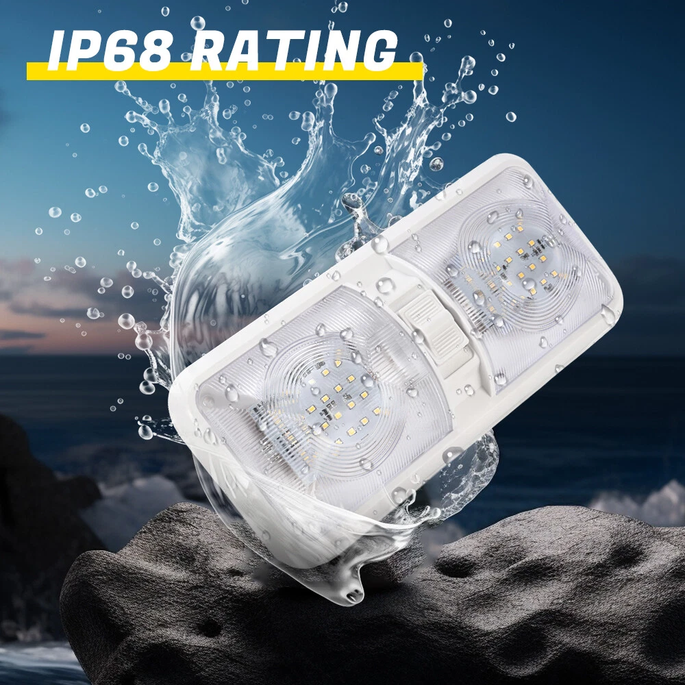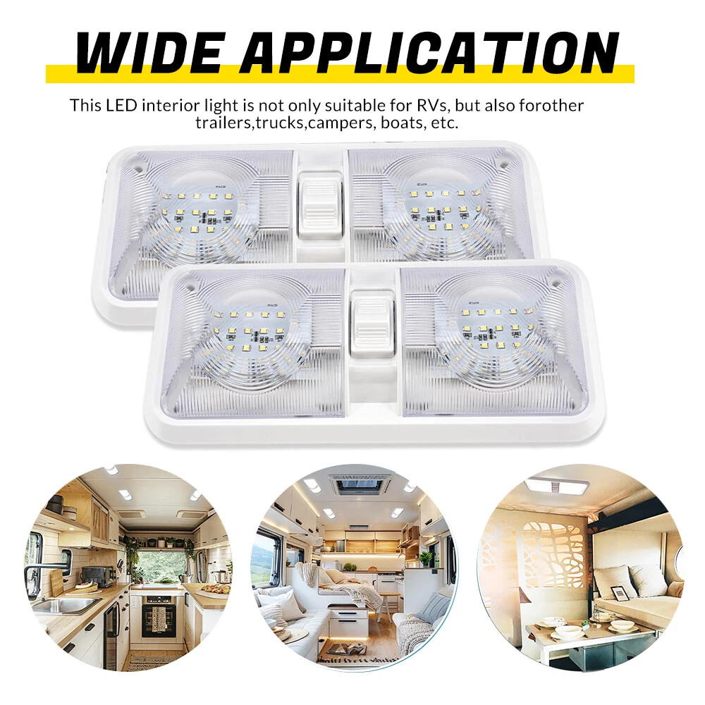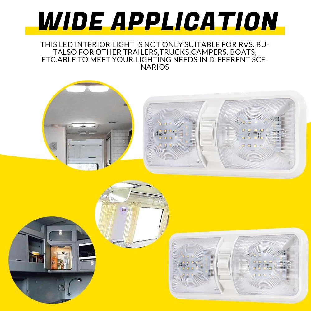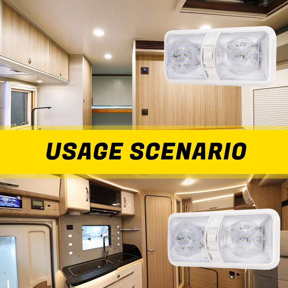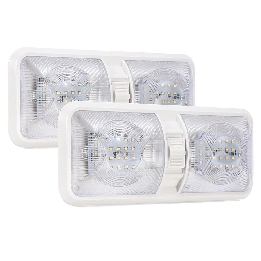 Features: Perfect replacement light for Car/RV/Trailer/Camper/Motorhomes/Marine Boats. It uses high-quality environmentally friendly plastic materials and the most advanced LED lighting technology, which is heat-resistant and corrosion-resistant. Convenient ON/OFF switch design with built-in 2-way switch, allowing you to use one or both sides of the lamp independently. Low power consumption and high energy efficiency, LED bulbs are designed to consume less power than traditional incandescent bulbs. This ensures that your RV's battery or power source is not overtaxed, extending its lifespan. Easy to install. It has 2 non-polarized two wires and comes with nuts and screws to hold it directly in place, suitable for smooth surface mounting. Specification: Material:Plastic Color: Clear Lens Voltage: 12V LED chip: 2835 Power: 8.5W Working life: 50000h Dc voltage: 0.71A Operating temperature: -20-60℃ Number of lamp beads: 48 Product color temperature: white light 4000~4500k Built in 3-way switch (to use one or both sides of light fixture) Fit for: Applications include 12 Volts DC, recreational vehicles Package Includes: 2 X Double Dome Lights (Mounting hardware Included)