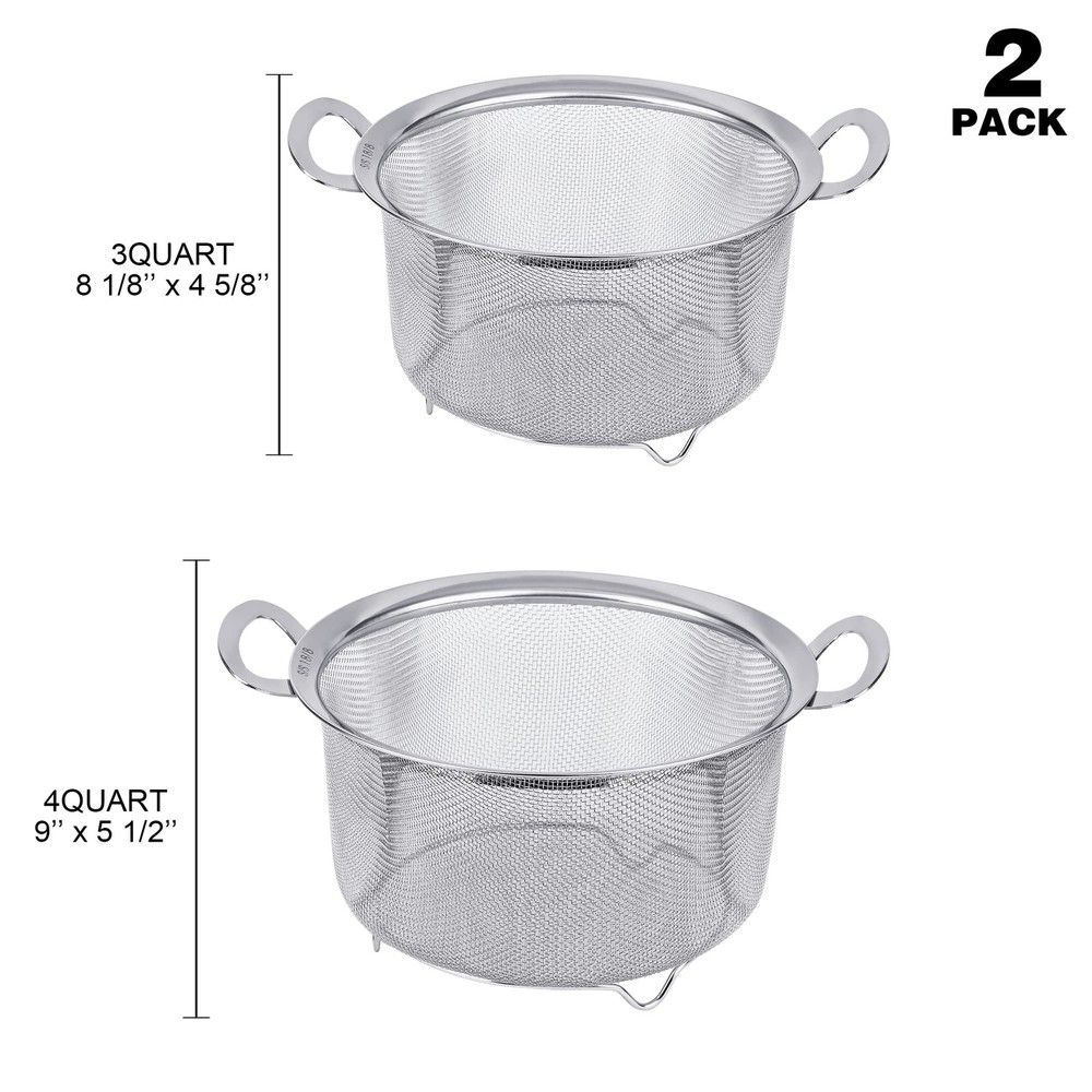 Package included: 2 Pack Different Sizes Strainer, perfect for straining, sieving, sifting, filtering, rinsing, steaming, frying and cooking tasks. Dimensions: 4-Quart: 9-1/4" diameter, 5-3/8" high and is 11-5/8" from handle to handle 3-Quart: 8-1/4" diameter, 4-3/4" high and is 10-1/2" from handle to handle Is your current food strainer rusty and hard to clean? Our fantastic strainer is made of 100% stainless steel for easy cleaning. We used only the highest quality stainless steel available to ensure hygienic water draining. Simply set it in the dishwasher for a fast, hygienic, and perfect cleaning. Even without a dishwasher, this colander is so easy to clean—just put it under running water and it will be as good a new, ready to be used again. This colander won’t rust, bend, or break! Food Grade Stainless Steel 18/8 Construction: Our kitchen strainer is made of first class Stainless Steel 18/8 that is BPA free, Lead and Cadmium free. It is rust free and will never affect the taste of your food! Sturdy: Our strainers feature a sturdy outer mirror finished wide rimmed framework design on the top and 3 resting feet on the bottom. Our premium wide handles are securely attached on the rim. These sieves are built to last for a of repeated daily use. Two Different Sizes: 4-Quart (9 1/4" x 5 3/8") and 3-Quart (8 1/4" x 4 3/4"). Convenient sizes for all your cooking, straining and preparation needs. They're perfect for sifting and straining wet or dry ingredients. Nest the colanders together for space saving storage. Versatile: Our mesh strainers are perfect for draining and straining all kinds of foods, wet or dry ingredients, from pasta to produce. Sift flour, sugar and rice. Use for food preparation like rinsing and washing fruits, vegetables, grains and pastas. Use in a pot to steam vegetables, fry food like french fries or to cook pasta. Easy Cleaning: Simply set colander in the dishwasher for a fast, hygienic, and perfect cleaning. Even without a dishwasher, this colander is so easy to clean—just put it under running water and it will be as good a new, ready to be used again.