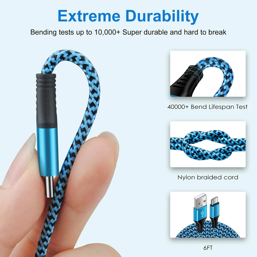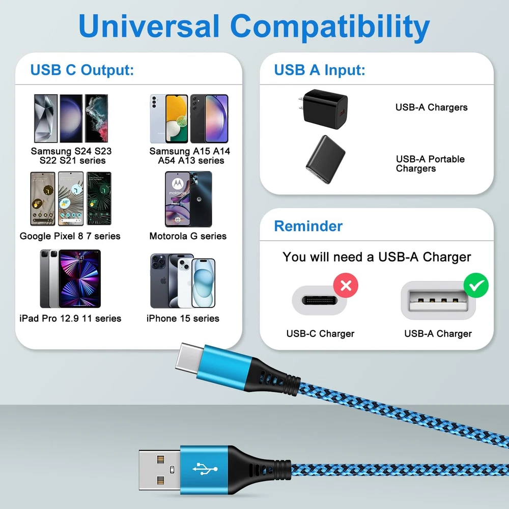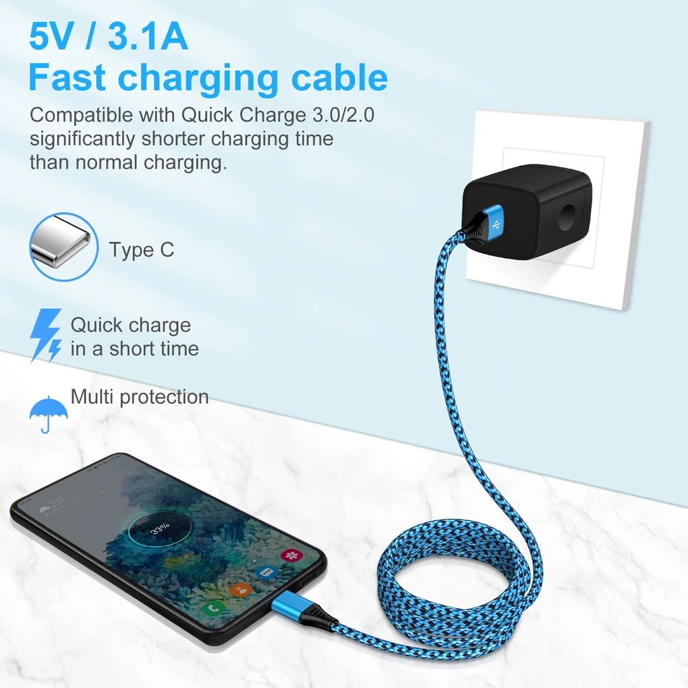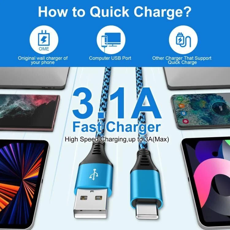 2Pack 6FT S24 Ultra Samsung Android Charger Cord USB C to Type A Fast Charging Cable 3.1A Phone Power Cord for Samsung Galaxy A15 A55 A35 A54 A14 5G S24 S23 S22 S21 FE, iPhone 15 Pro Max 15 Plus 15 3.1A Fast Charging USB-A to USB-C Cable, 2 Pack 6FT Long Nylon Braided Type A to C C Samsung A15 Charger Cable Widely Compatibility iPhone 15/15 Plus/15 Pro/15 Pro Max Samsung Galaxy S24 Ultra S24+ S24,S23 Ultra S23+ S23 FE S23,S22 Ultra S22+ S22,S21 Ultra S21+ S21 FE S21,S20 series S10 S9 S8 Samsung Galaxy A55 A35 A15 5G, A25 A54 A14 A24 A34 A13 A53 A33 A23 A12 A32 A52 A51 A70 A71 A72 A80 A90 Samsung Galaxy Z Fold 5 4 3 2, Z Flip 5 4 3 2, Note 20 10 9 series Google Pixel 8 Pro,8,7 Pro,7,7a,6 Pro,6 Motorola Edge 2024 2023 2022,Edge+,Razr 2024 2023 2022,G Power,G Stylus,G Fast,G Pure,G Play USB Type C Charger Cables: Length: 6 Feet Material: Nylon Braided Cord Max Output: 5V 3.1 A(Max) Data transfer: USB 2.0 480Mbps Color: Blue Purple 40000+ Test Plug The samsung galaxy s24 cable can offer 40000+ plugging and bending tast. Fast Charging and Safe Fast charge your device with 3.1A, built-in 56K? resistor incredible safety, protect your devices and charging adapters from damage. Sturdy Premium Nylon Braided Strong nylon fiber can be use for long time. The most flexible, powerful and durable braided material, makes tensile force increased by 200%. Long 6 FT Samsung S24 Charging Cable 10ft super long usb a to usb c samsung galaxy s24 cable make you charging free anywhere. Fast Charging Warm Tips: 1.This is a USB-A to USB-C cable, NOT USB-C to USB-C cable. 2.This cord WILL NOT provide you with fast charging alone, you will need a power wall charger rated for fast charging and a phone capable of the same. Package includes: 2 Pack 6 Foot Type C Fast Charging Cable 3.1A Fast Charge & Data Transfer: USB to USB C samsung galaxy a15 5g cable supports 3.1A fast charge and 480Mbps sync fast data transfer. Standard 56KΩ pull-up resistor provides a safer charging current, it can prolong the usage life. Widely Compatibility: 6ft USB Type-C cables fast charging compatible with iPhone 15 Pro Max,15 Pro,15 Plus,15.Samsung Galaxy S24 Ultra S24+ S24,A55 A35 S23 Ultra S23+ S23 FE S23,S22 Ultra S22+ S22,S21 Ultra S21+ S21 FE S21,S20 series S10 S9 S8, A15 A25 A54 A14 A24 A34 A13 A53 A33 A23 A12 A32 A52 A51 A70 A71 A72 A80 A90,Z Fold 5 4 3 2, Z Flip 5 4 3 2. Google Pixel 8 Pro,8,7 Pro,7,7a,6 Pro,6.Motorola Edge 2024 2023 2022,Edge+,Razr 2024 2023 2022,G Power,G Stylus,G Fast,G Pure,G Play. More Durable and Sturdy: Durable tangle-free nylon braided and reinforced with design, USB-C samsung galaxy s24 charger cable makes tensile force increased by 200%, can bear 40000+ bending test. Premium Aluminum housing makes the cable more durable. The adherence to USB-C specifications ensures 2.4A~3.1A safe charging (Pullup resistor - 56k) and safety of your devices. 6 Feet Extra Long USB-C Cable: With 6 Foot extra long usb c samsung a15 charging cords, you can charge your devices from the hard-reach places, and use them freely and walk around, keep you far away from the socket. With 3 different colors usb type c galaxy a15 charger cable, you can easily find out and distinguish with your family's type c fast samsung galaxy s24 charging cable. What You Get: 2 Pack 6 FT Type C to A Android Phone Charger Cables. If you have any questions about our samsung galaxy s24 cable, please feel free to contact us, we will resolve your issue within 24 hours. Shipping from the USA All of our products are shipped from the USA, ensuring quick delivery to your destination. Payment We offer the following payment methods: PayPal, credit card, bank transfer, and eBay's secure payment system. Free Shipping & Free Returns Shipping within the USA is FREE. Additionally, any return is absolutely free for you. Risk-Free Purchase You have the option to return an item within 30 days without any justification. We cover the return shipping costs! Fast Shipping We ship immediately upon receipt of payment. Generally, the package is delivered within 2-3 days in the USA. If it takes longer, we will contact you. Quality and Costs Made in Europe, USA, China No customs fees or additional charges Total satisfaction guarantee Invoice with declared VAT available upon request in .pdf format Feedback Your feedback is very important to us. After you pay for your purchase, you will automatically receive positive feedback from us.