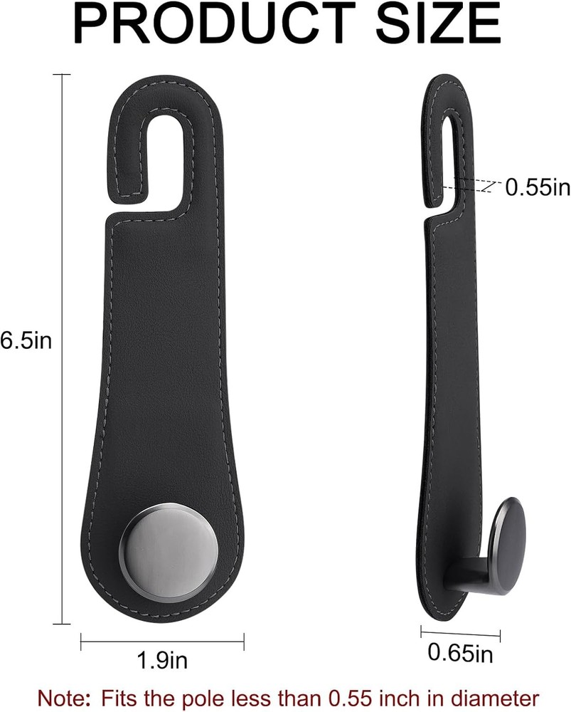 About this item MATCH CAR'S INTERIOR: Made of soft leather and zinc alloy hook, these car headrest hooks are durable and stylish. They look luxurious and blend seamlessly with the car interior. The car hanger can hold up to 44 lb, which meets the daily use demand in your vehicle. FITS SEAT CURVATURE: With soft leather, the car hook fits perfectly to the curvature of the seat and is suitable for most cars, SUVs, and trucks (installation size: 0.3-0.5 inch in diameter of the headrest bar). It's an ideal gift for family and friends! 360° ROTATION: The car bag hook can rotate 360 degrees on the headrest for both front and back use. You can also hide the hook under the headrest bar when not in use, which is space-saving and perfectly compatible with your car. MULTIPURPOSE: These car headrest hooks can hold handbags, shopping bags, umbrellas, water bottles, clothes, hats, and other items. They provide extra storage space in your car, keeping your belongings organized and easily accessible. EASY TO INSTALL: You can hang the car seat storage hook directly onto the headrest pole, making it a convenient and hassle-free addition to your car. The package includes 2 pack of purse hangers. Dimensions: 6.61 x 2.01 x 1.06 inches.