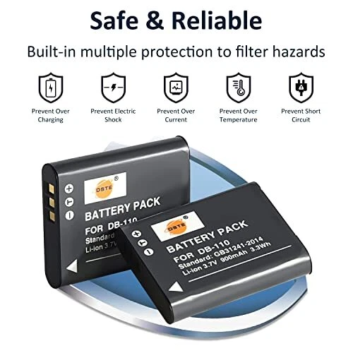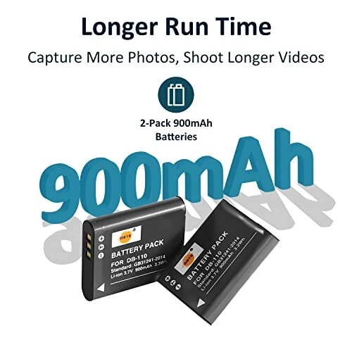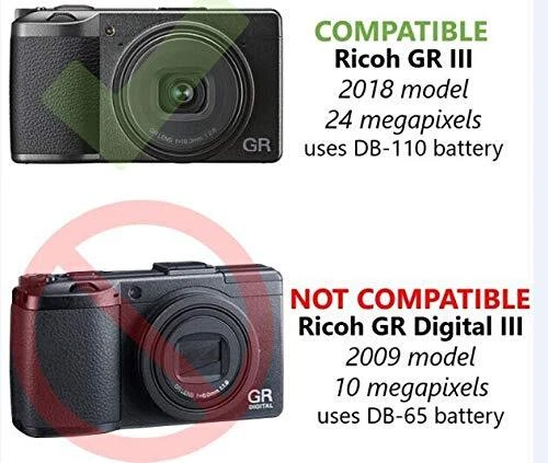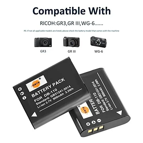 Package includes: - DB-110 Battery x2 with: - Ricoh GR III - Ricoh WG-6 - Ricoh G900 - Ricoh G900SE Notice: do not Ricoh GR Digital III Battery Type : Li-ion Battery Capacity : 3.3Wh/ 900mAh Output Voltage : DC 4.2V (max)/ DC 3.6V (mean) Info Function for Life Indication Notice: Ricoh GR III, do not Ricoh GR Digital III