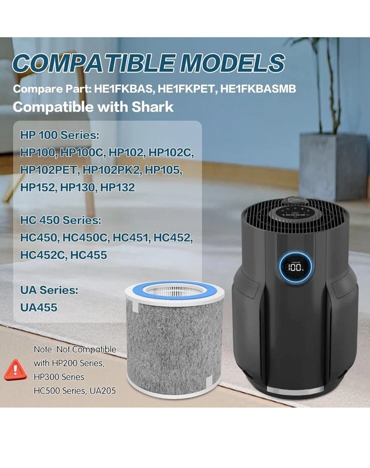 Product details Top highlights Brand VIEWALL Material True HEPA, Carbon Product Dimensions 7.56"L x 7.3"W x 7.56"Th Compatible Devices Fits for Shark HC450, HC450C, HC451, HC452, HC452C, HC455, HP100, HP100C, HP102, HP102C, HP102PET, HP105, UA455, HP152, HP130, HP132Fits for Shark HC450, HC450C, HC451, HC452, HC452C, HC455, HP100, HP100C, HP102, HP102C,… See more Number of Items 2 Manufacturer VIEWALL COMPATIBILITY: The premium True HEPA replacement filter is fully compatible with Shark HC450, HC450C, HC451, HC452, HC452C, HC455, HP100, HP100C, HP102, HP102C, HP102PET, HP102PK2, HP102PETPR, HP105, UA455, UA505, HP152, HP130, HP132 air cleaner purifier to maintain its peak performance. Compare parts HE1FKBASMB, HE1FKBAS and HE1FKPET. ATTENTION: NOT FIT for HP200 Series: HP201, HP202, HP300 Series: HP302, HP301, HC500 Series: HC501, HC502 and UA205. Please check your purifier model before making an order. 3-STAGE HIGH EFFICIENCY FILTRATION: Our HP100 replacement filter is designed in 3-in-1 true HEPA filtration system. including fine pre-filter, effective sticky carbon filter, and true HEPA filter. EXCELLENT FILTRATION: HP152 replacement filter can capture 99.98% of particles to 0.1 microns such as hair, dander, and lint, and adsorbs smoke, cooking smells, pet odors, and VOCs. We aim to create an easy breathing and comfortable home environment for those who want to breathe fresh air and meet the demands of their daily life. HIGH QUALITY MATERIALS: Our HC450 replacement filters derived from strict requirements for raw materials and processing of products keep your purifier at its best working condition and capacity. For optimum performance, replacing the filter every 6-12 months is recommended. (depending upon your usage and environment). CUSTOMER SERVICE: Package includes 2 Pack HP100/HC450 series replacement filters. Please feel free to contact VIEWALL Customer Service Team for any support needed. Note: After replacing the filter with a new one, you have to press and hold the filter button for a few seconds until it resets, and then it will go back to 100%.