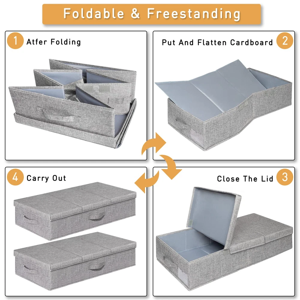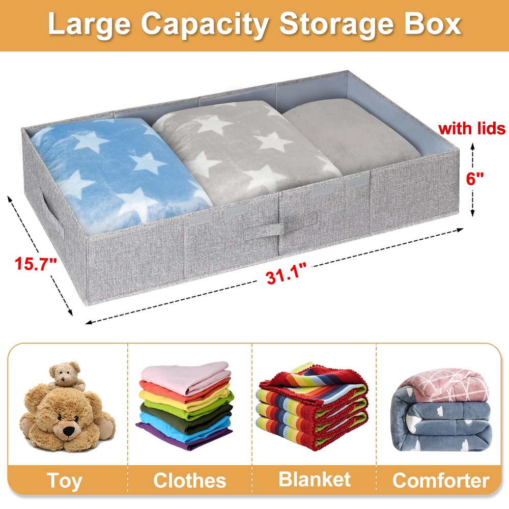LARGE CAPACITY UNDERBED STORAGE: Each storage bin measures 31.1*15.7*6inch, which fits comfortably under a bed or up on a closet, these under bed storage bins come with a lid that can be slid off in three parts easily to view the contents. Use in the attic, basement, closet, coatroom, bedroom, baby nursery, under cribs and in dorms to protect and seasonal and everyday items, holiday decorations, and memorabilia. Great for use as flat storage bins or underbed storage drawers MULTIPURPOSE STORAGE: Large, sturdy containers for organizing are perfectly sized to slide right under the bed. The under bed organizer is perfect for use as under bed shoe storage organizer, under the bed storage bins, under bed clothes storage, under bed toy storage, under the bed drawers stackable storage bins with lids, under crib storagen STURDY STRUCTURE & STURDY HANDLES: 3 Reinforced sewn-in handles make it easy maneuverability and convenient for you to carry and pull out from under the bed; handy bins make excellent blanket organizers and storage; Lasts longer than underbed storage containers plastic; Keep your bedroom neat and tidy with storage bins with lids that fit your room's existing decor and theme UNDER BED DRAWERS: Comes with of these large-sized under bed storage organizer boxes; Each of these underbed drawers folds up and assembles easily and can be moved instantly, making them incredibly versatile; Transparent Label pockets with a blank card for your remark; With these under the bed storage bins, you can make any room look more put-together and clean VERSATILITY ORGANIZERS FOR BEDROOM: Collapsible, lightweight, and compact, these foldable organizer containers either provide a great storage place, or fold flat for easy storage and portability; Fast assembly gives you instant drawers for under bed without the need for costly construction; A great gift for her/him, gift for women/men, great college essentials storage, college dorm room accessories for college students